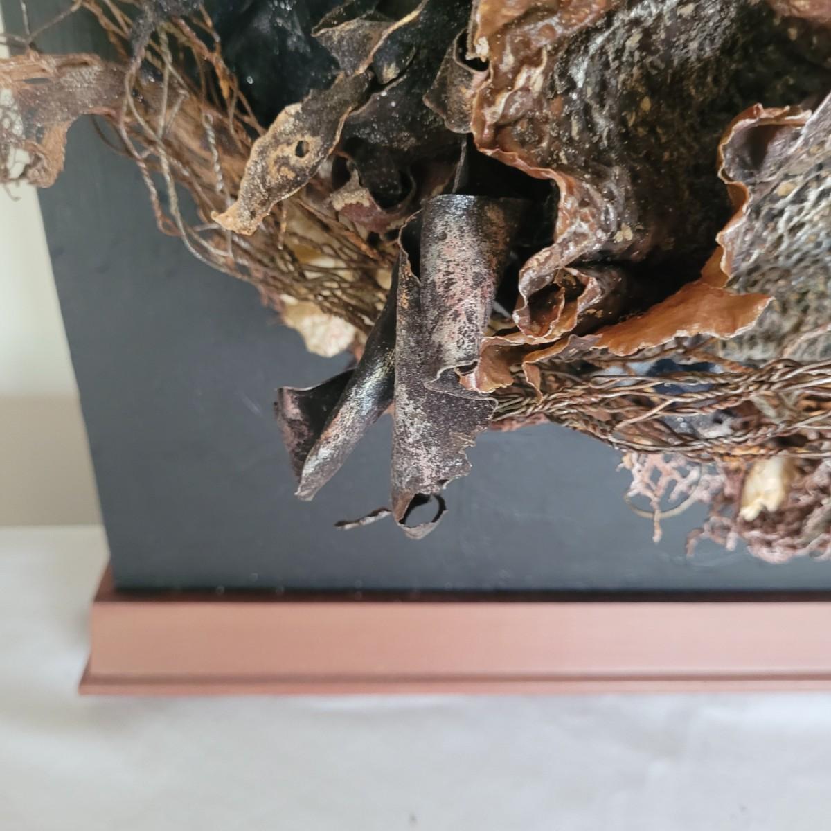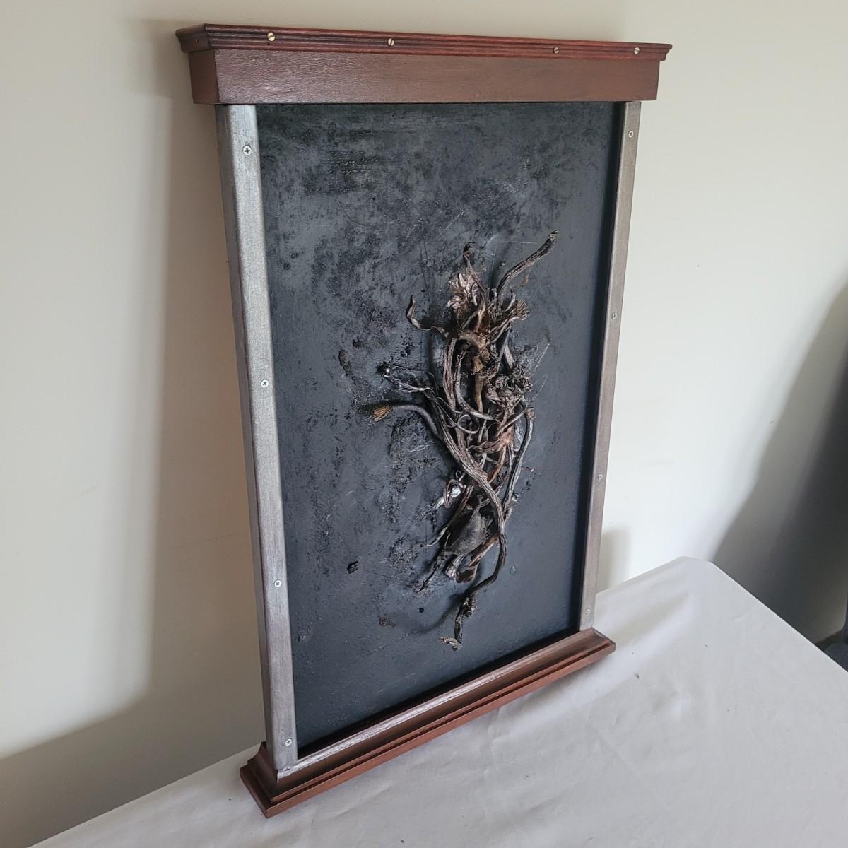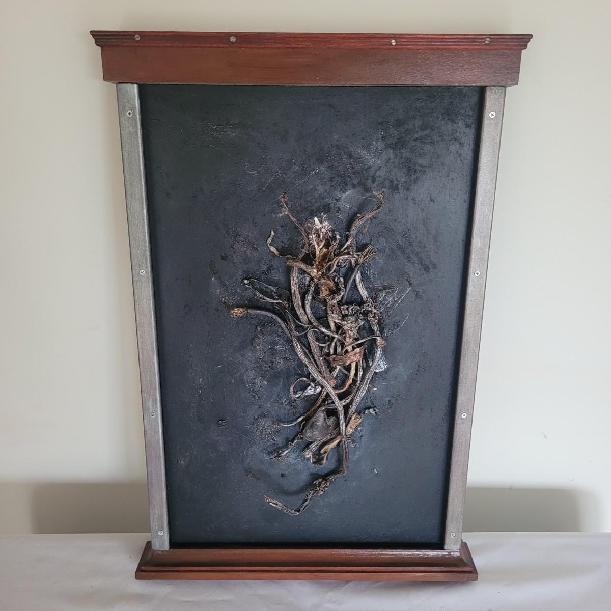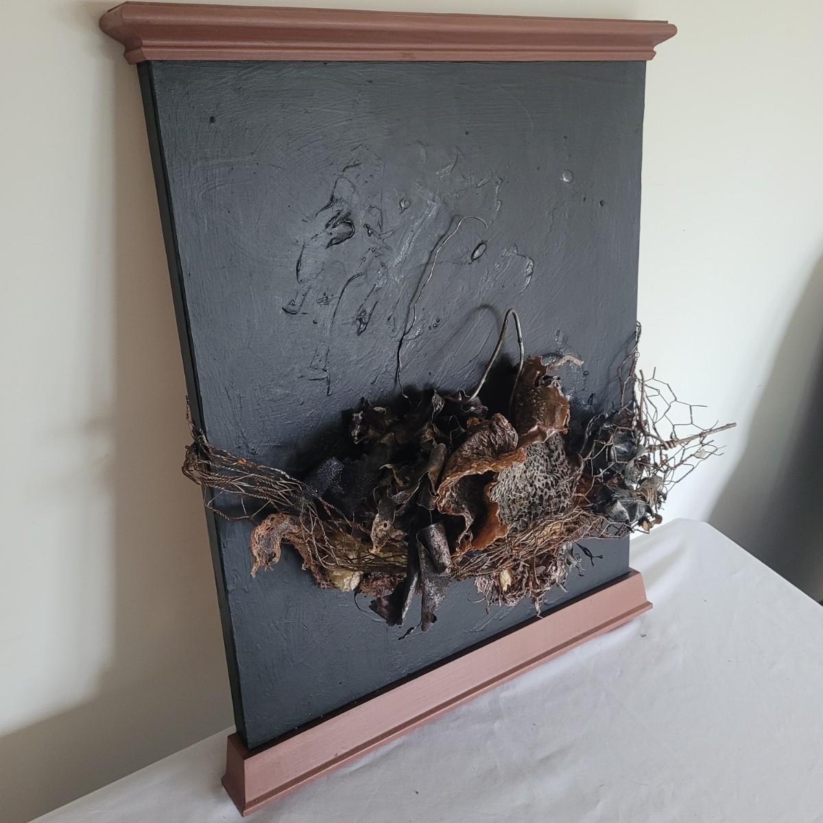 This lot includes two original pieces of wall art titled "Seaweed" by Asheville, NC local artist Joyce Blunk. The pieces are mixed media, containing elements of woodwork, sculpture, and other natural materials. They depict dried seaweed and other organic material mounted on wood. One of the pieces is signed, titled, and dated by the artist on the backside. The larger one measures 17" x 22"H.