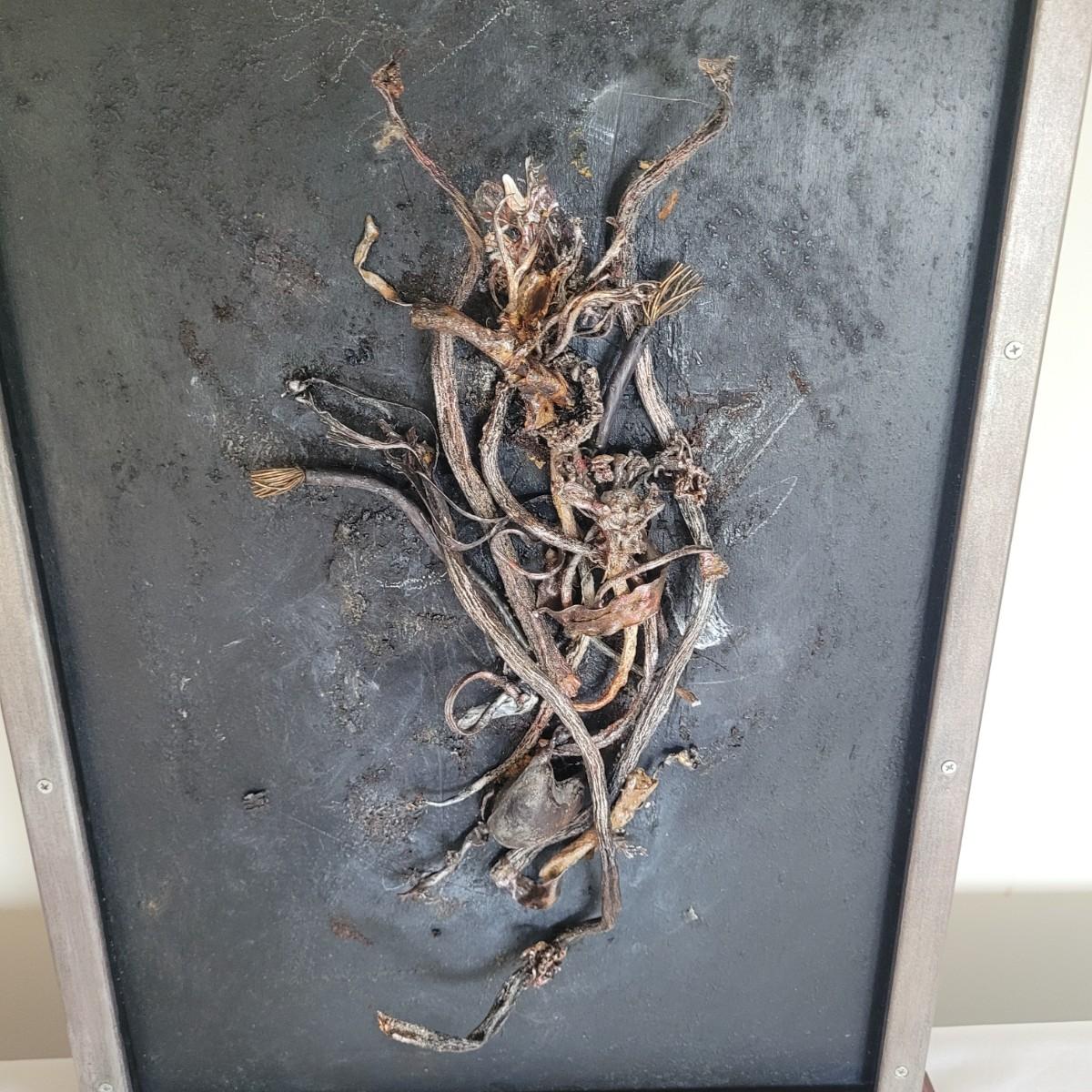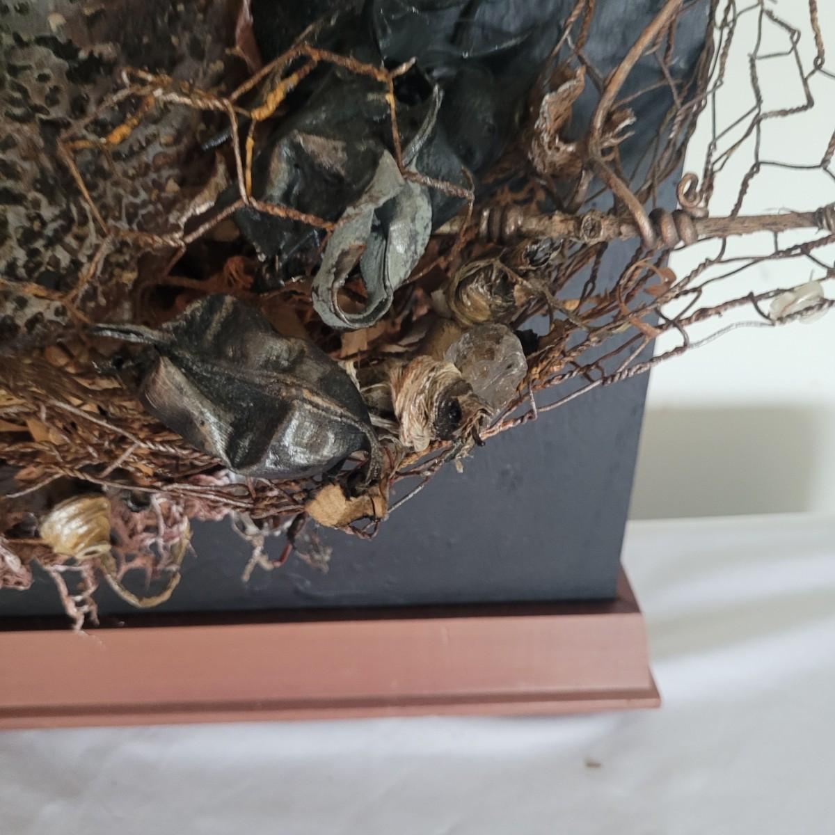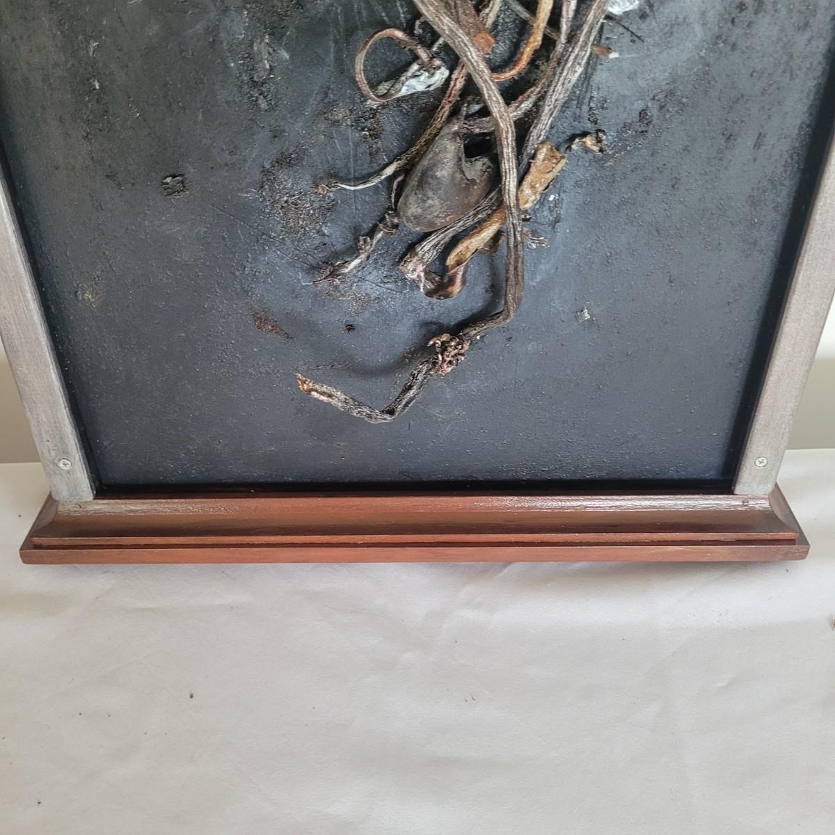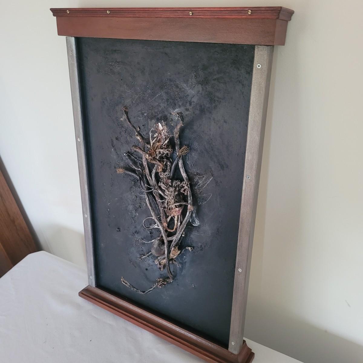 This lot includes two original pieces of wall art titled "Seaweed" by Asheville, NC local artist Joyce Blunk. The pieces are mixed media, containing elements of woodwork, sculpture, and other natural materials. They depict dried seaweed and other organic material mounted on wood. One of the pieces is signed, titled, and dated by the artist on the backside. The larger one measures 17" x 22"H.