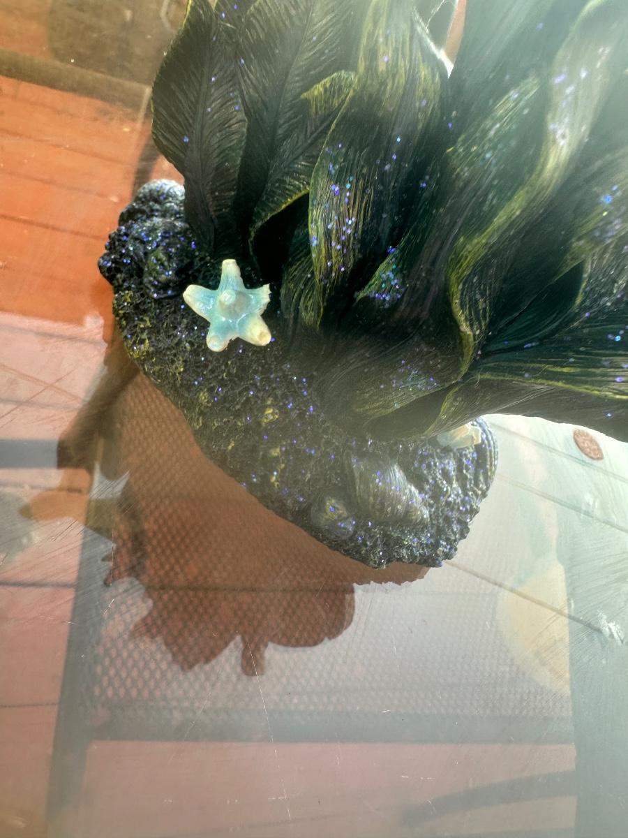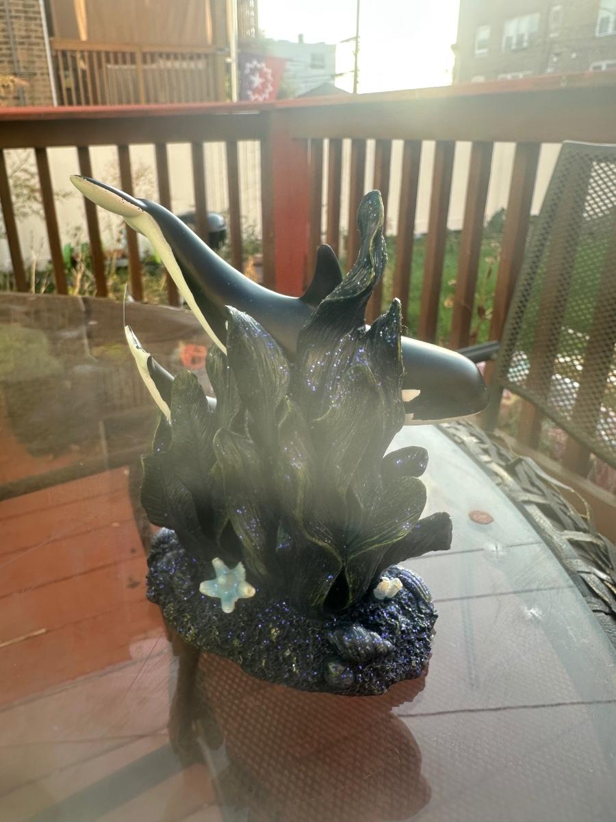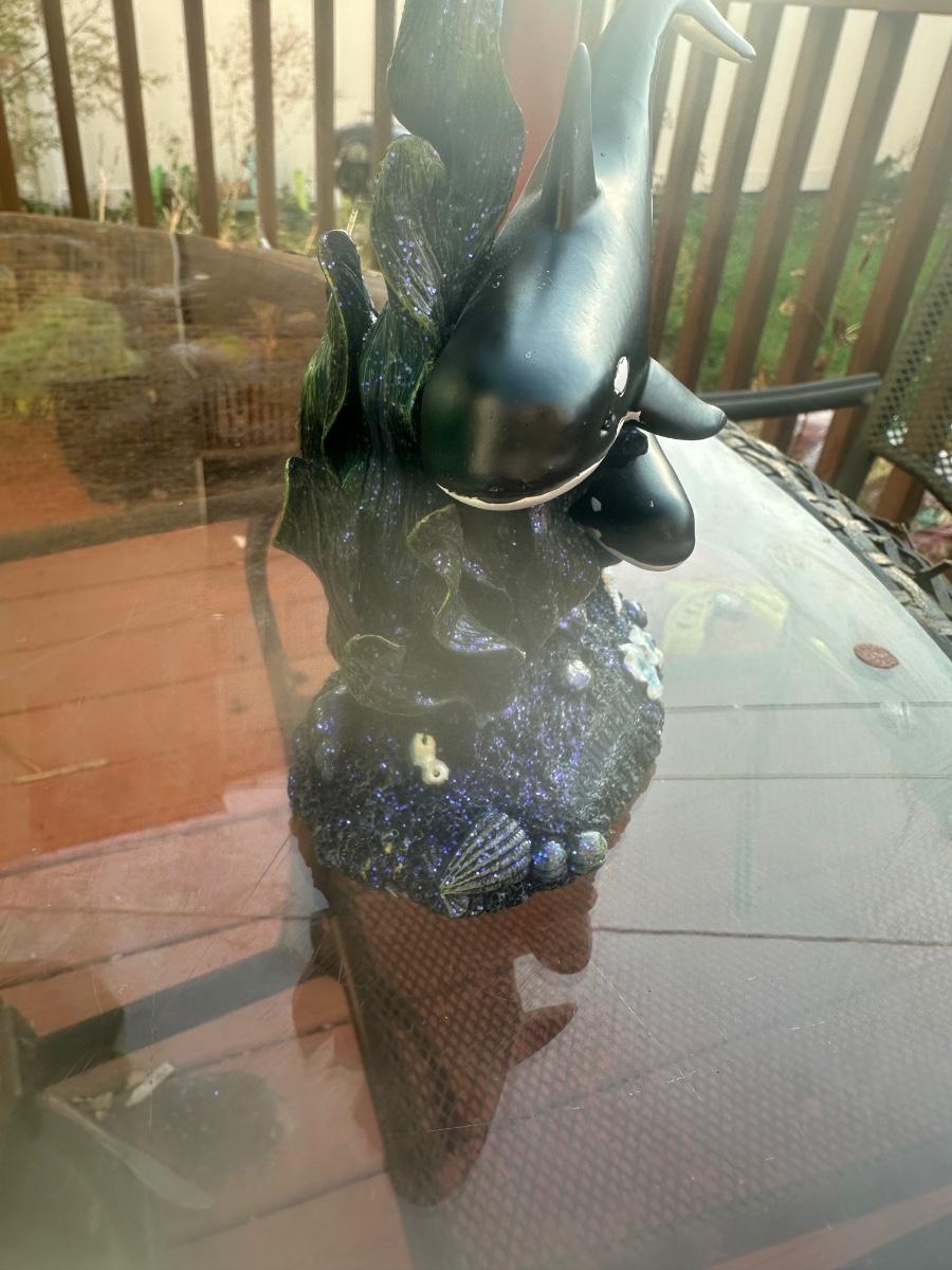 SEAWORLD Double Whale Resin Statue Figurine Orca Killer Whale Shamu. This figurine is about 6.25 inches high and 5 inches wide. It features a mother and baby orca swimming is a bed of sea grass. The figurine is black with blue glitter embedded in the resin and a scattering of seashells around the base.
