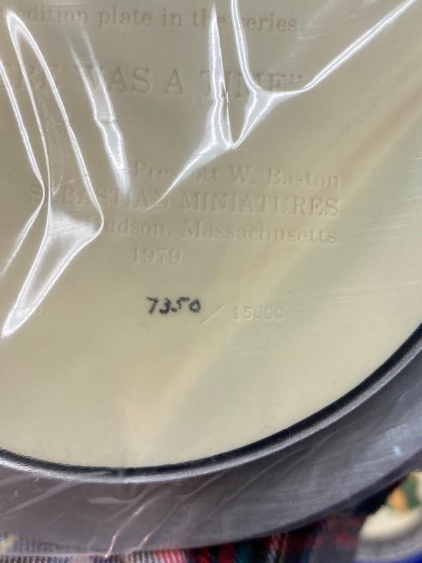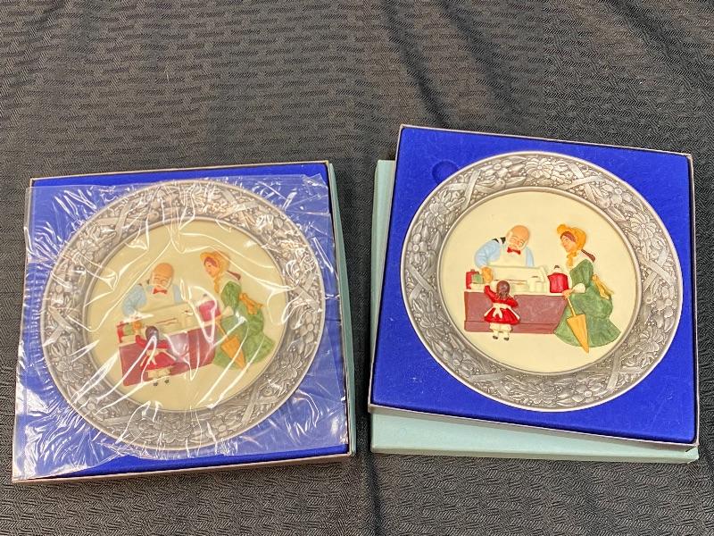 Pair of Sebastian Miniatures painted pewter plates. The outer rim is pewter while the painted inside is a resin or plastic. Matching plates. Limited edition, each plate is numbered. Boxed.