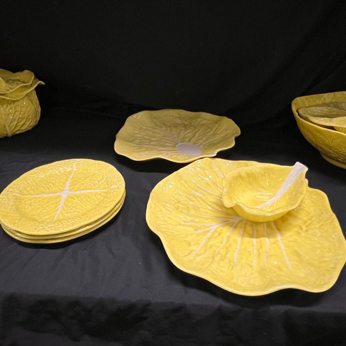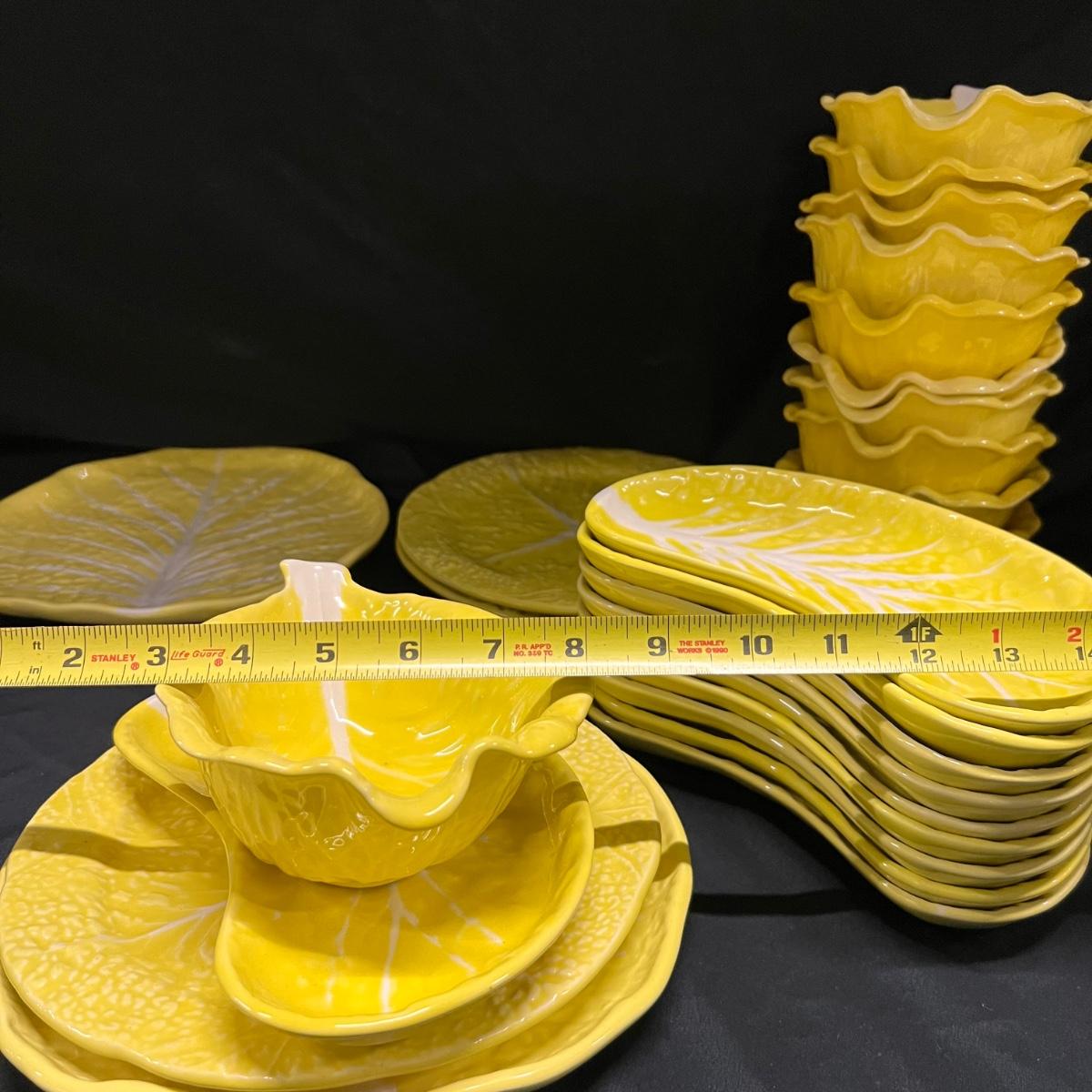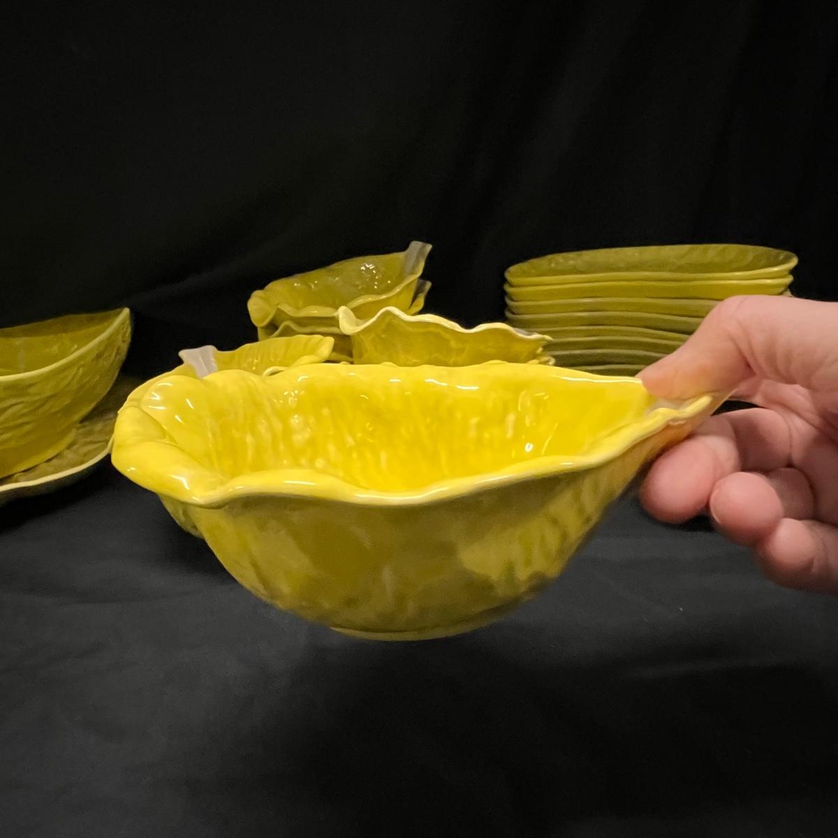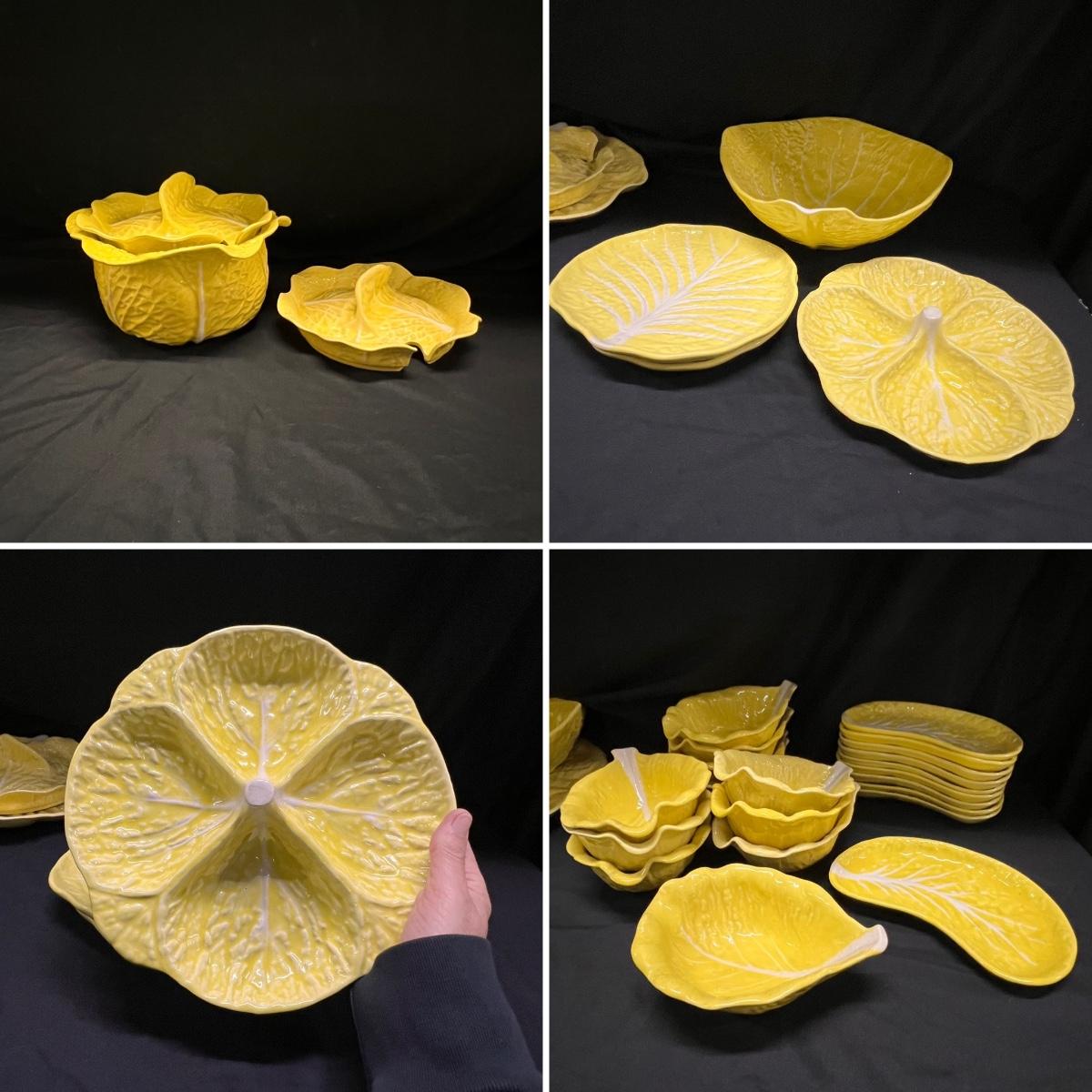 The majority of this Secla set are yellow with four side plates and a bowl that are green. One green plate has a chip. Yellow set (approximately 34 pieces) includes a large lidded tureen with an extra Lid (note the bowl has a chip on the underside), plus bowls, side plates, chip and dip plate and various bowls and platters. See pics for full inventory.