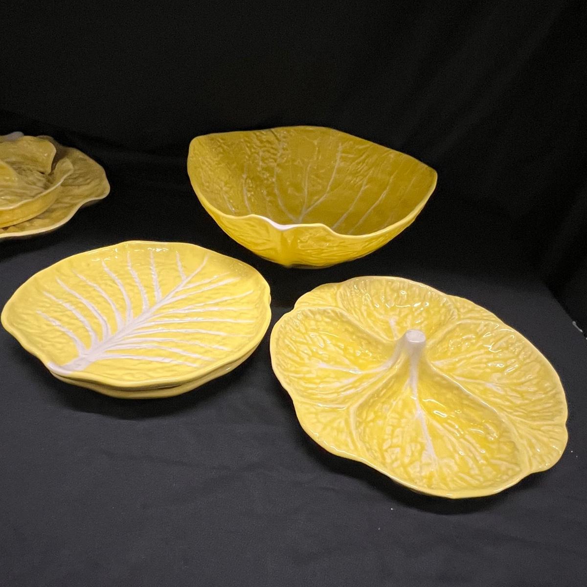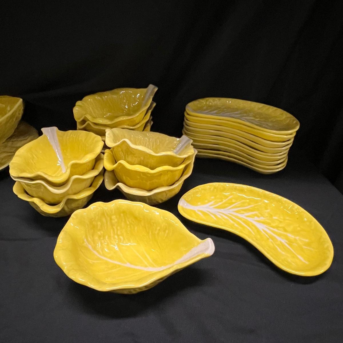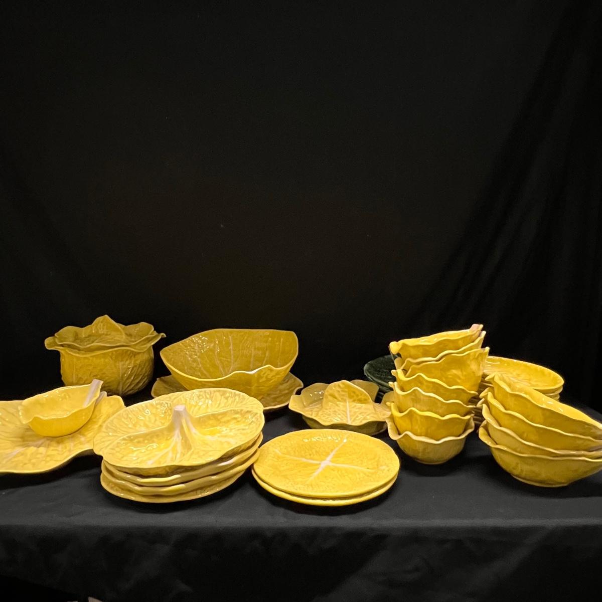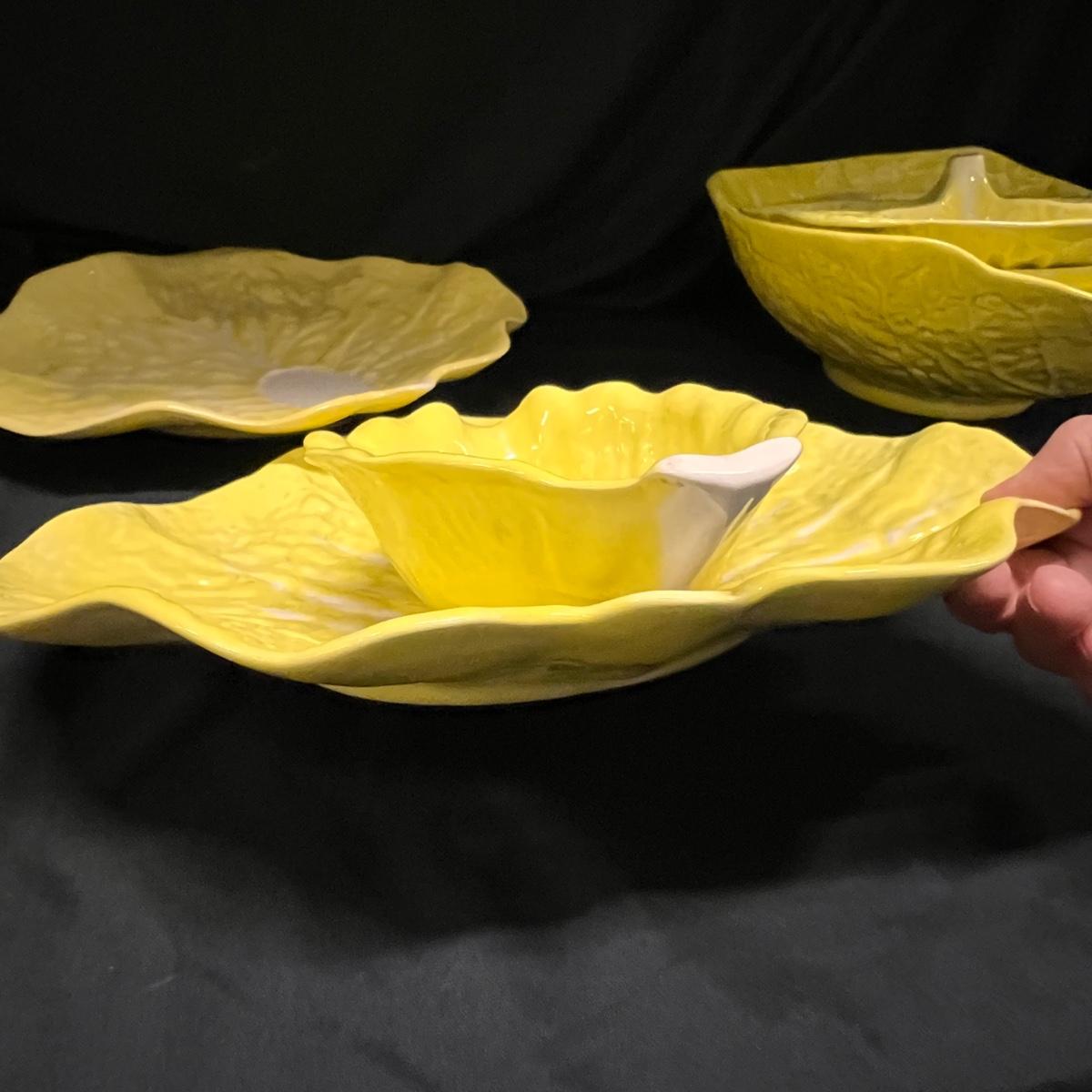 The majority of this Secla set are yellow with four side plates and a bowl that are green. One green plate has a chip. Yellow set (approximately 34 pieces) includes a large lidded tureen with an extra Lid (note the bowl has a chip on the underside), plus bowls, side plates, chip and dip plate and various bowls and platters. See pics for full inventory.