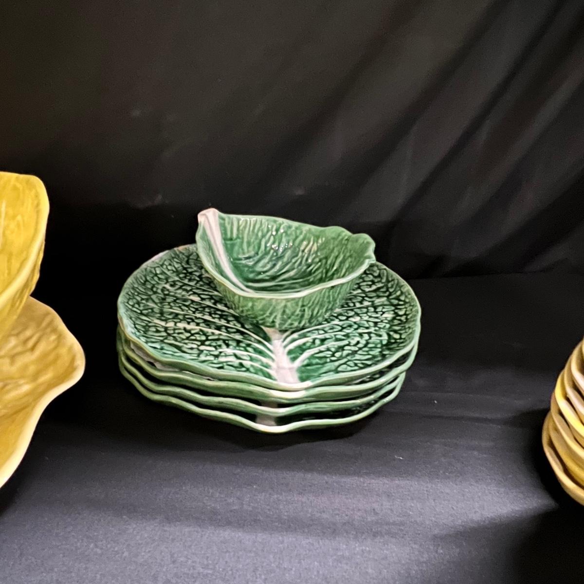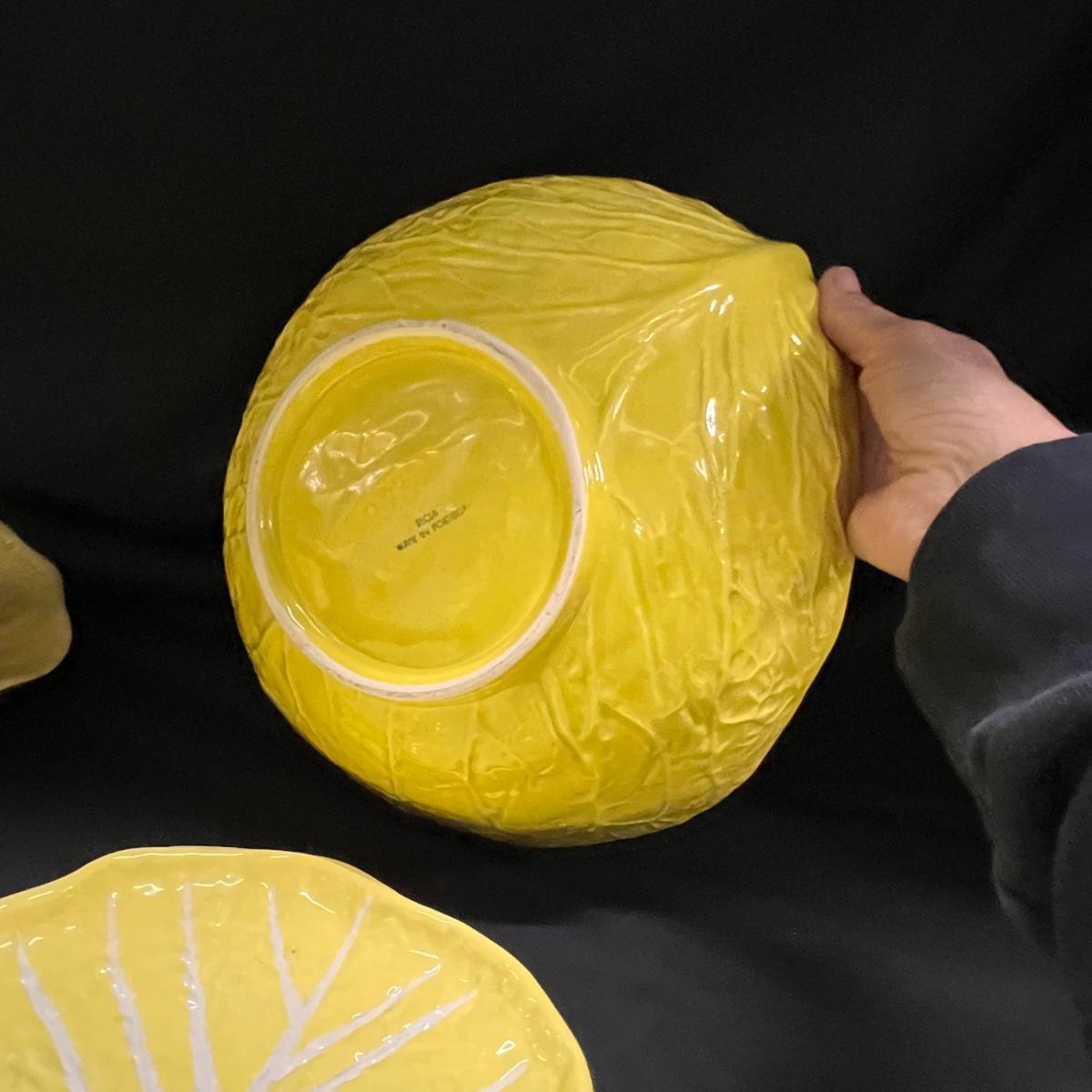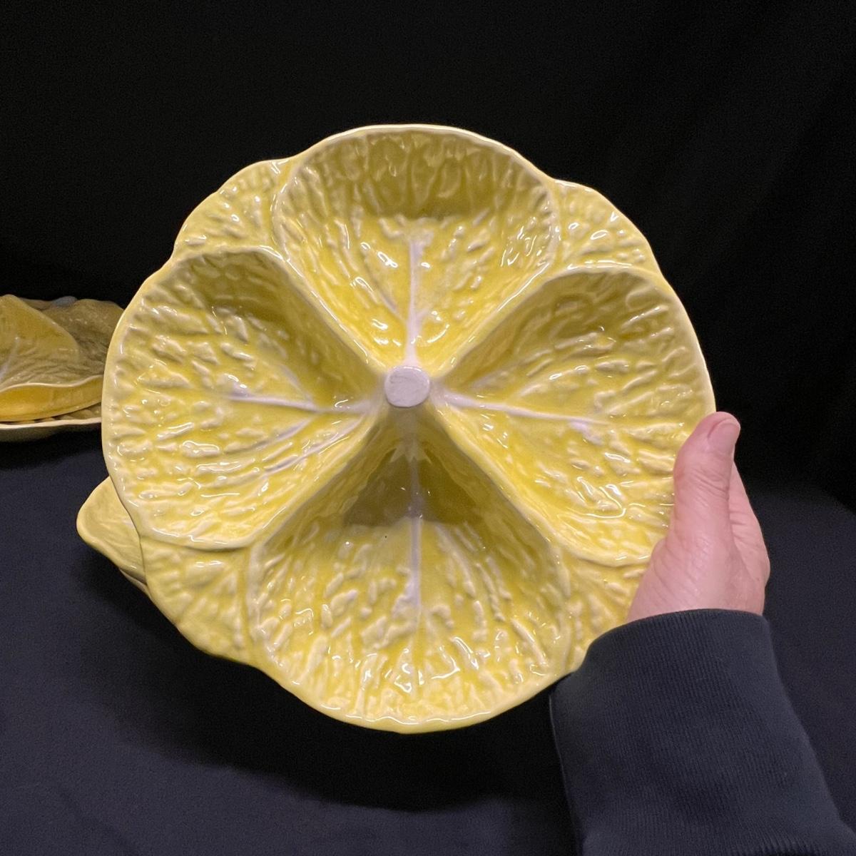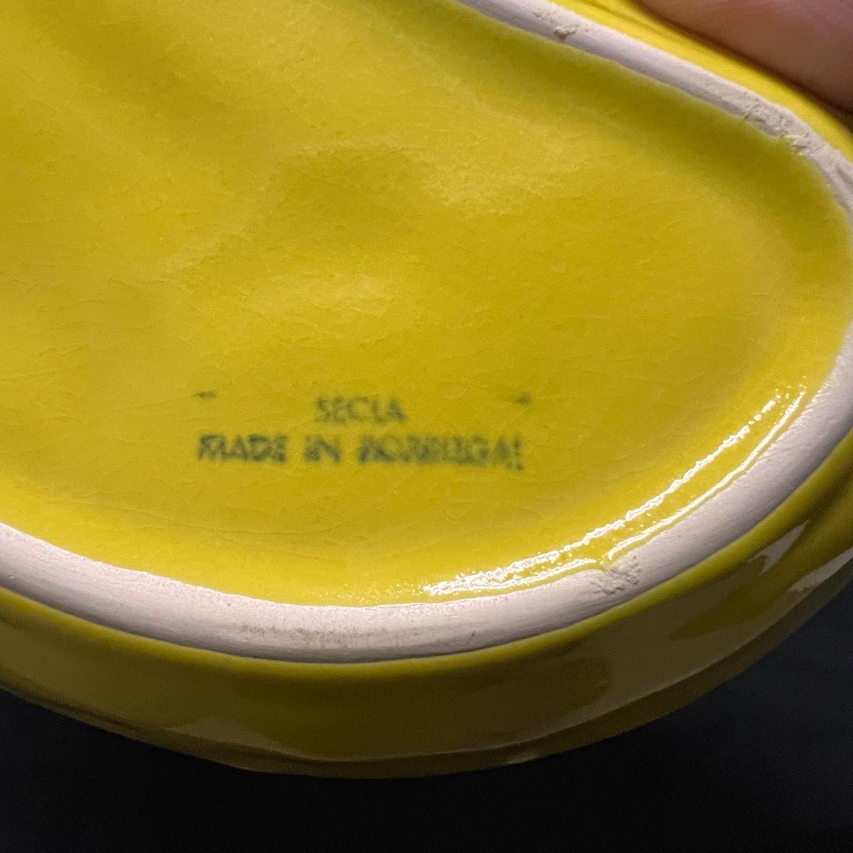 The majority of this Secla set are yellow with four side plates and a bowl that are green. One green plate has a chip. Yellow set (approximately 34 pieces) includes a large lidded tureen with an extra Lid (note the bowl has a chip on the underside), plus bowls, side plates, chip and dip plate and various bowls and platters. See pics for full inventory.