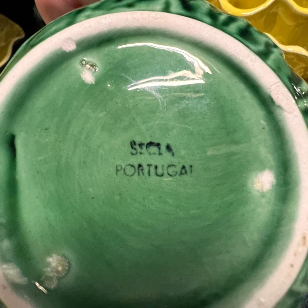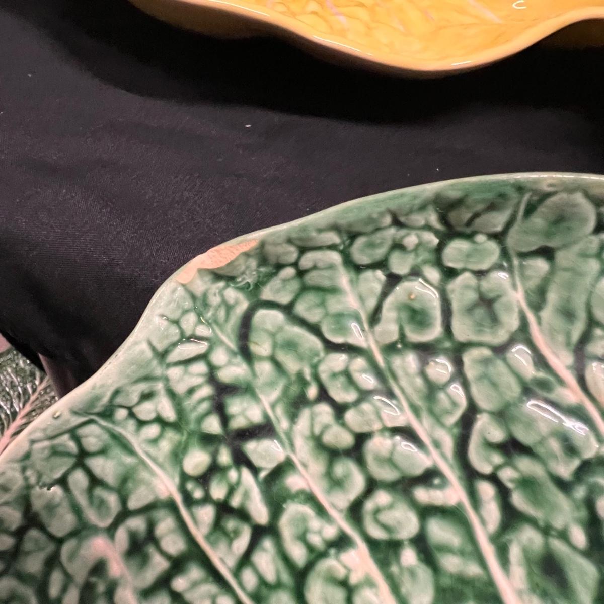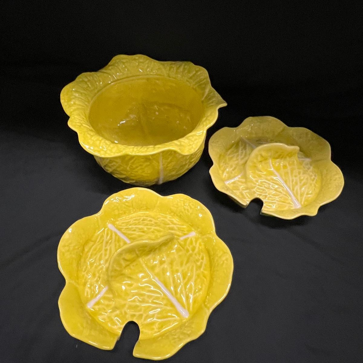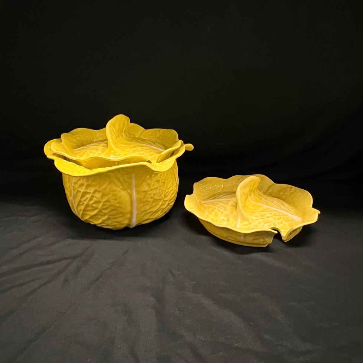 The majority of this Secla set are yellow with four side plates and a bowl that are green. One green plate has a chip. Yellow set (approximately 34 pieces) includes a large lidded tureen with an extra Lid (note the bowl has a chip on the underside), plus bowls, side plates, chip and dip plate and various bowls and platters. See pics for full inventory.