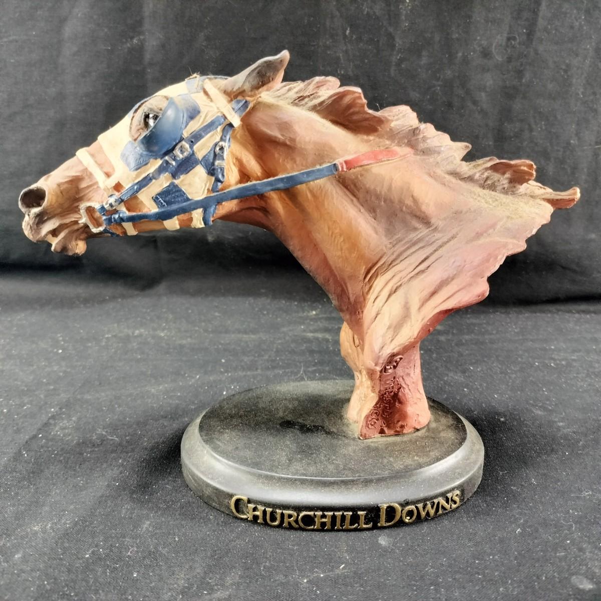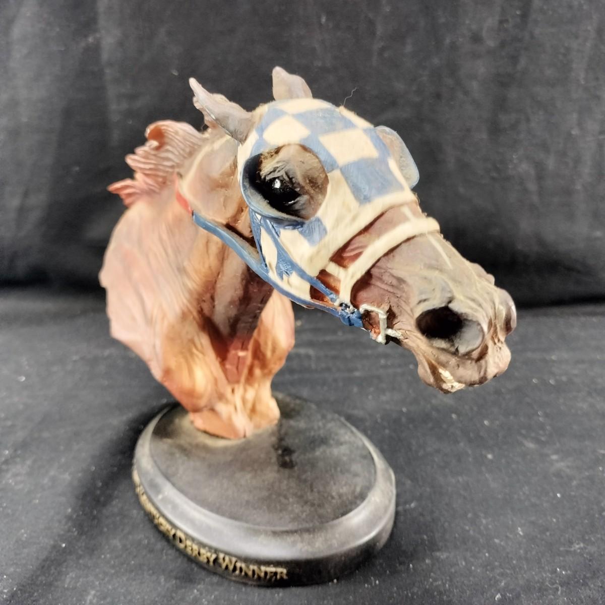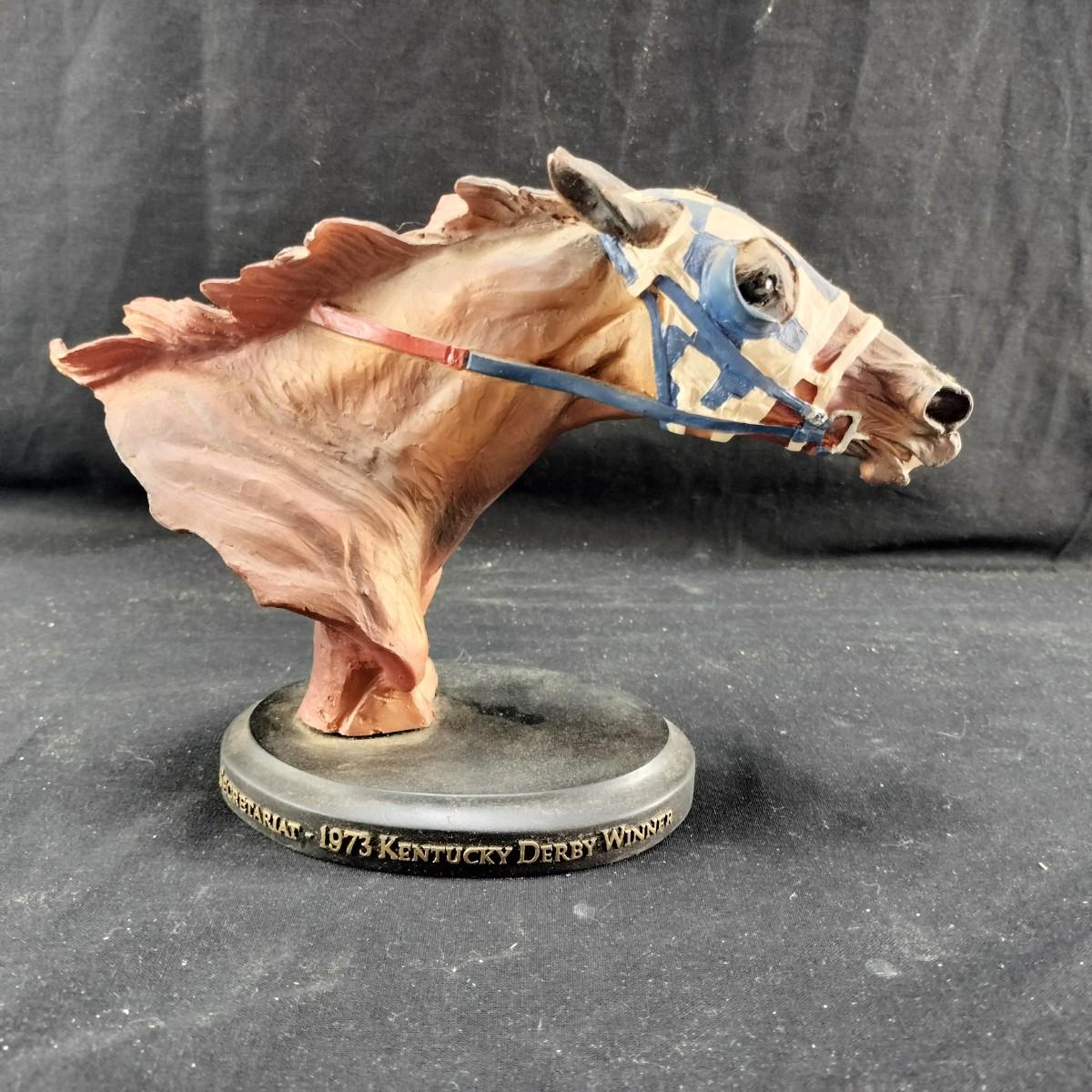 This auction lot is for a Secretariat Commemorative Statue - 1973. This offering is a very nice figure of Secretariat - the 1973 Kentucky Derby Winner, who later became a triple crown winner. The statue is an authorized and sponsored Churchill Downs Collectible. It measures about 9-inches tall x 4-inches wide. Made of a Resin compound..