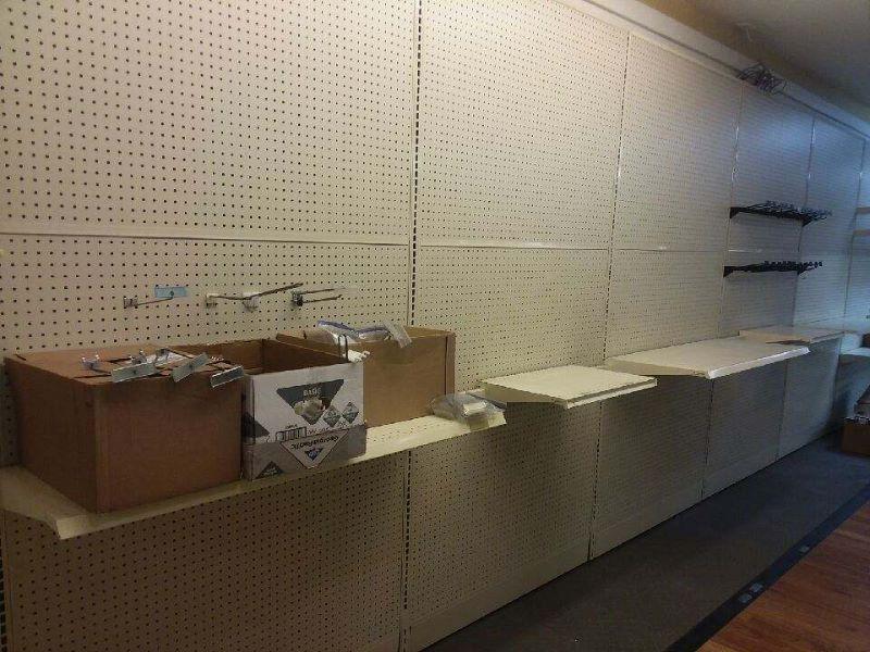 Section One: Five Panels of 4x8 Display Wall,, Peg Board, Hardware 20'x8'. All in good condition. Number of shelves not known at this time. Very clean and in good shape.
