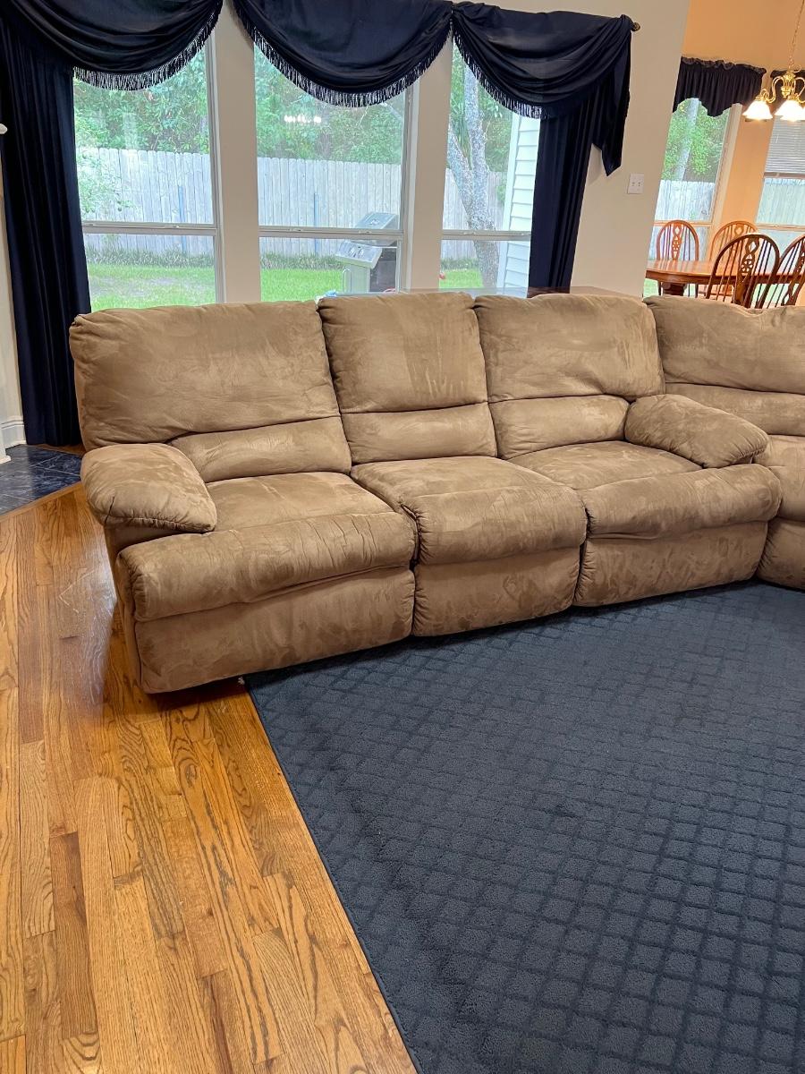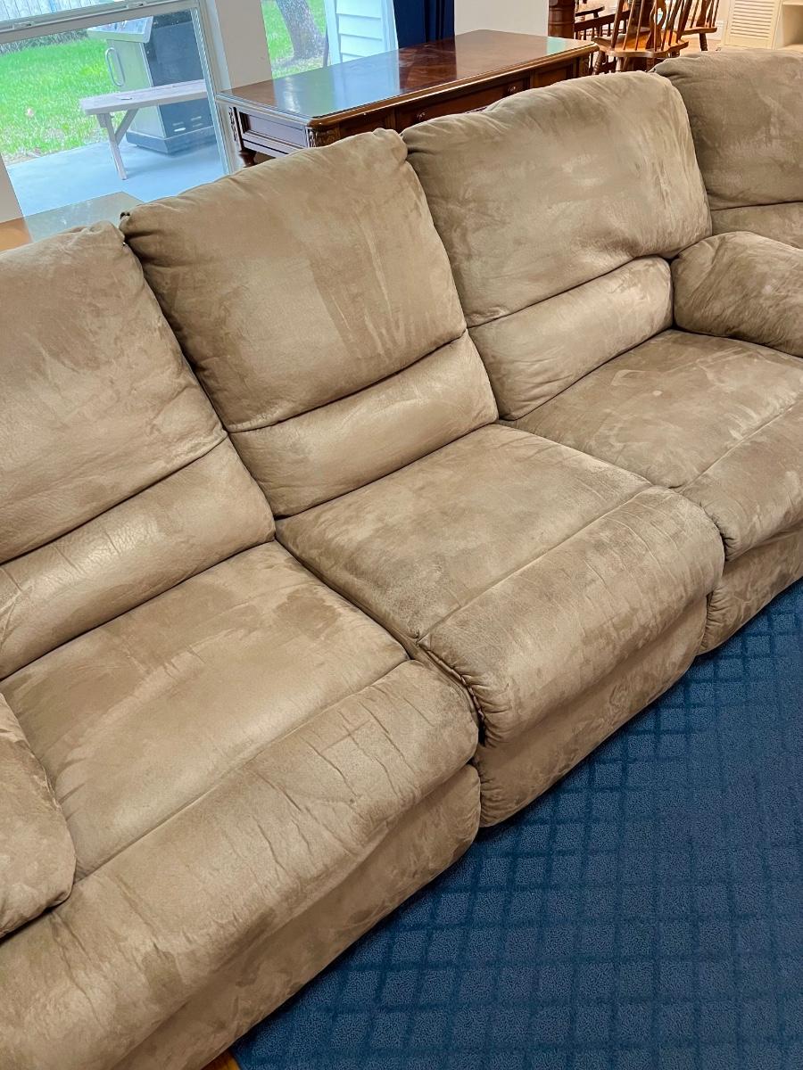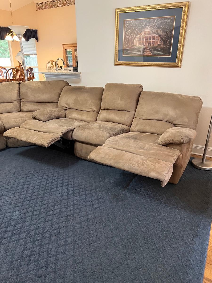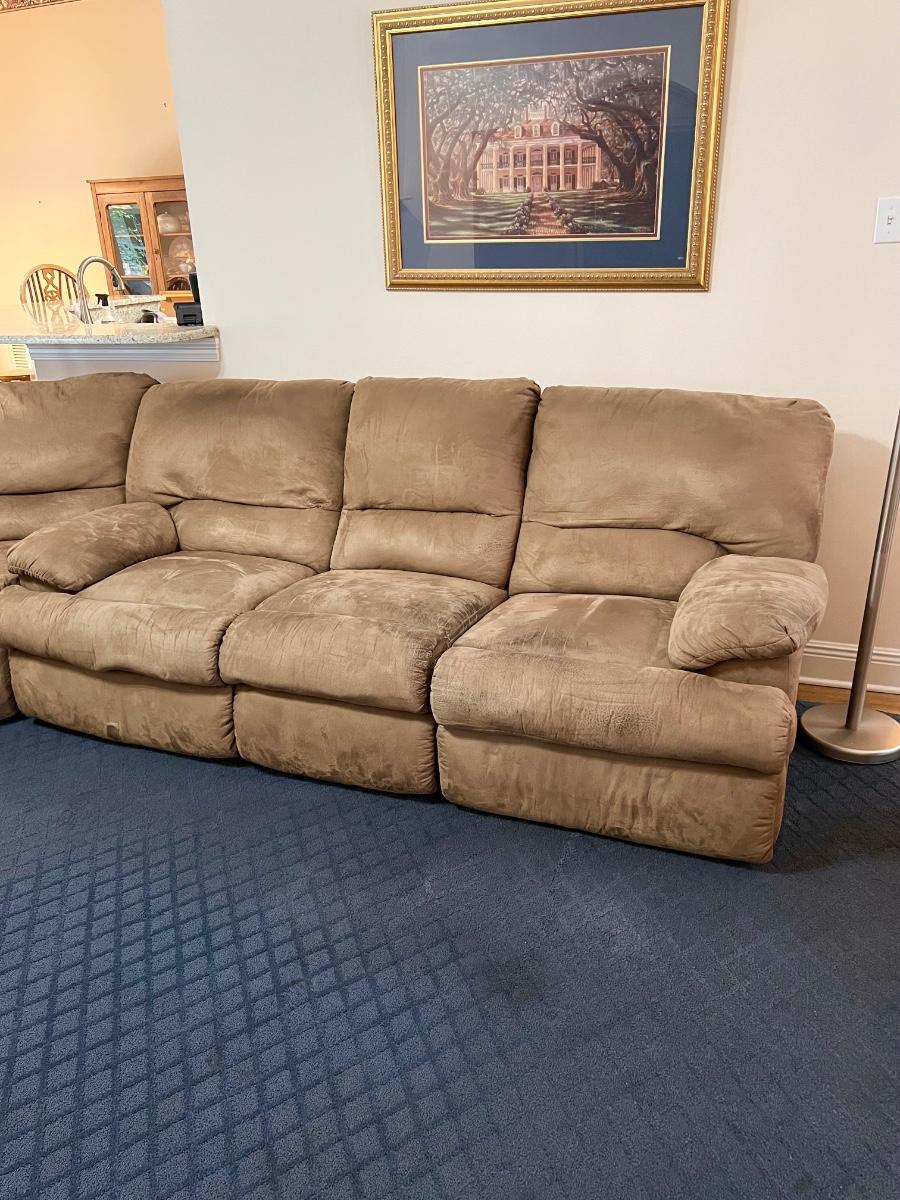 3 pieces ~ Has 4 recliners ~ Owner had small dog ~ One side of the sectional is more worn than the other, see photos for condition ~ Has been deodorized, sanitized, & disinfected ~ Does need additional cleaning ~ Rug not for sale ~ Framed picture sold separately ~ Both reclining sofa pieces = 36” H x 90” W x 42” D ~ Middle piece = 36” H x 68” W x 42” D