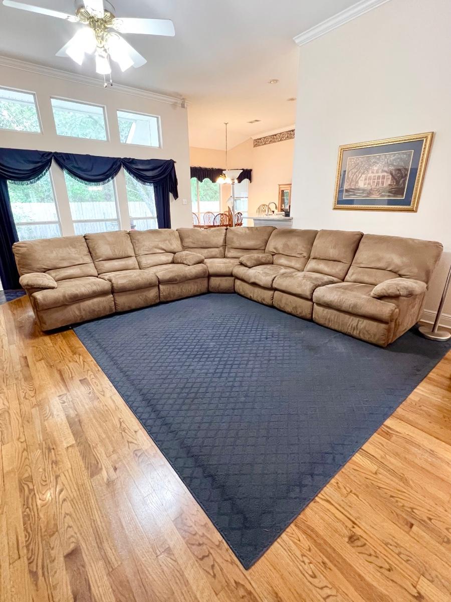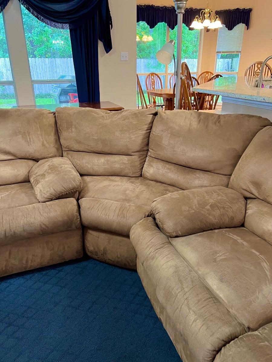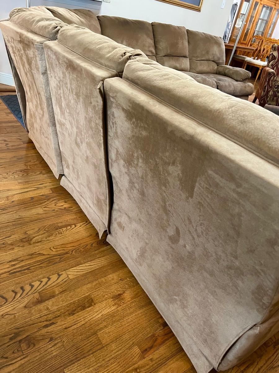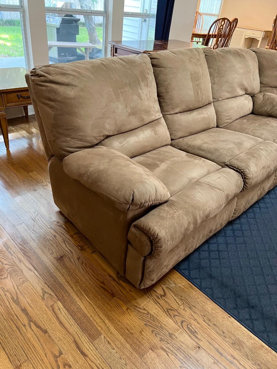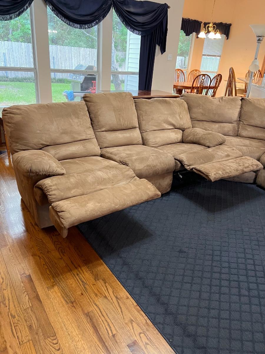 3 pieces ~ Has 4 recliners ~ Owner had small dog ~ One side of the sectional is more worn than the other, see photos for condition ~ Has been deodorized, sanitized, & disinfected ~ Does need additional cleaning ~ Rug not for sale ~ Framed picture sold separately ~ Both reclining sofa pieces = 36” H x 90” W x 42” D ~ Middle piece = 36” H x 68” W x 42” D