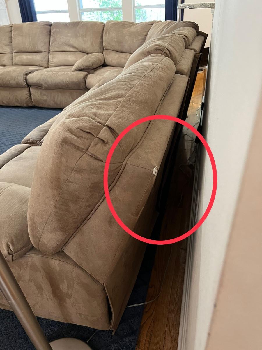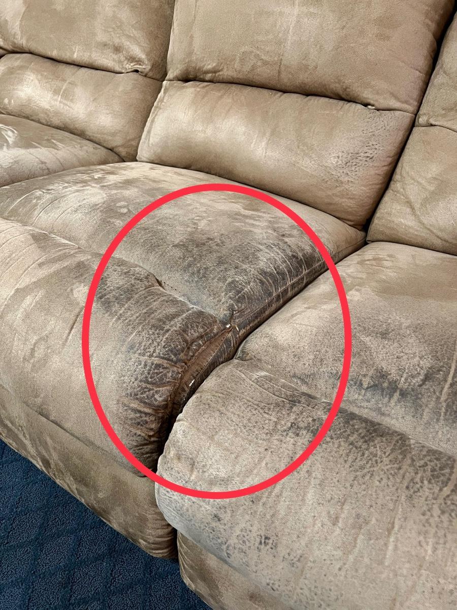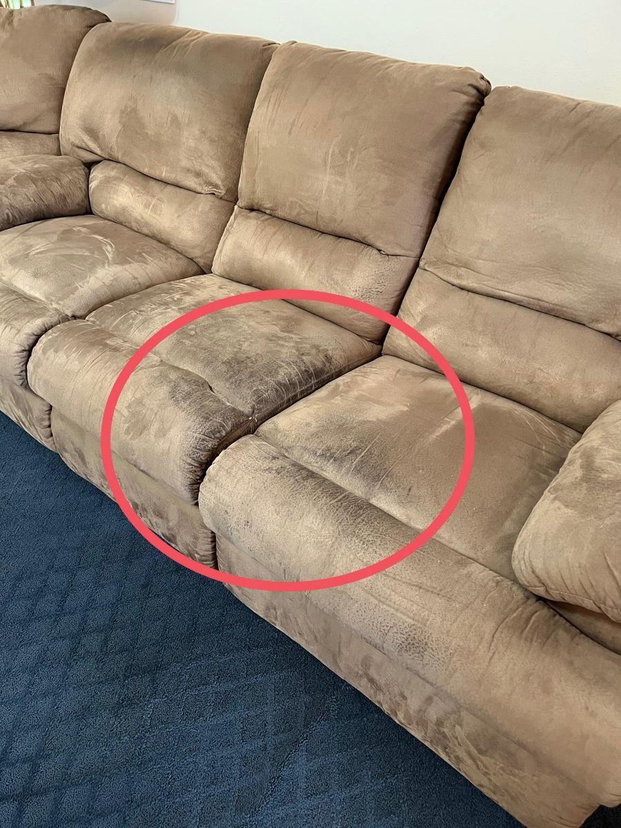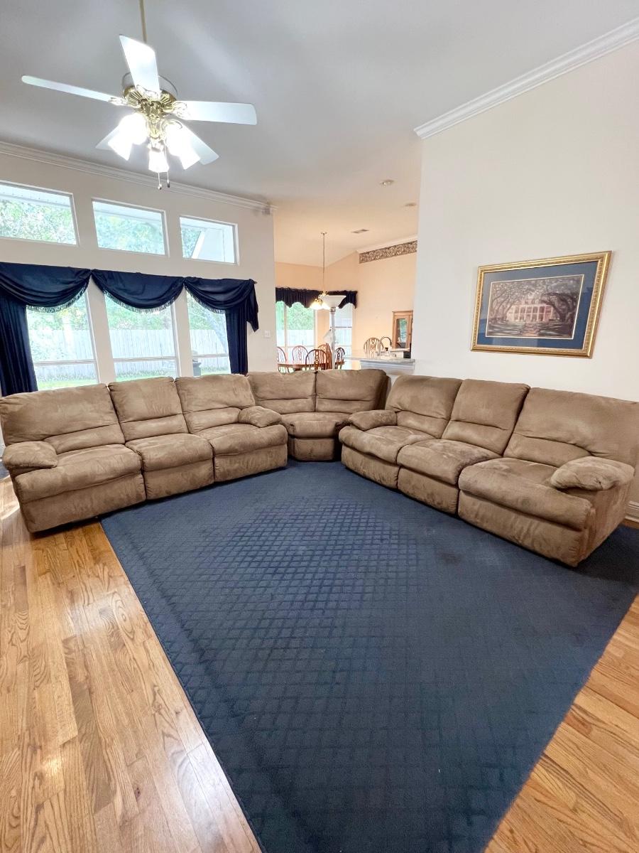 3 pieces ~ Has 4 recliners ~ Owner had small dog ~ One side of the sectional is more worn than the other, see photos for condition ~ Has been deodorized, sanitized, & disinfected ~ Does need additional cleaning ~ Rug not for sale ~ Framed picture sold separately ~ Both reclining sofa pieces = 36” H x 90” W x 42” D ~ Middle piece = 36” H x 68” W x 42” D