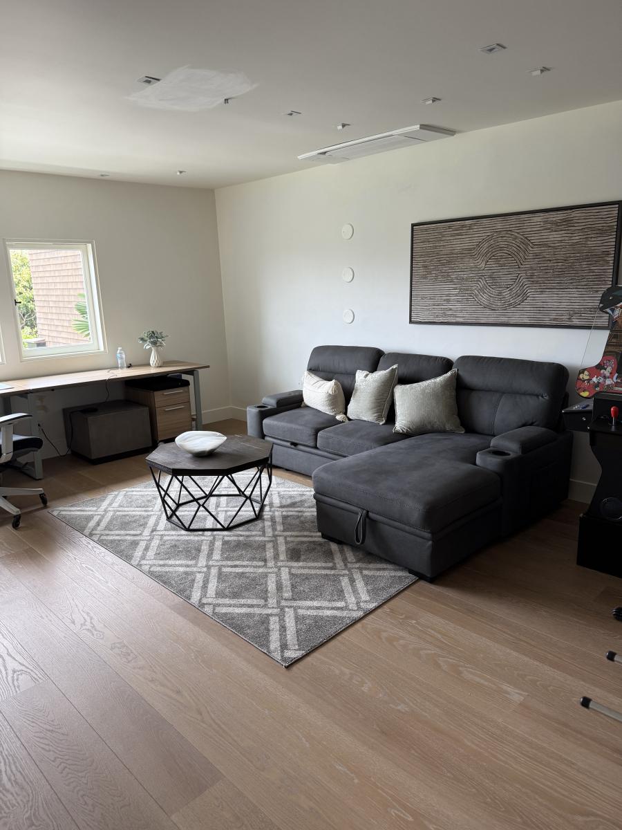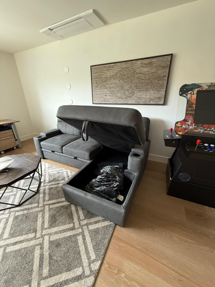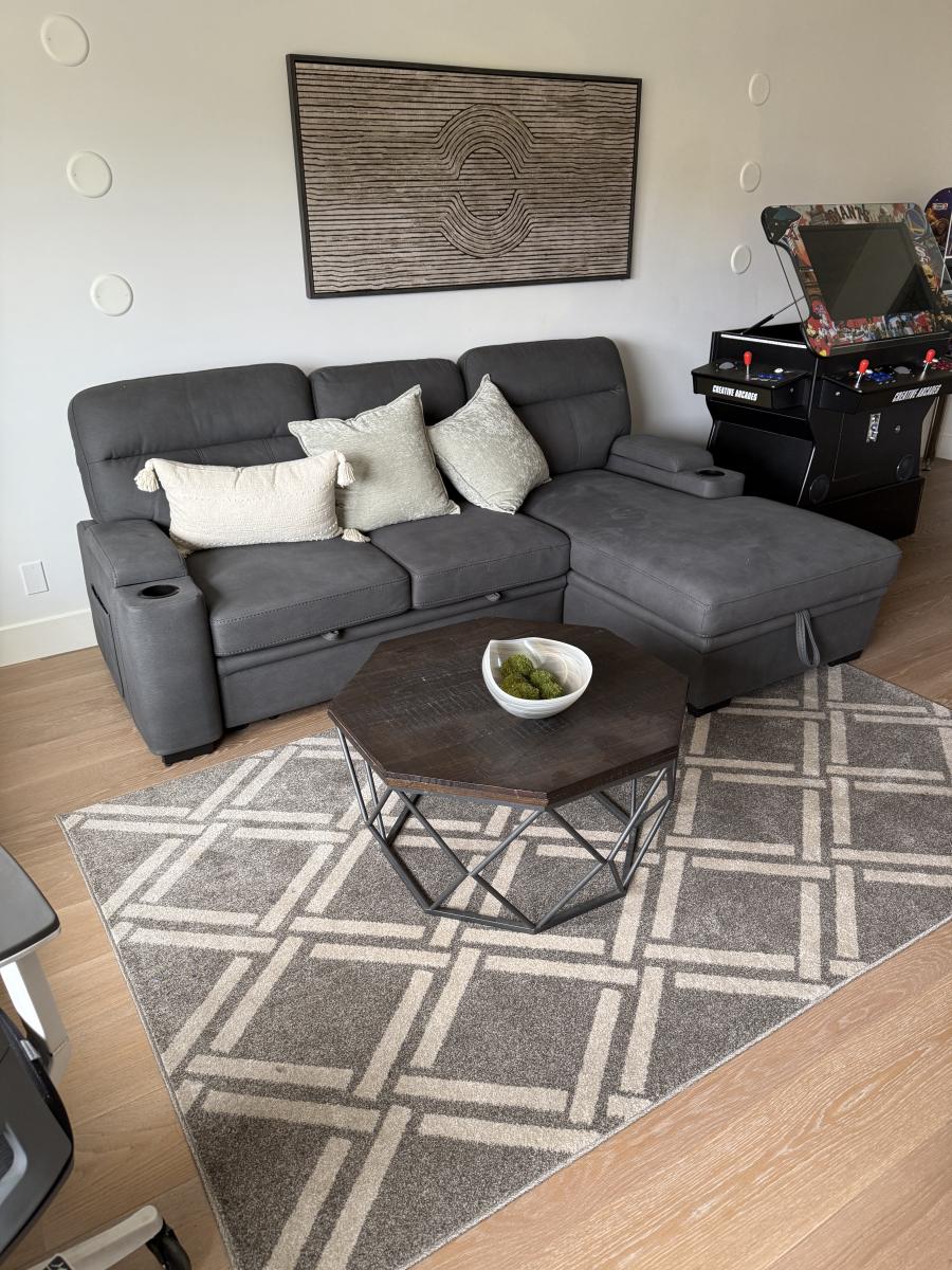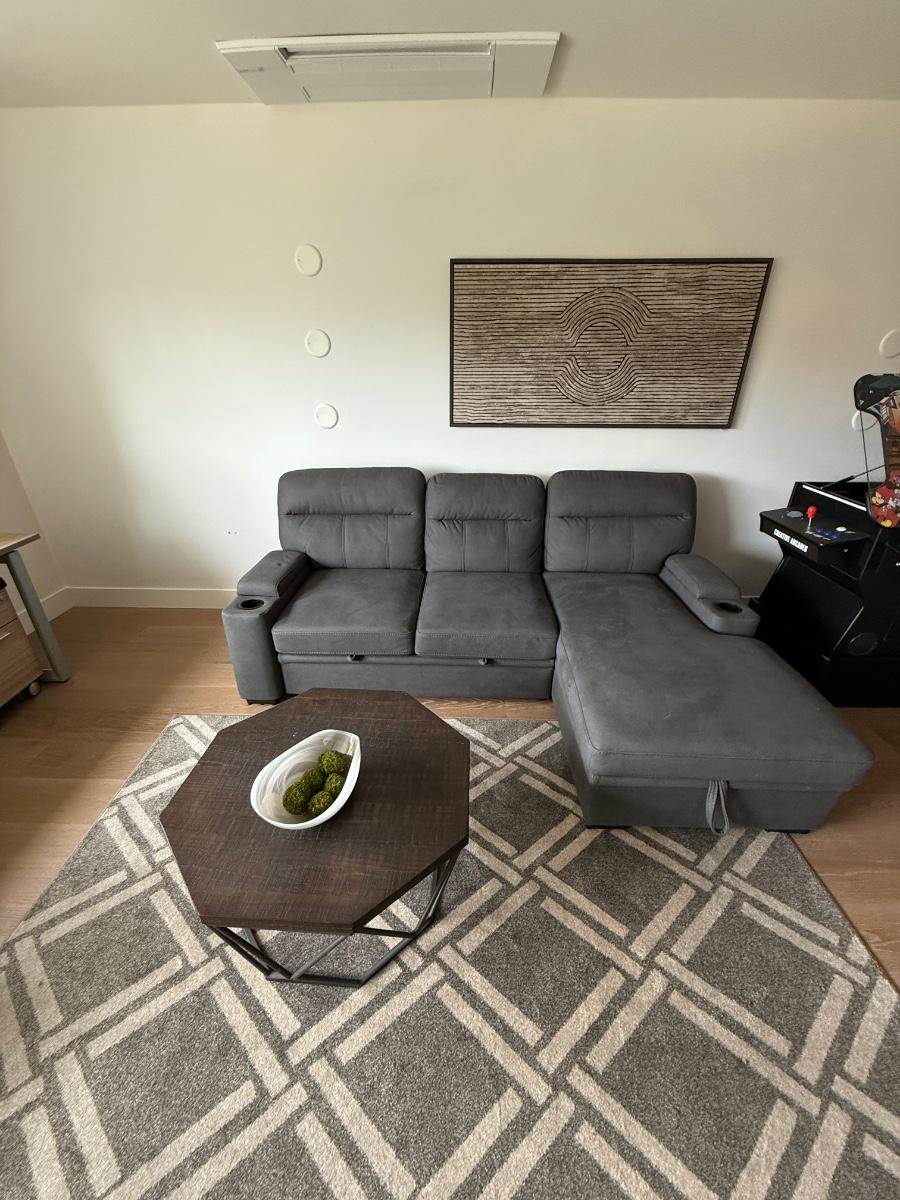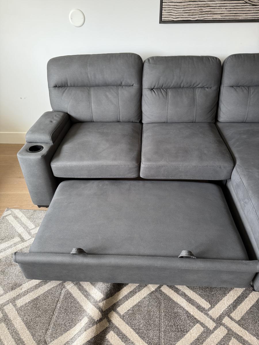 The Kipling II Grey Sectional is a versatile addition to any living room, offering a seating capacity for three adults. This medium-firm sofa, upholstered in solid gray leather, features a high back and integrated cupholders for added convenience. The sectional includes a convertible sleeper with a double bed size and built-in storage, making it ideal for hosting guests or relaxing during movie nights. The frame is constructed from wood, and the unit requires assembly. The sofa measures 58" x 34" x 38" with a seat height of 18", while the chaise extends to 64" in length. Manufactured in 2023 in China, it comes with a 1-year warranty and should be cleaned with upholstery shampoo. The product is pre-owned.