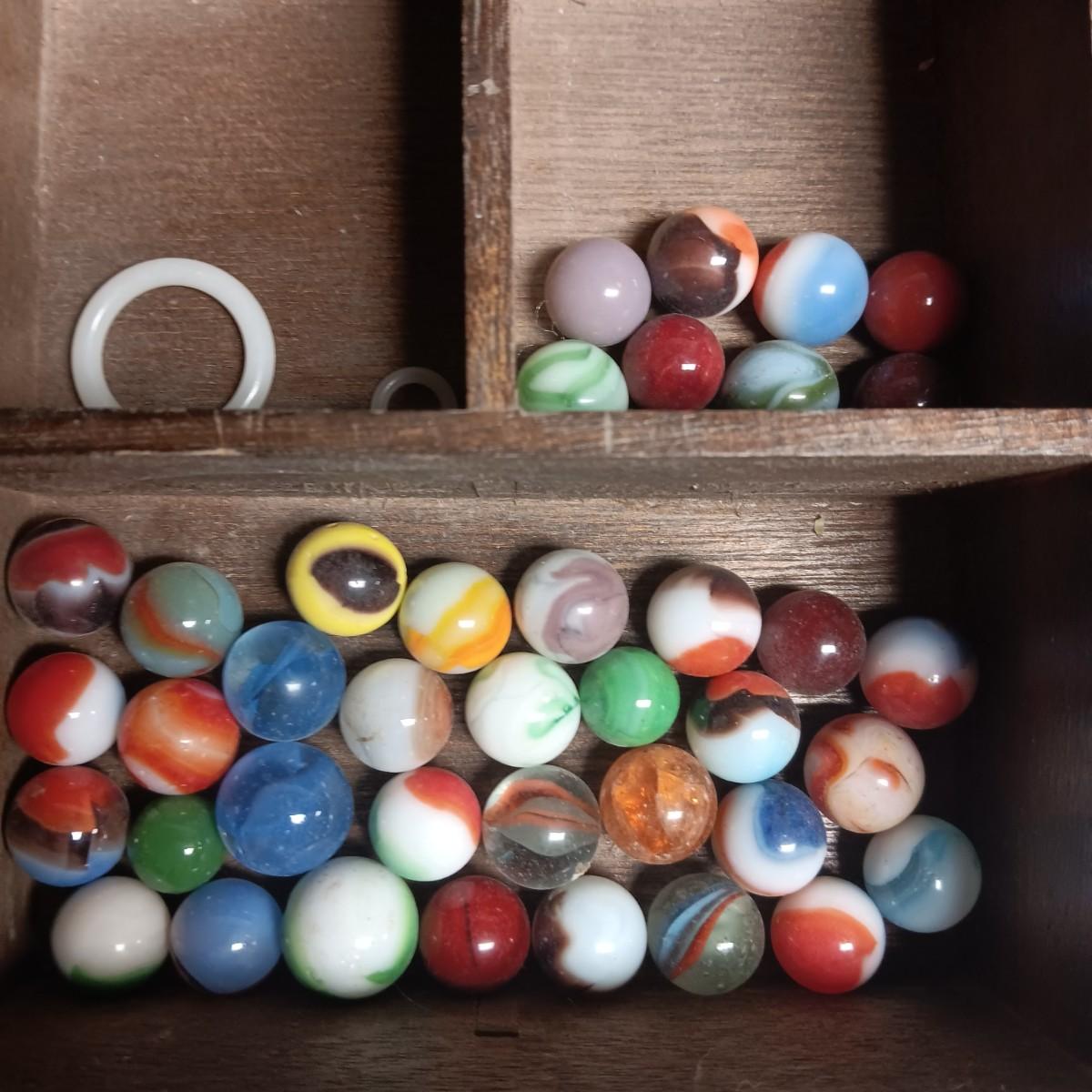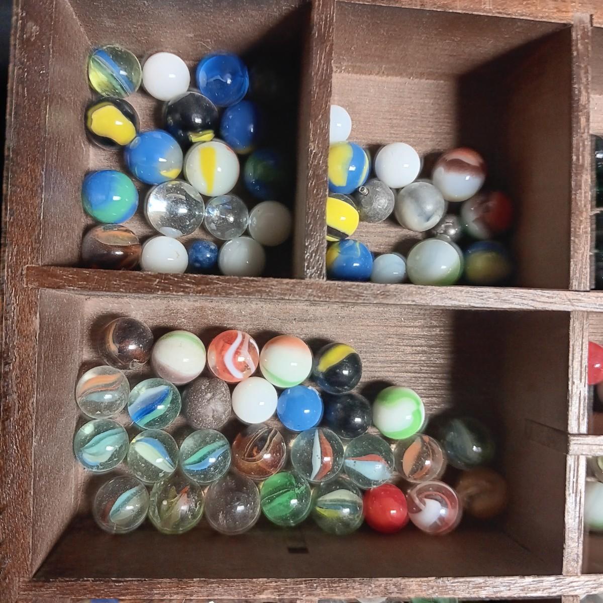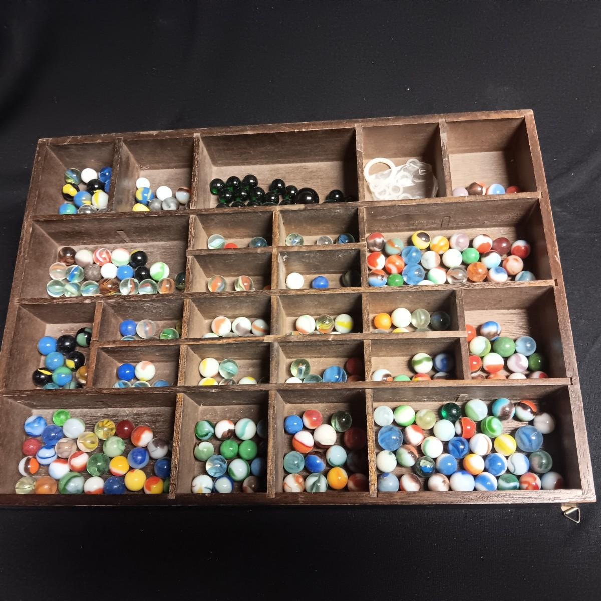 SECTIONED WOODEN BOX WITH A VARIETY OF MARBLES