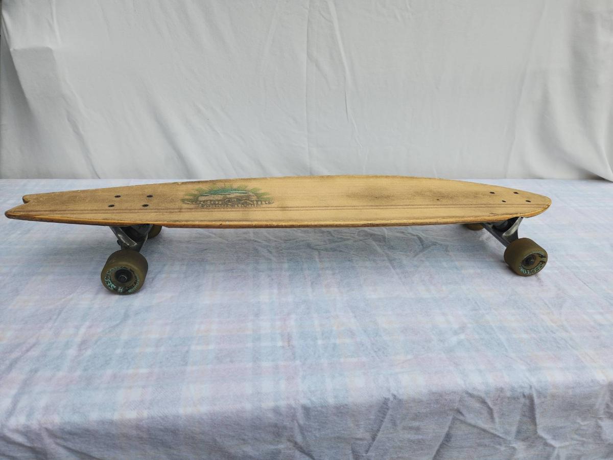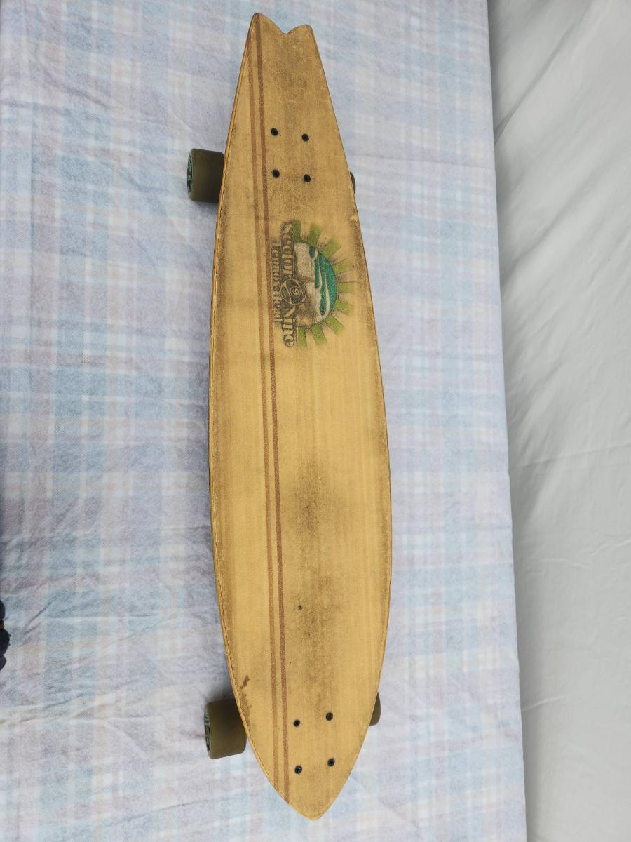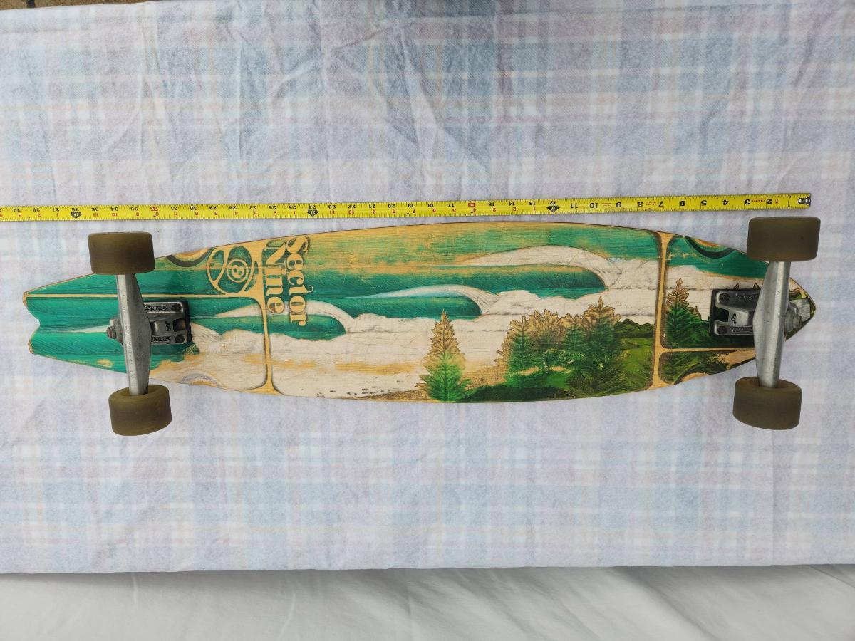 Sector Nine longboard skateboard featuring a wooden deck with a worn graphic design on the underside, painted in green and white with landscape imagery. The board is equipped with trucks and translucent wheels. Some wear is visible on the deck and wheels, consistent with use. Overall length is approximately 46 inches as shown by the measuring tape.