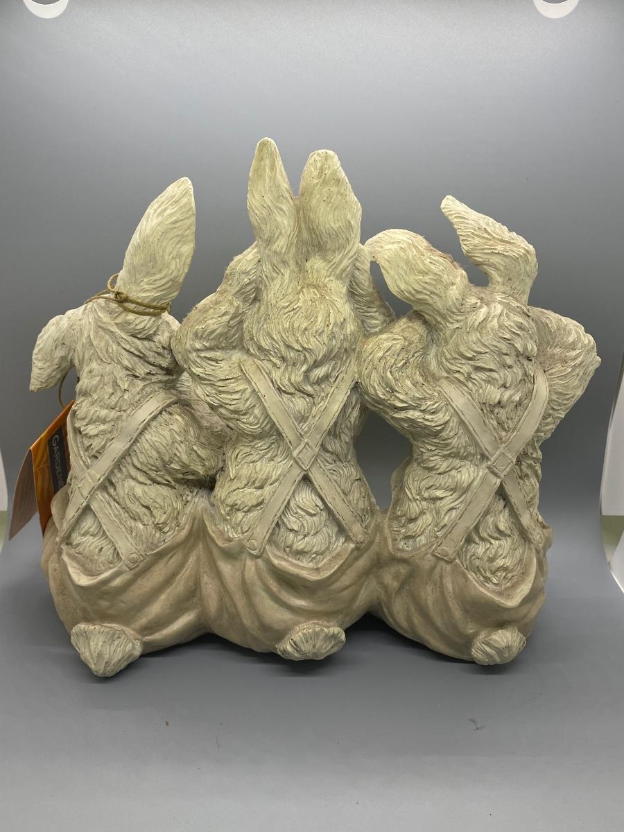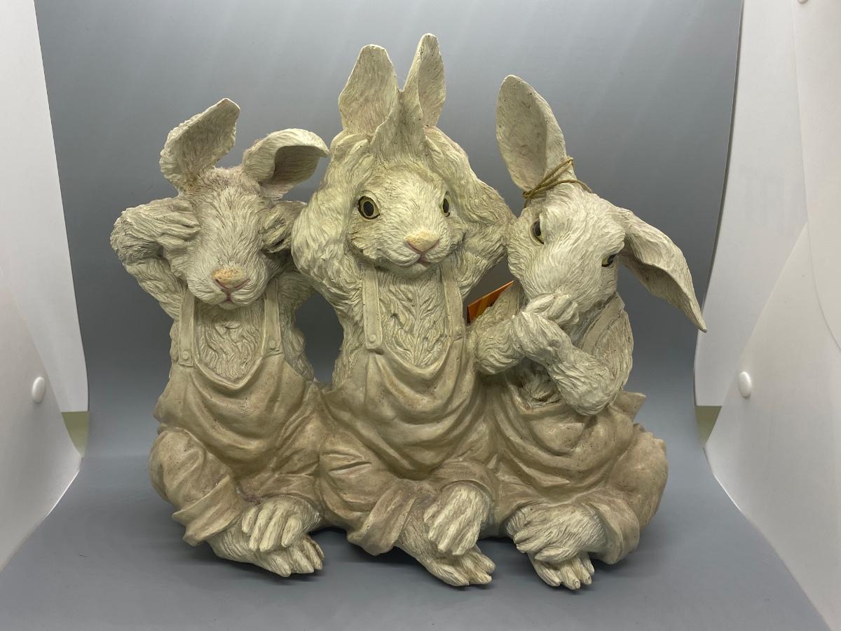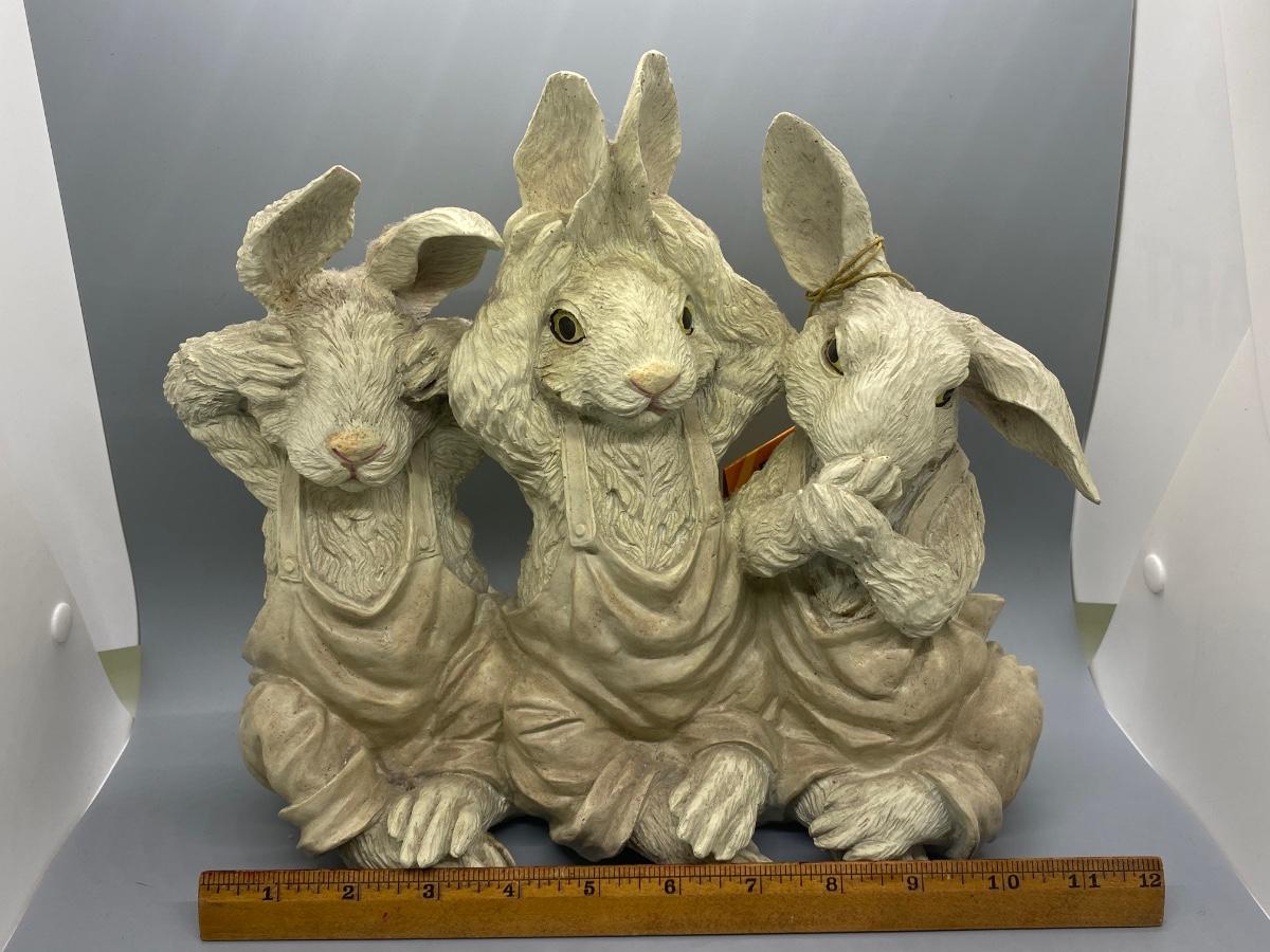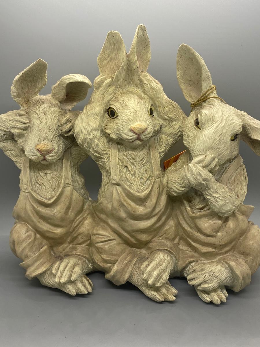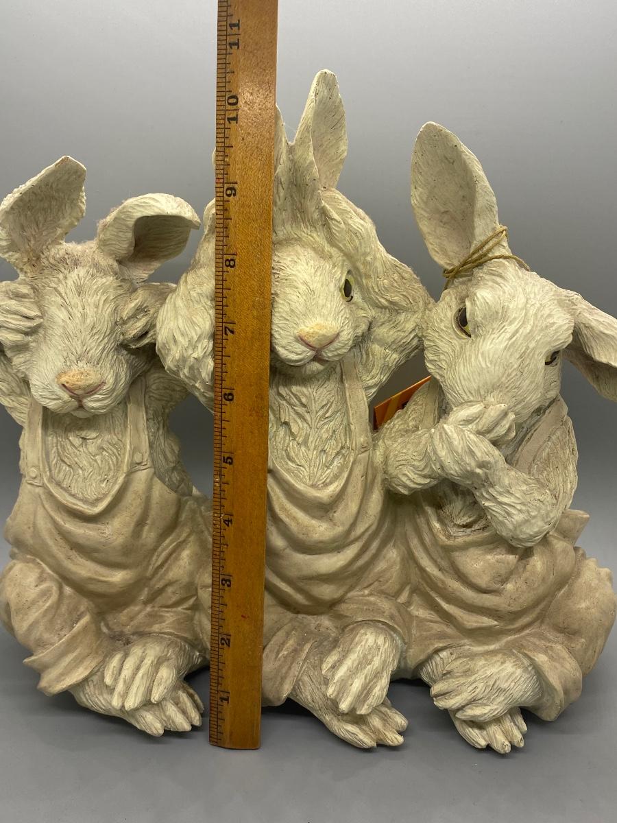 Cute See No Evil, Hear No Evil, Speak No Evil Bunny Rabbit Garden Yard Art. In good condition. Made of a sturdy resin composite material.