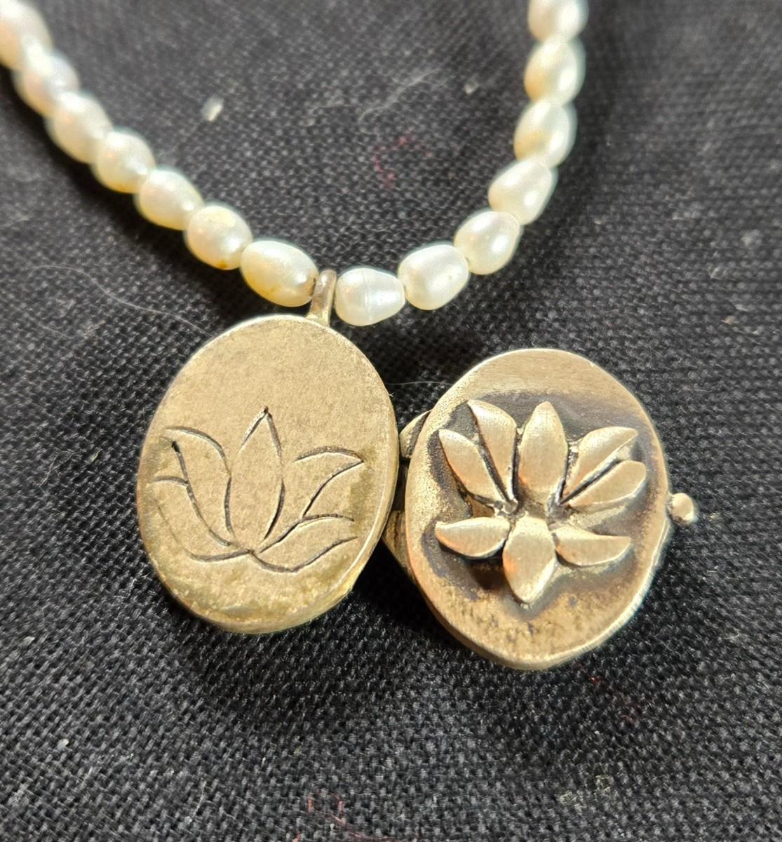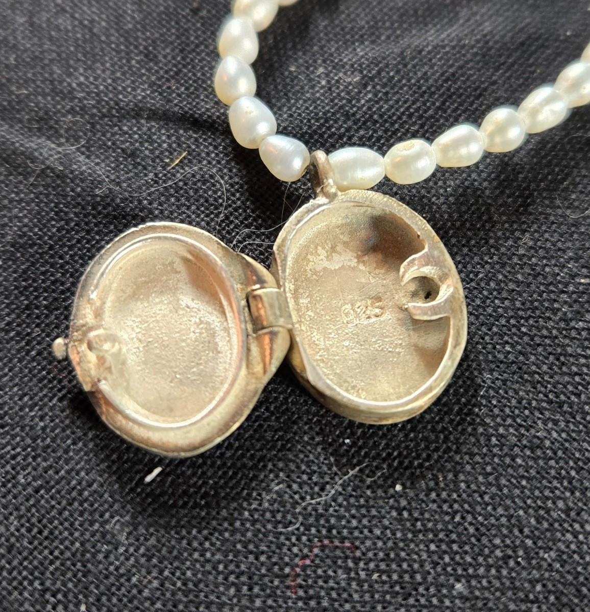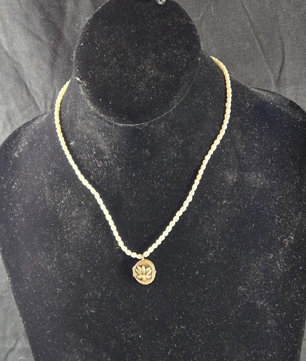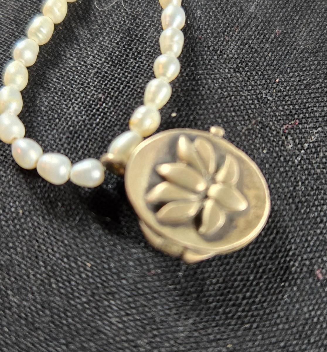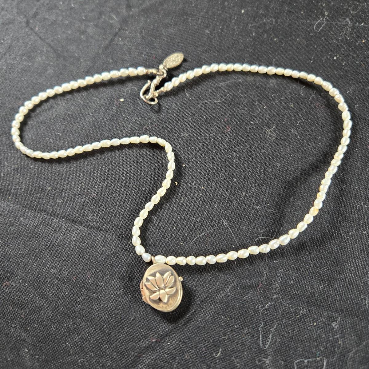 This auction lot is for a Seed Pearl and Sterling Necklace/Locket. This sweet piece is a Seed Pearl and Sterling Necklace - Locket. It's total chain length is about 15-inches. The Locket and clasps are sterling.