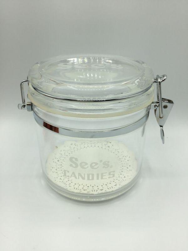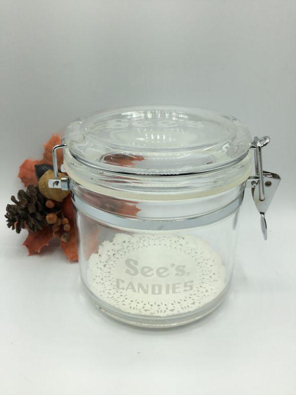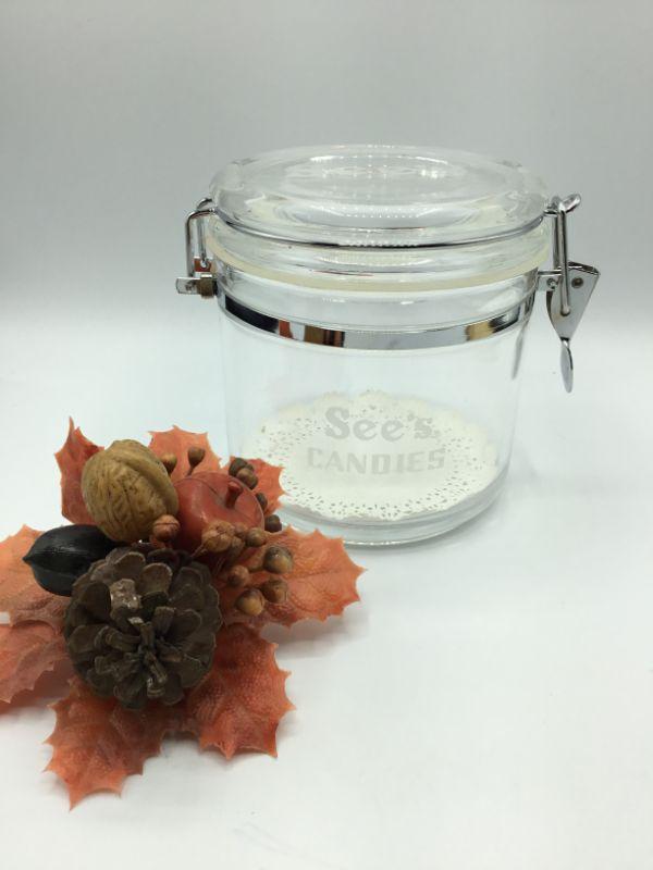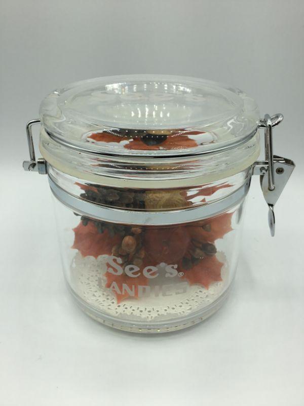 See's Candy lidded canister with fall decor. Plastic jar is hinged lid. Air tight seal when latched.
