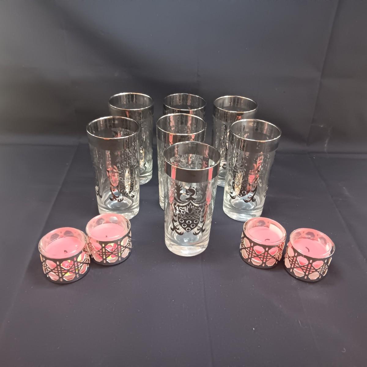 SEET OF MID-CENTURY KIMIKO SILVER KNIGHT SHIELD HIGHBALL GLASSES AND 4 METAL CANDLE HOLDERS