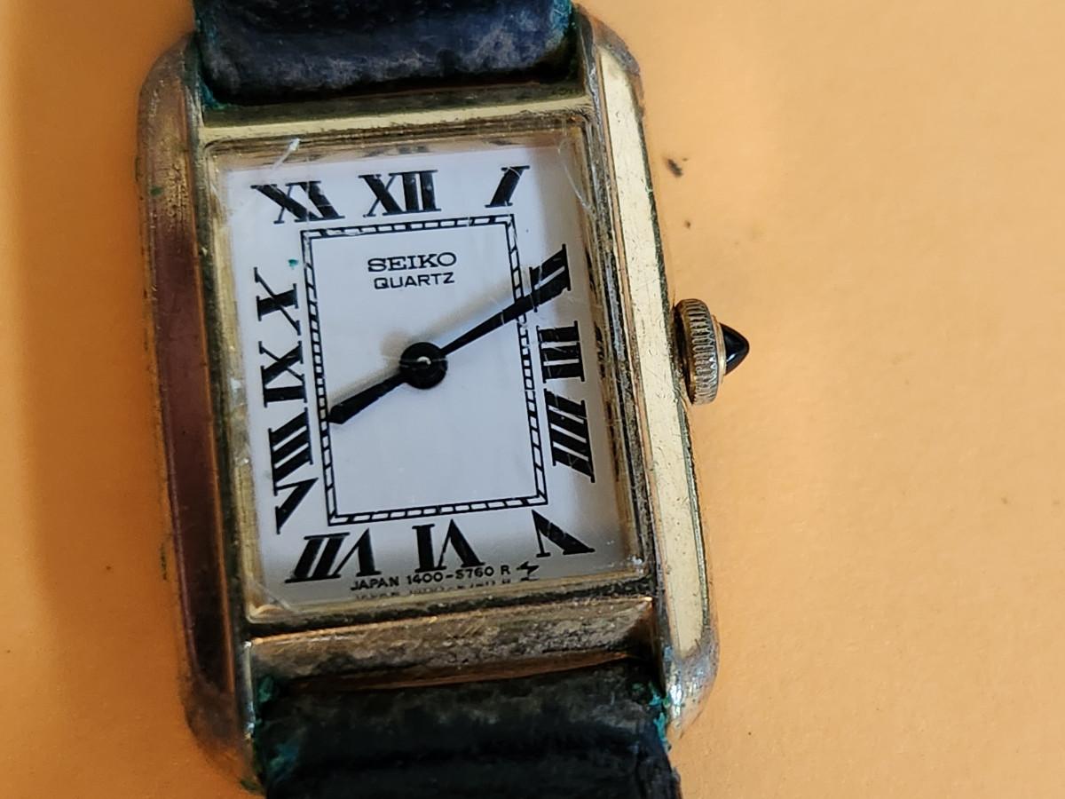This auction lot is for a Seiko Ladies Quartz Watch. This watch has seen some wear as evidenced by the leather band. The watch has not been tested and we can't say if it is functioning or not - buying as is.