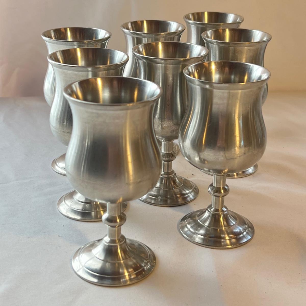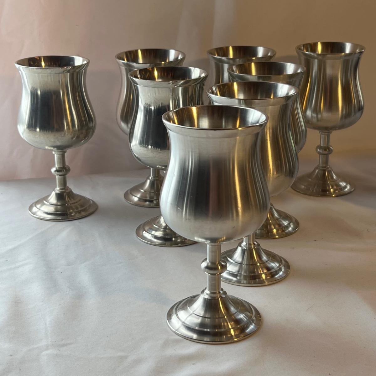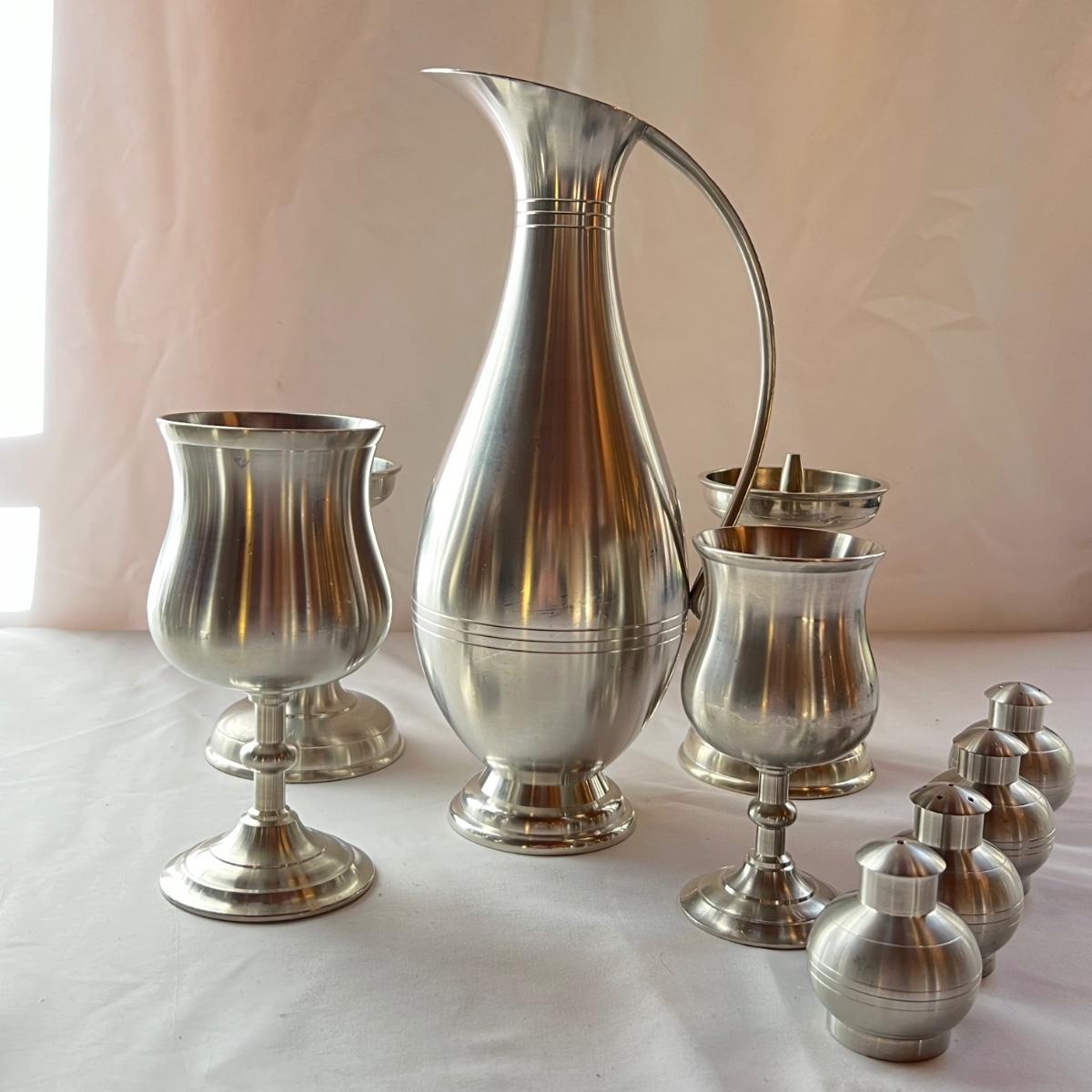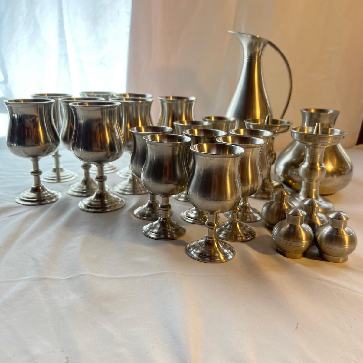 24 pieces of Selangor Pewter that includes a modern handled carafe, eight large stemmed cups (3” x 6”H), eight smaller stemmed cups (2.5” x 5”) and more.