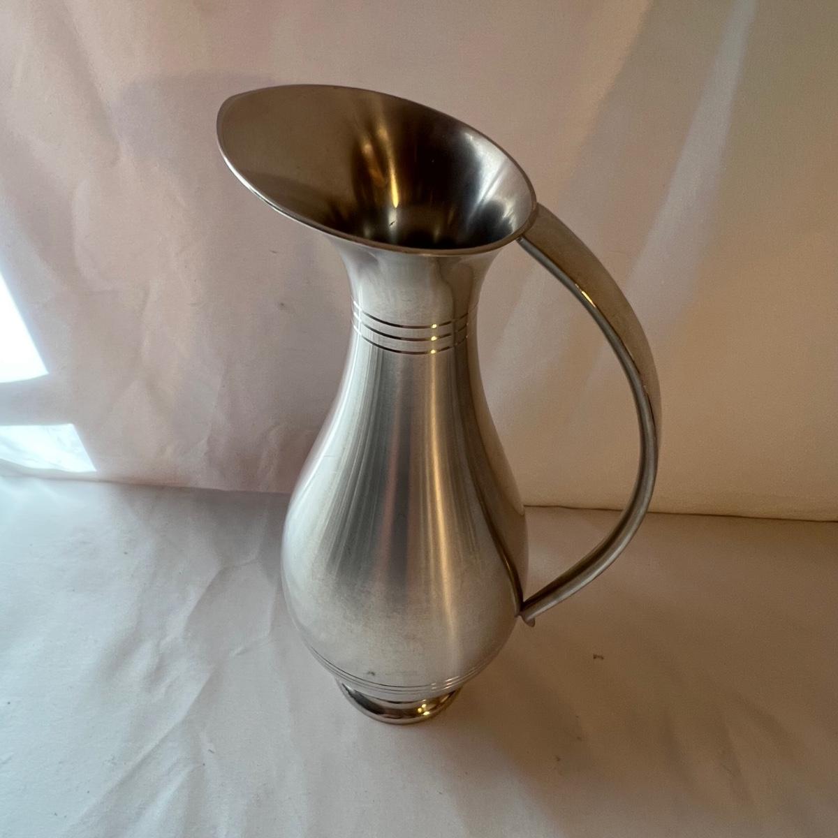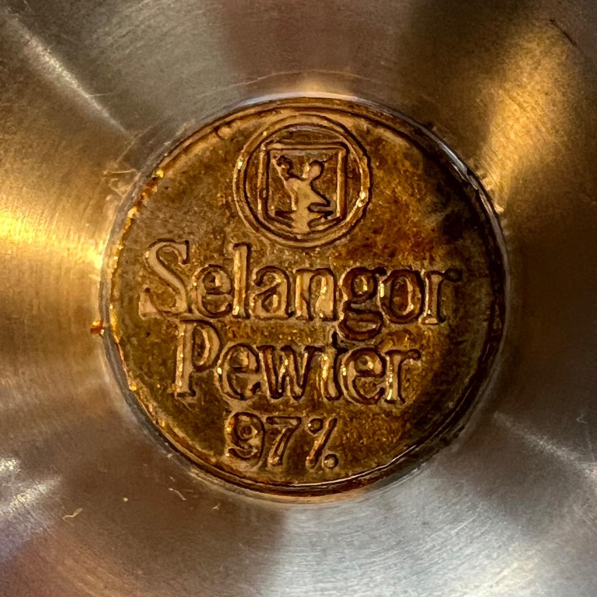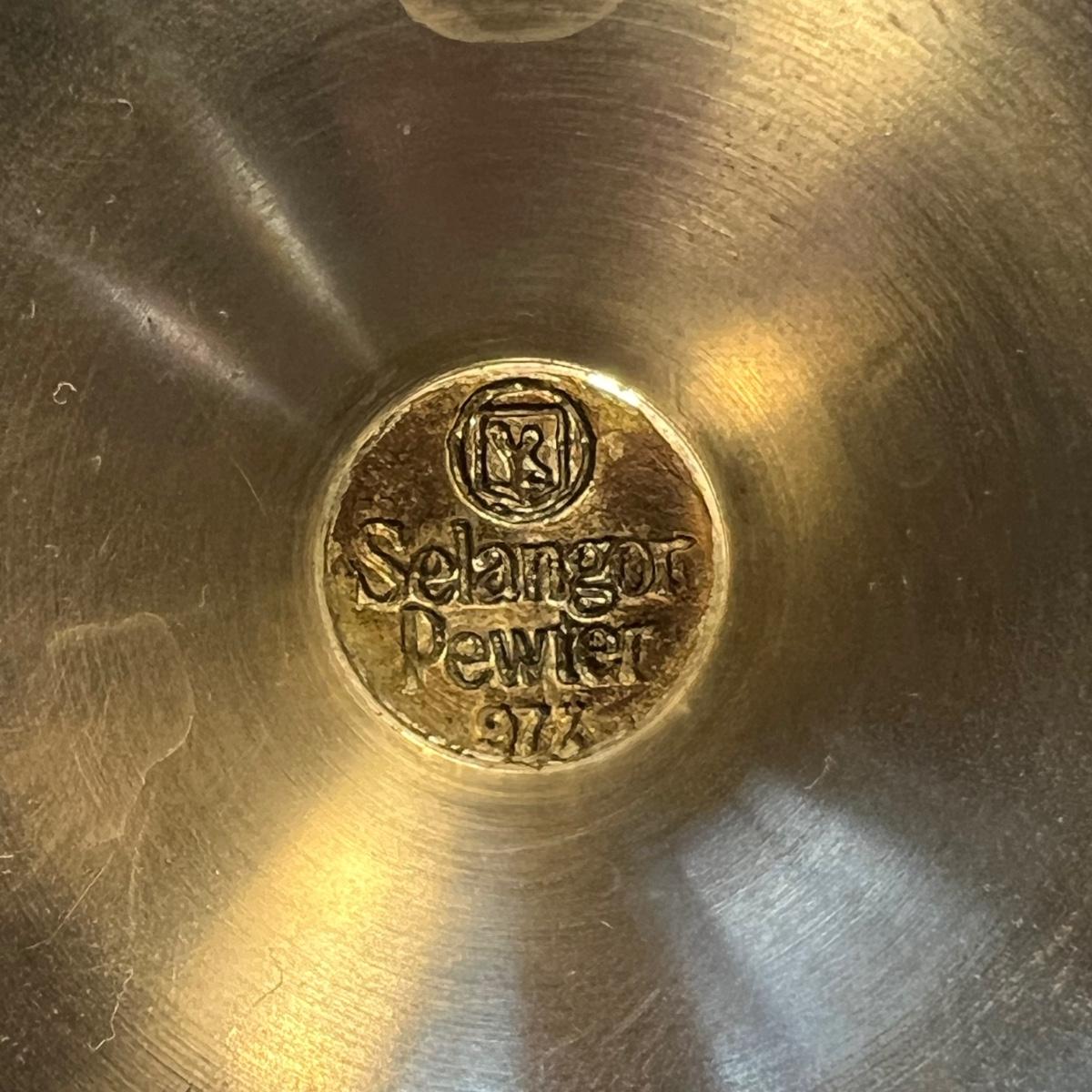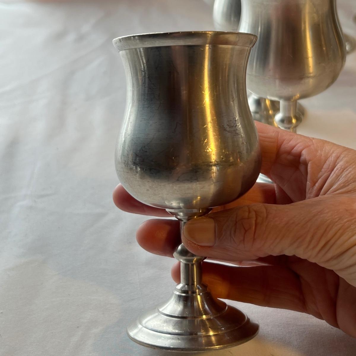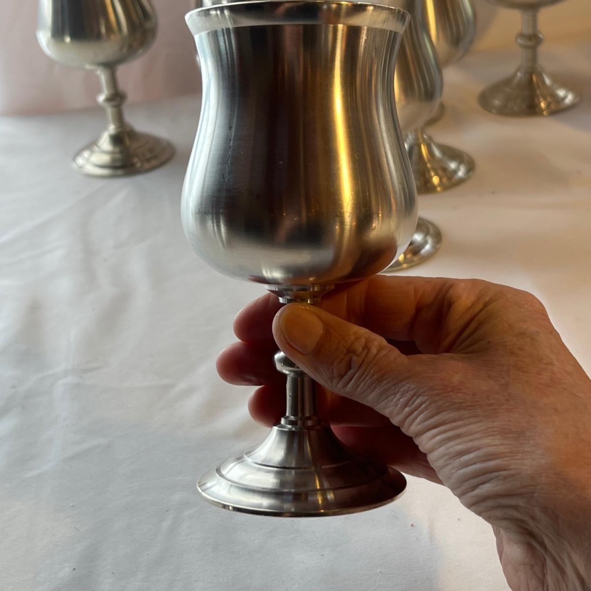 24 pieces of Selangor Pewter that includes a modern handled carafe, eight large stemmed cups (3” x 6”H), eight smaller stemmed cups (2.5” x 5”) and more.