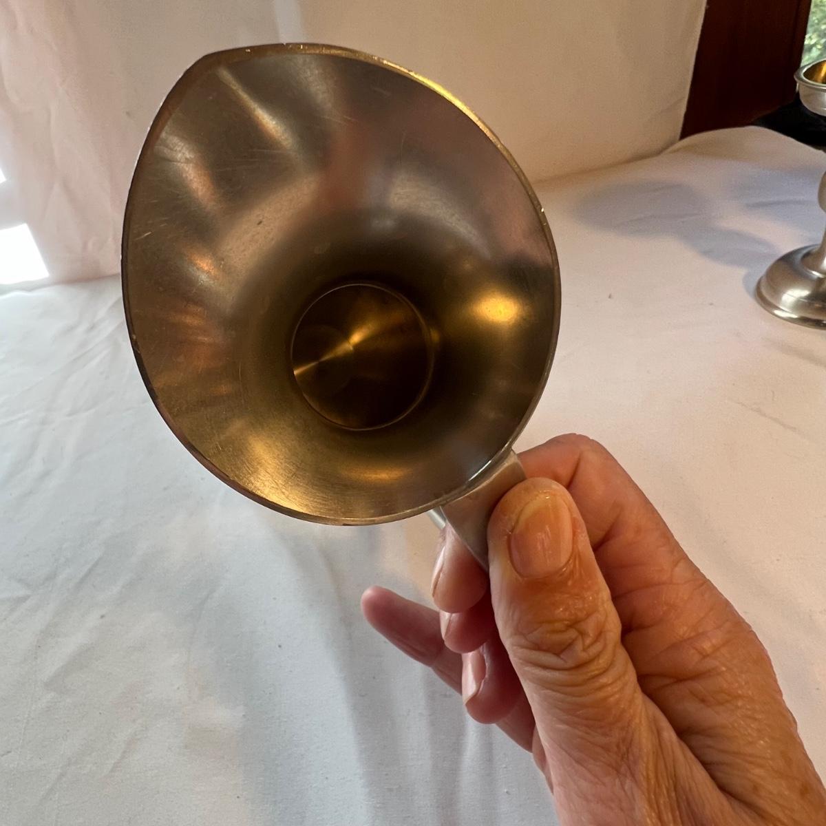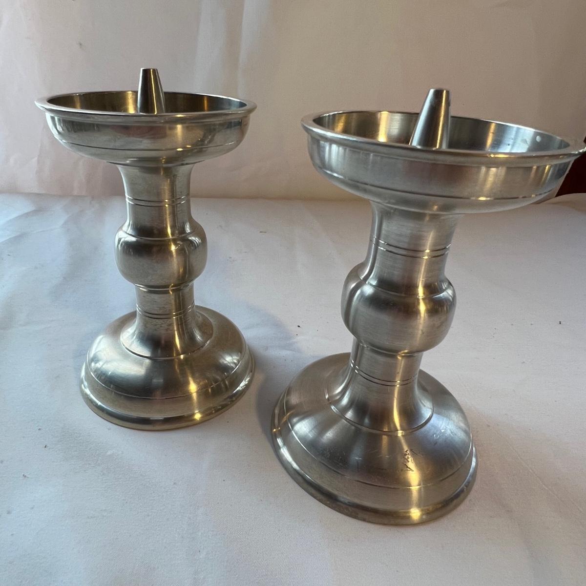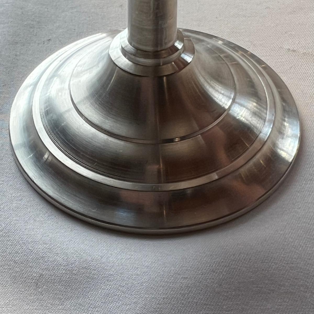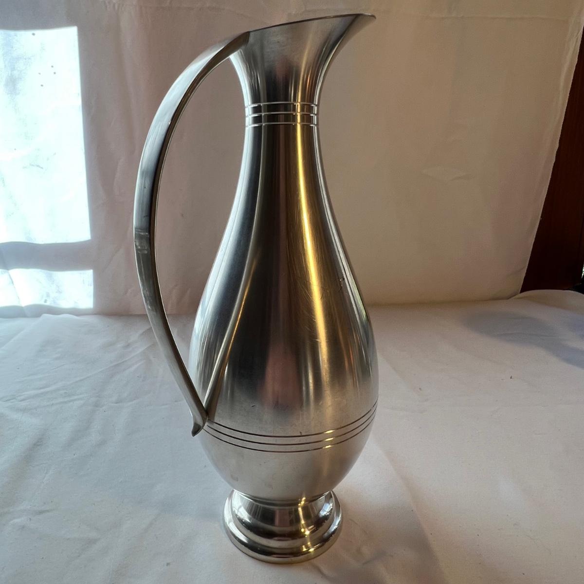 24 pieces of Selangor Pewter that includes a modern handled carafe, eight large stemmed cups (3” x 6”H), eight smaller stemmed cups (2.5” x 5”) and more.