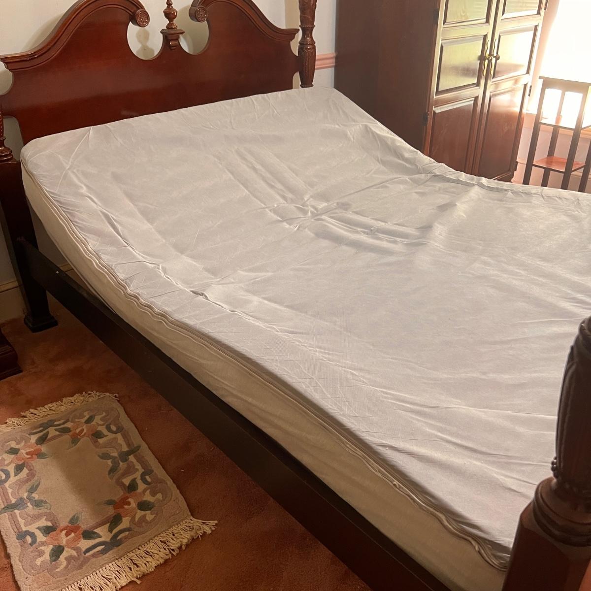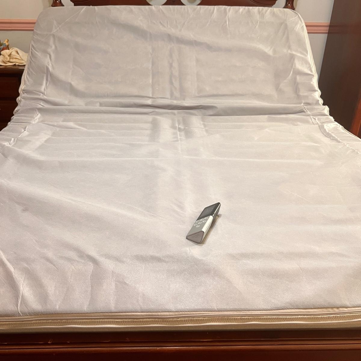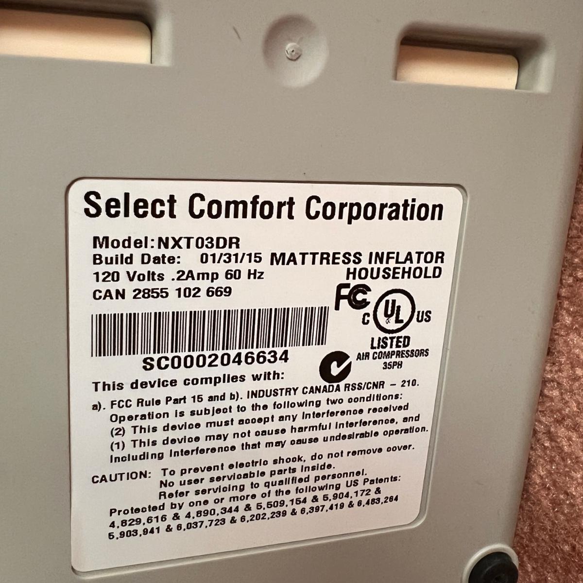 Sleep Number Select Comfort queen size base with air pump and wireless Remote Control - Model NXT03DR. According to the tag it was purchased in 2016. The cover zips off. This auction is for the base only, not the bed frame. The antique chippendale style frame is listed in lot #69.