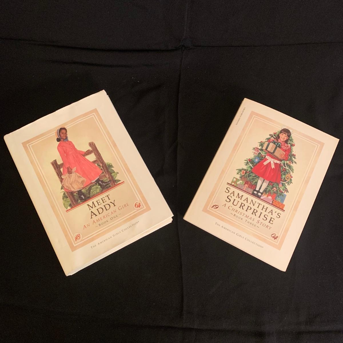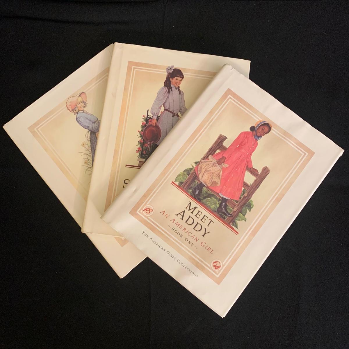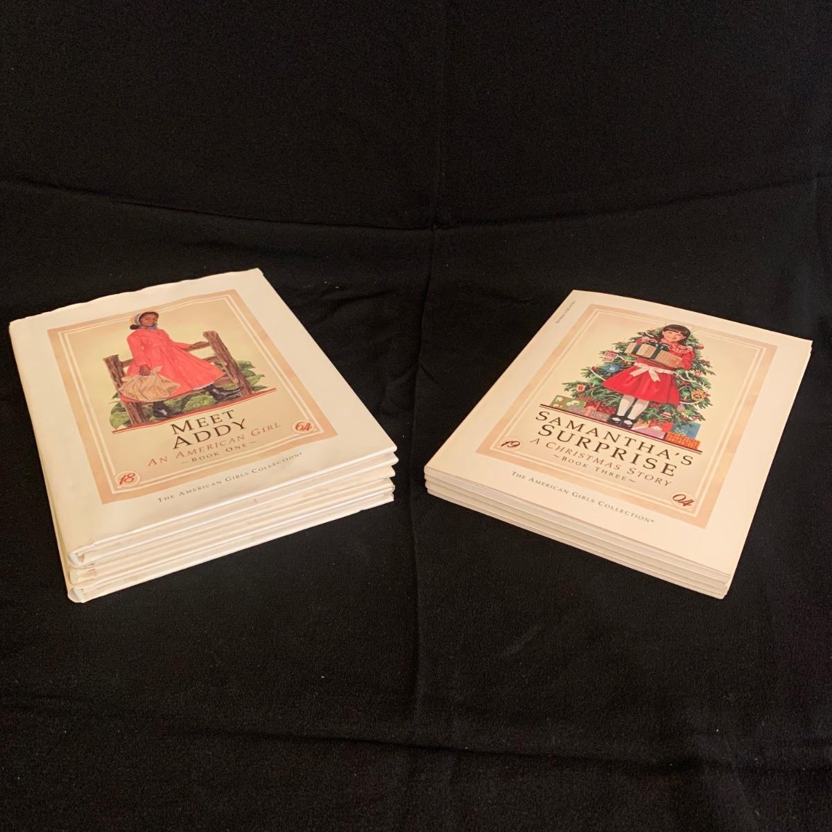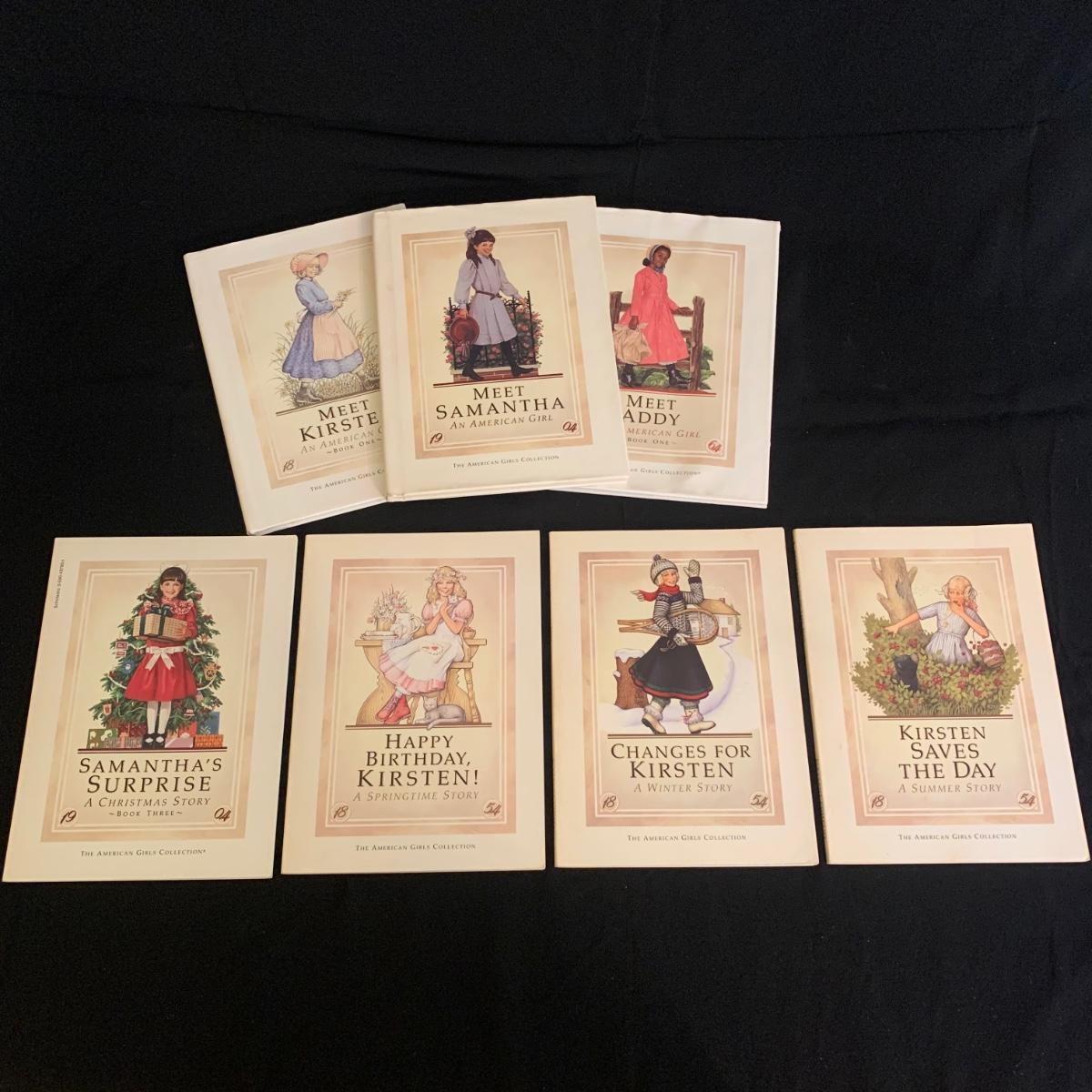 Selection of An American Girl story books includes three hard cover books and four paperbacks. Titles include “Meet Addy”, “Meet Samantha”, “Meet Kirsten”, “Samantha’s Surprise”, “Happy Birthday Kirsten”, “Changes for Kirsten”, and “Kirsten Saves the Day”. Shipping available.