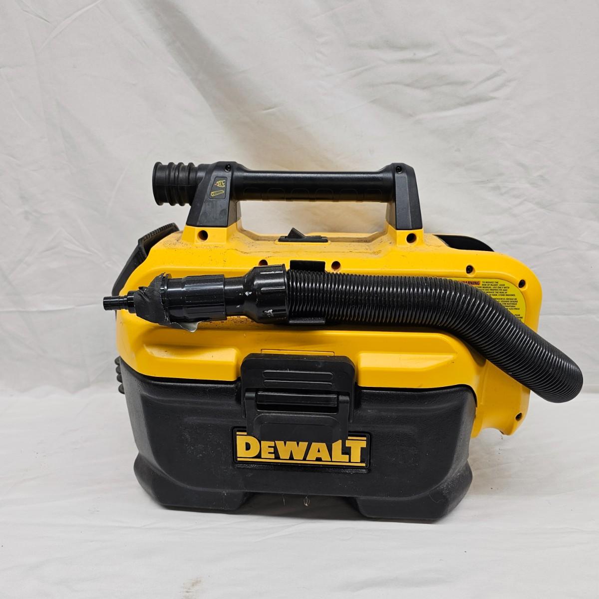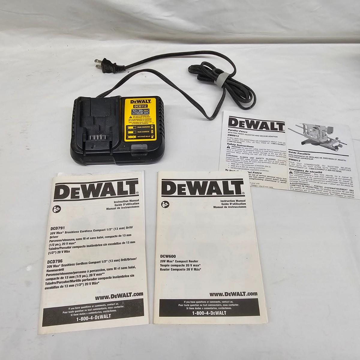Three DeWalt portable cordless tools for home or jobsite use. One 2 gallon wet/dry vacuum with attachments, measures 18" x 12" x 13"H. One router with base attachment and dust port, includes one bit. One drill/driver and box. Also includes one DCB112 charging station and one 20V lithium battery. Manuals for router and drill also. All items powered on when tested. See photos for details. Local pickup only.