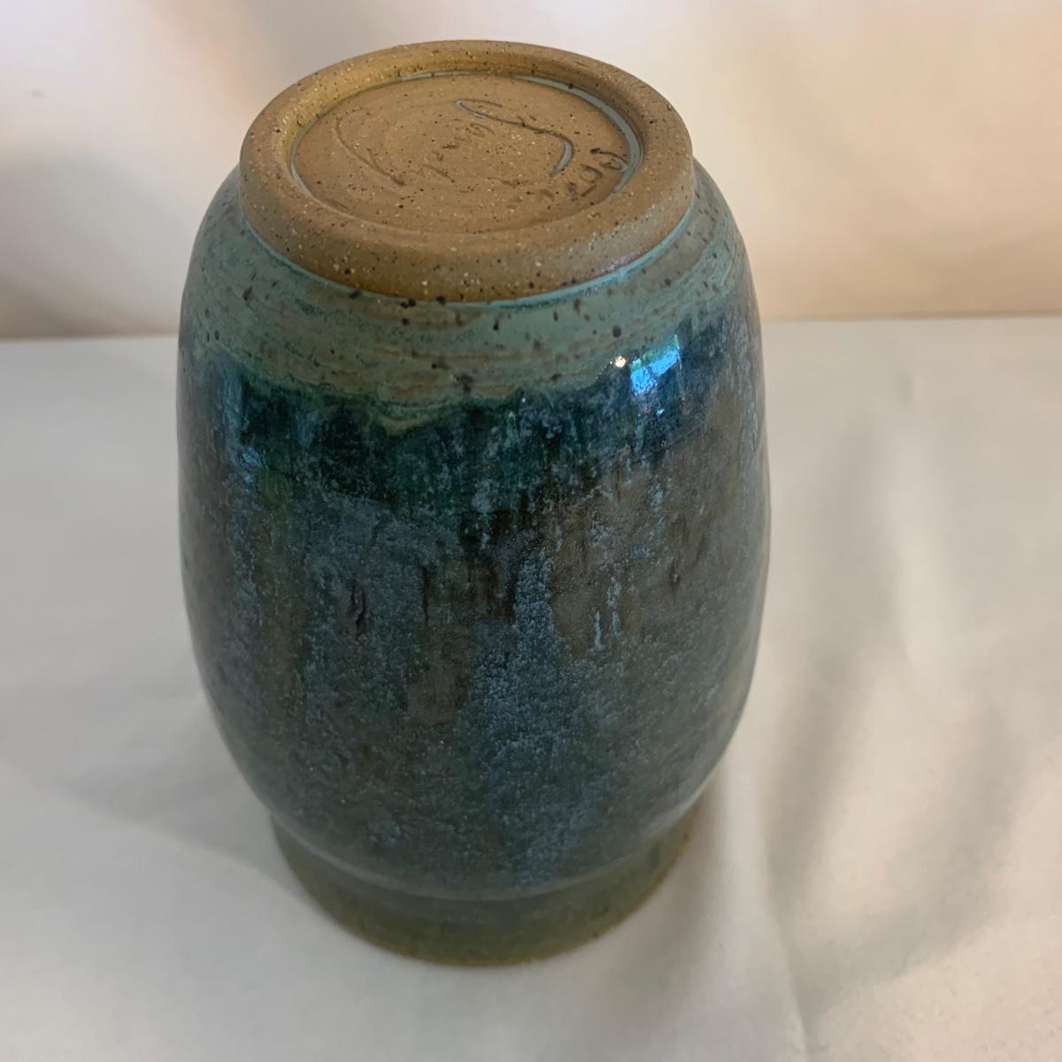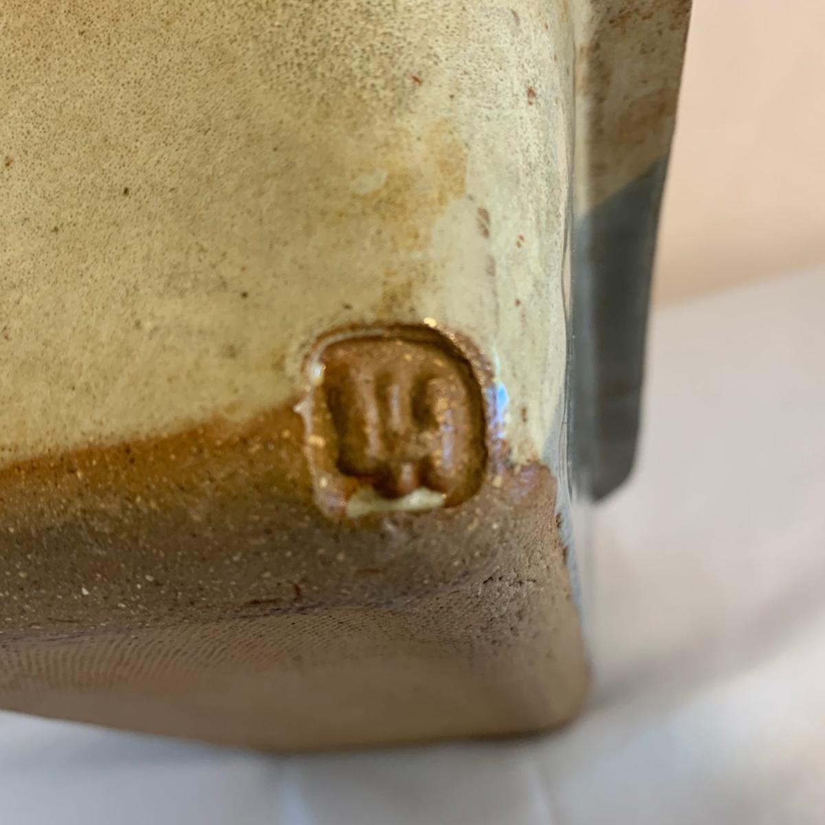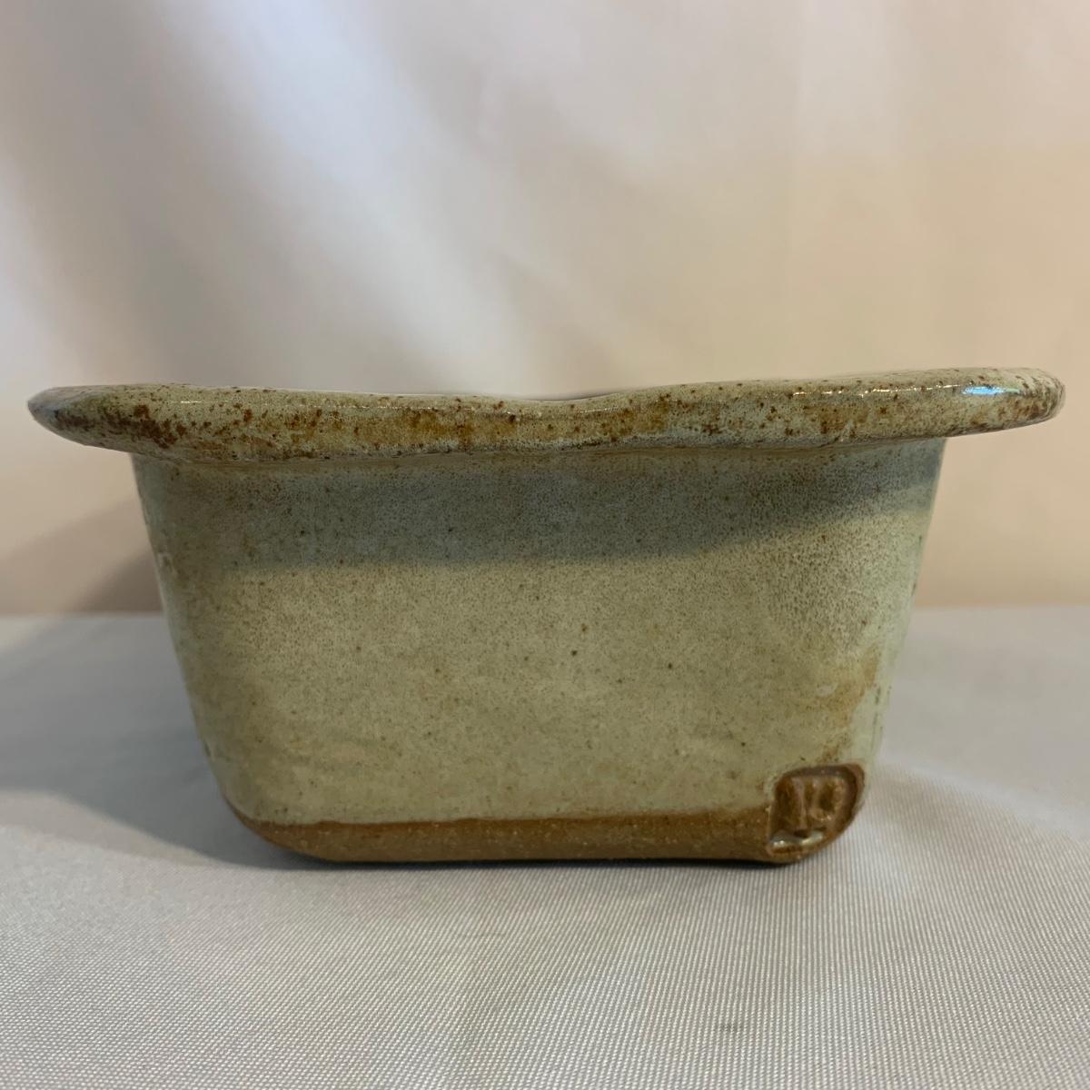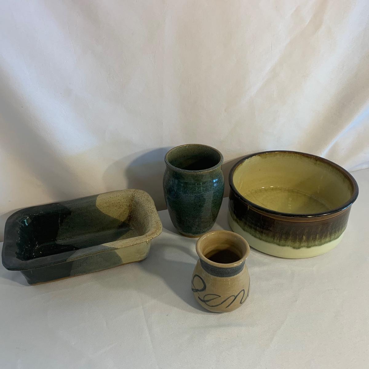 Lovely selection of glazed pottery. All items have been signed or stamped by the artist. Lot includes large bowl, potted load pan, vase, and mug. Some items have blemishes. Small mug does have a minor chip. Please see photos for more details. Large bowl measures, 8.5”D x 4”H. Shipping available.