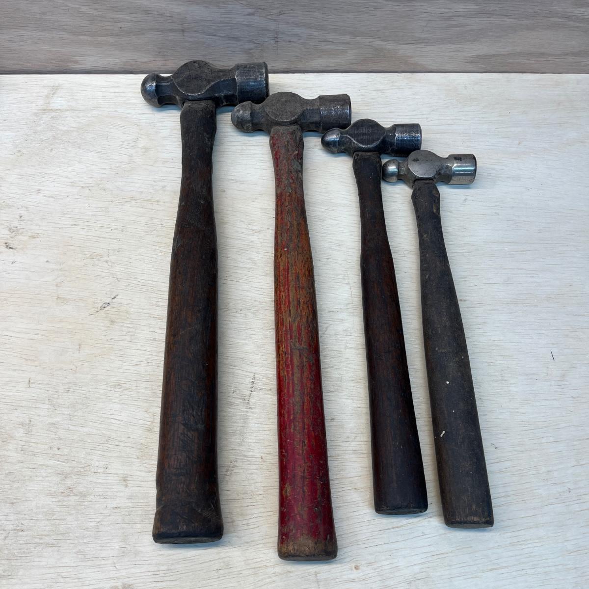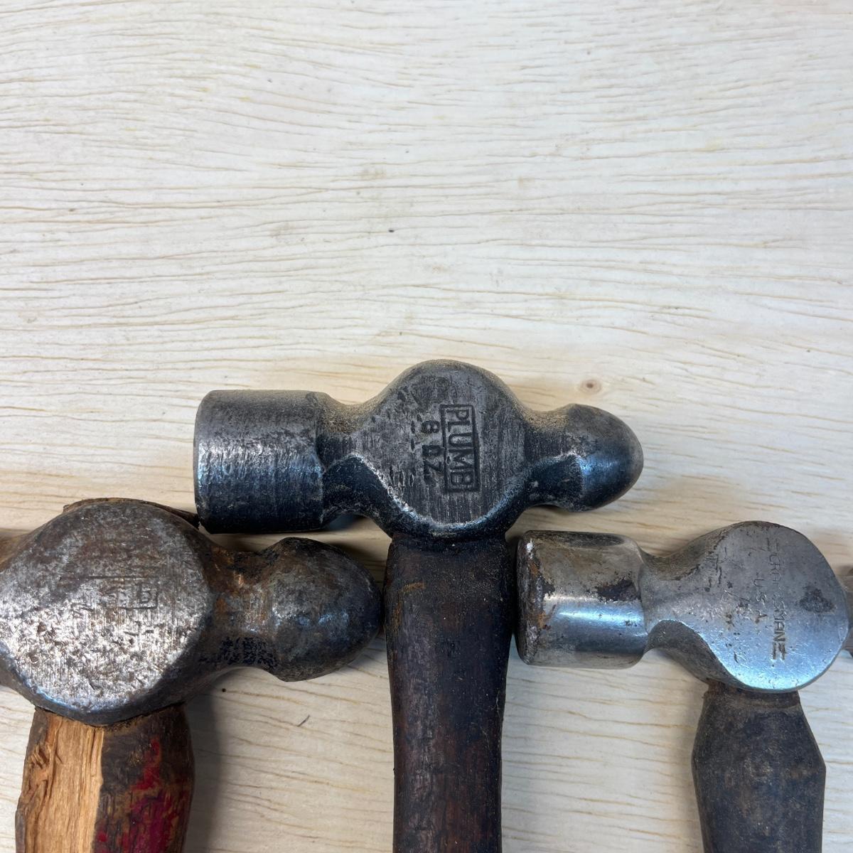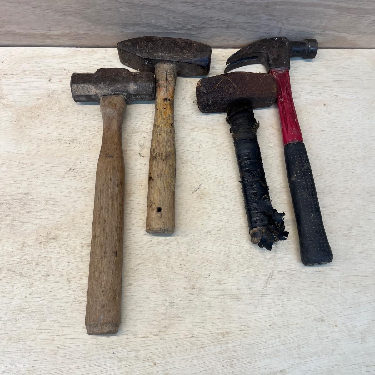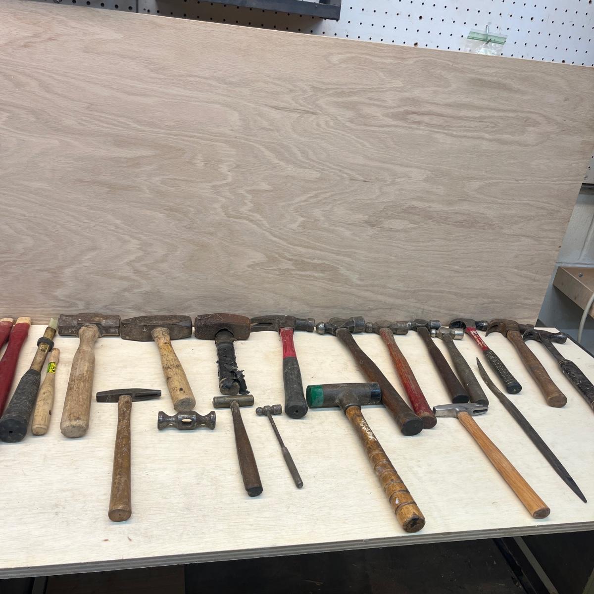Lot includes four ball peen hammers, three regular hammers, two blacksmith hammers, Lixie soft end hammer, three small sledge type hammers and extra handles. Largest sledge type hammer measures 4.5” x 1.5” x 14” long.