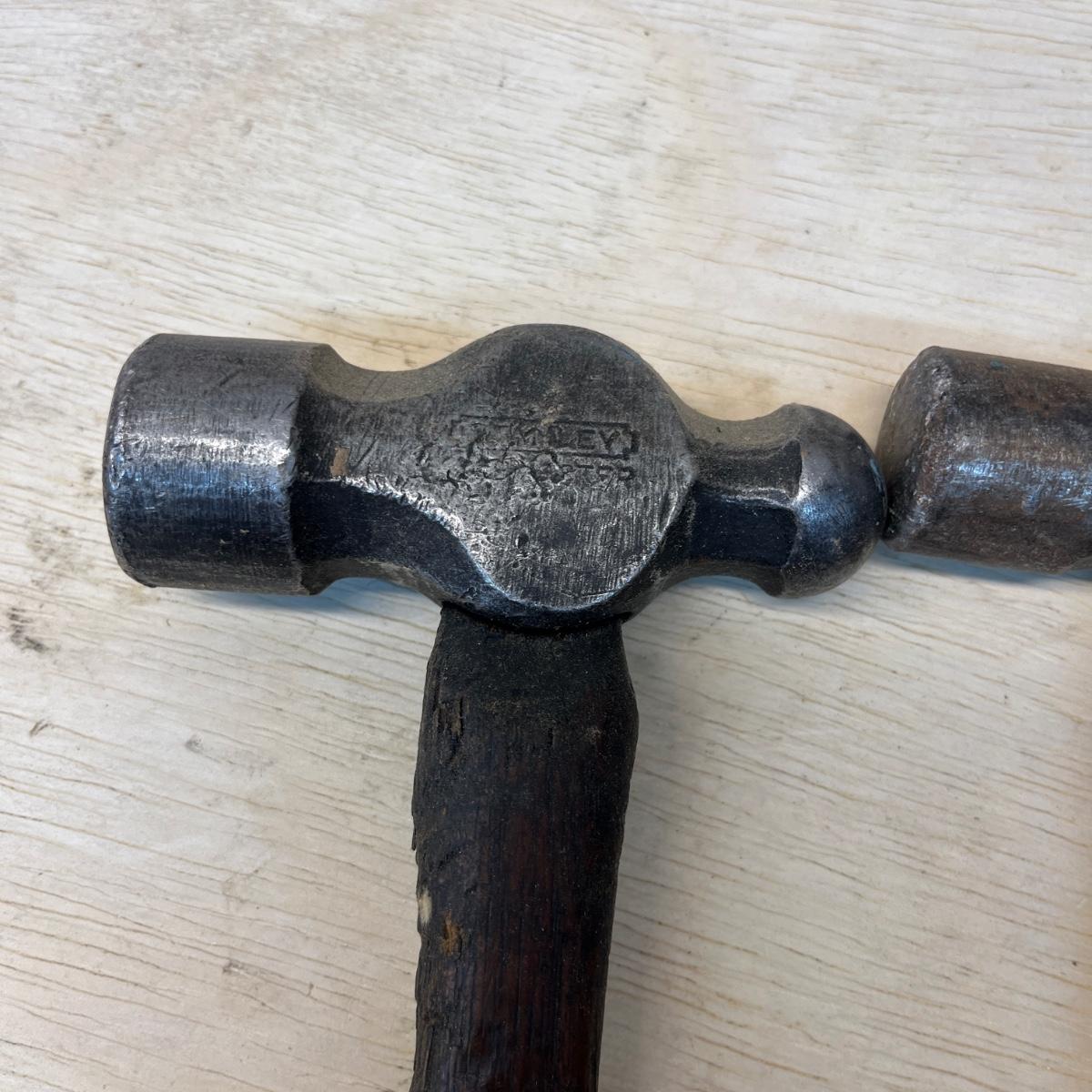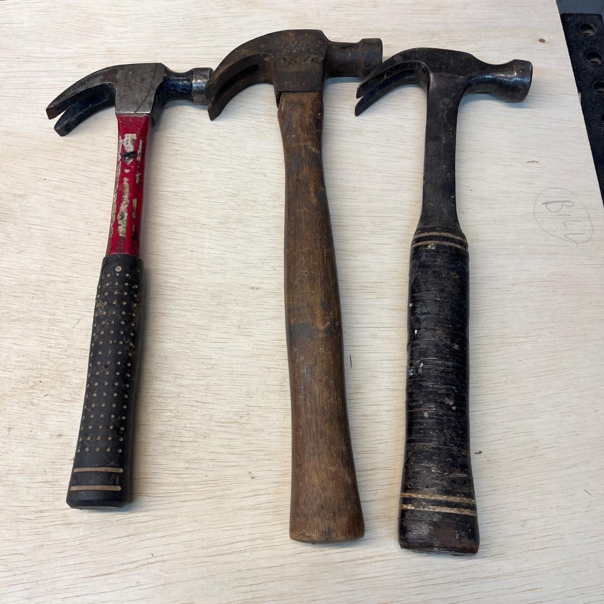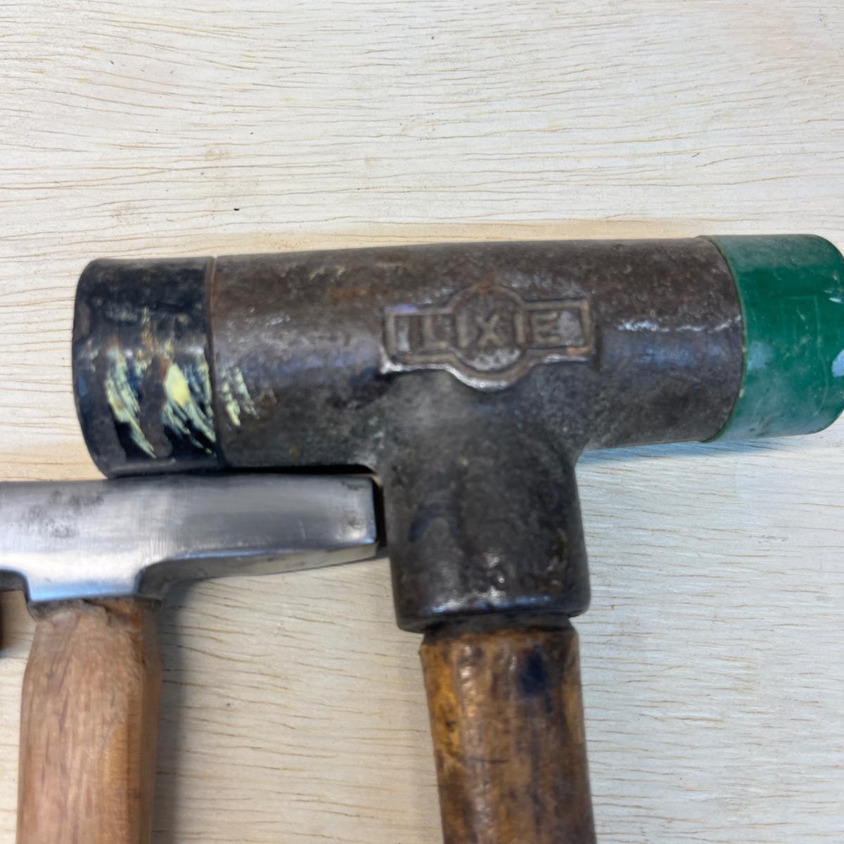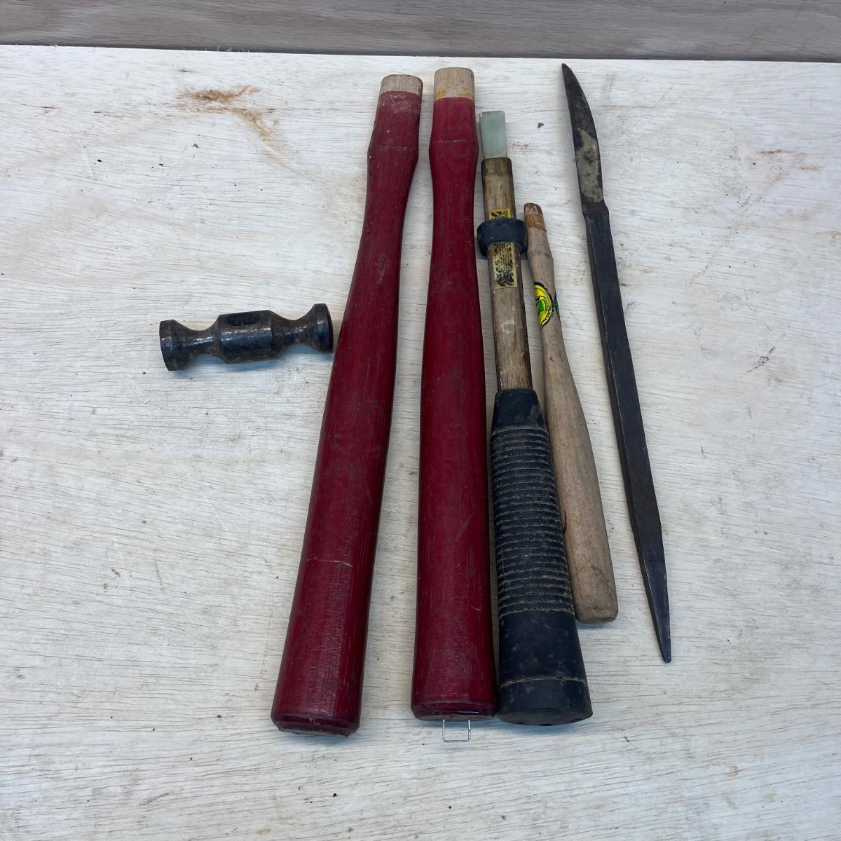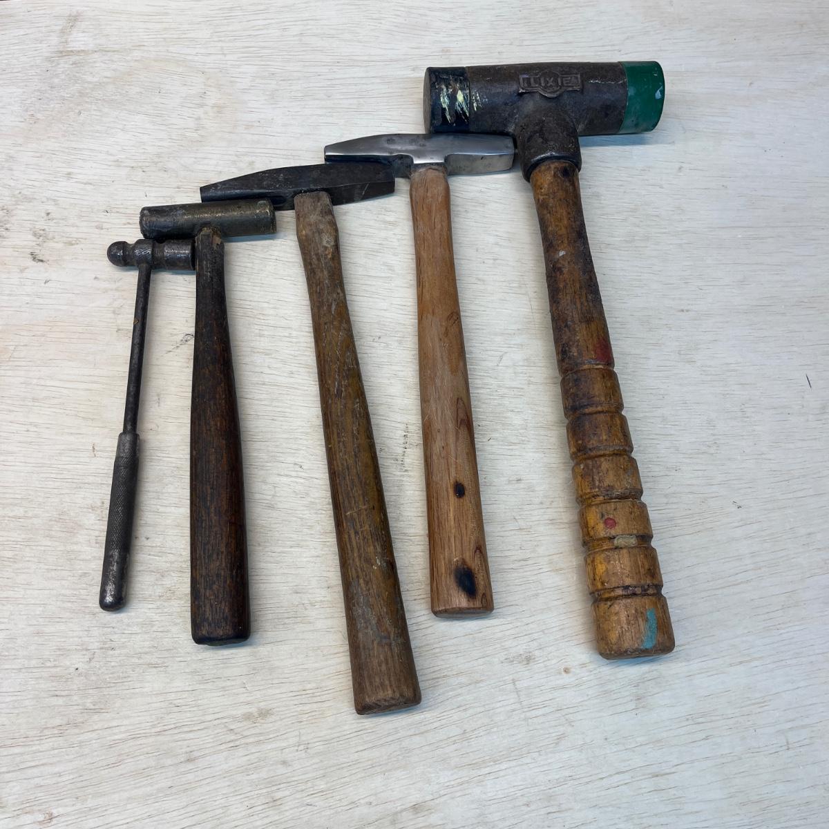 Lot includes four ball peen hammers, three regular hammers, two blacksmith hammers, Lixie soft end hammer, three small sledge type hammers and extra handles. Largest sledge type hammer measures 4.5” x 1.5” x 14” long.