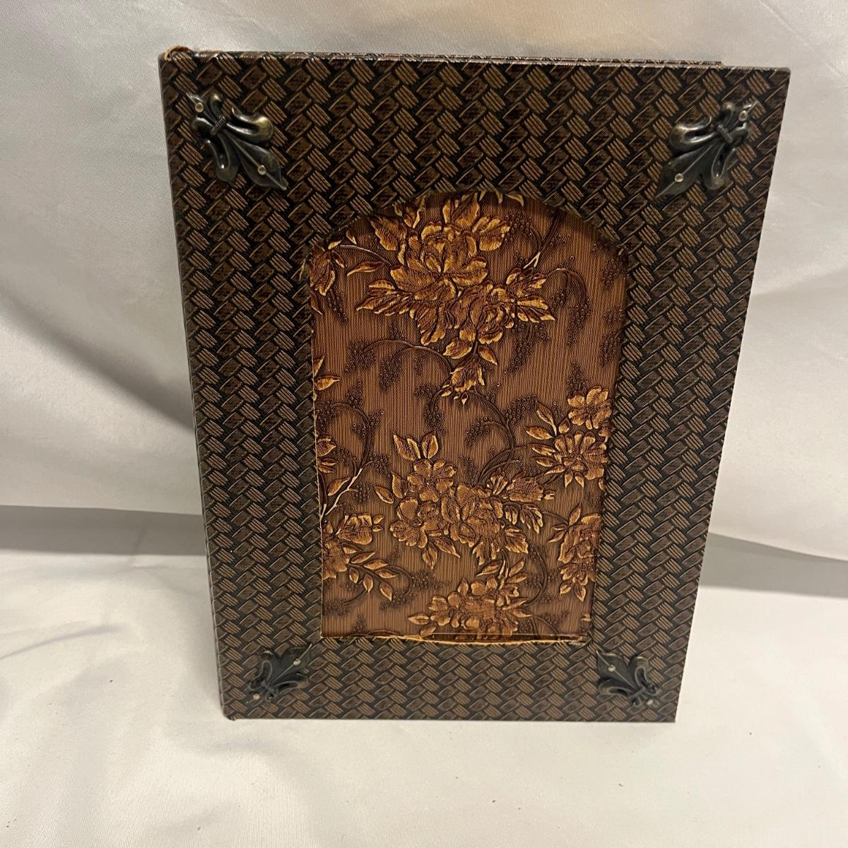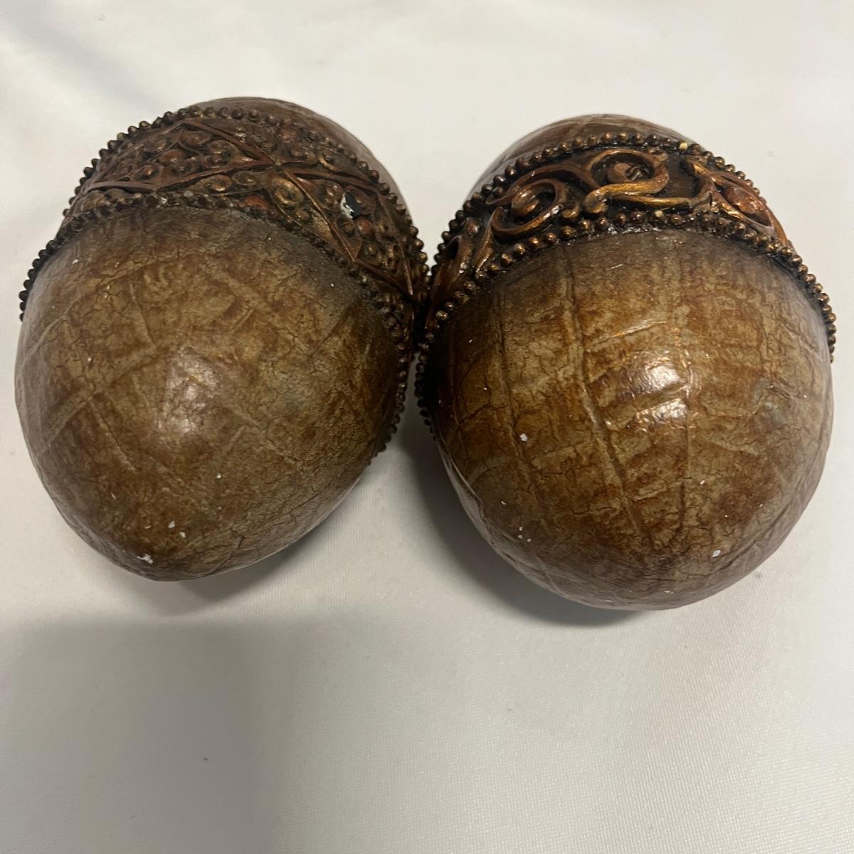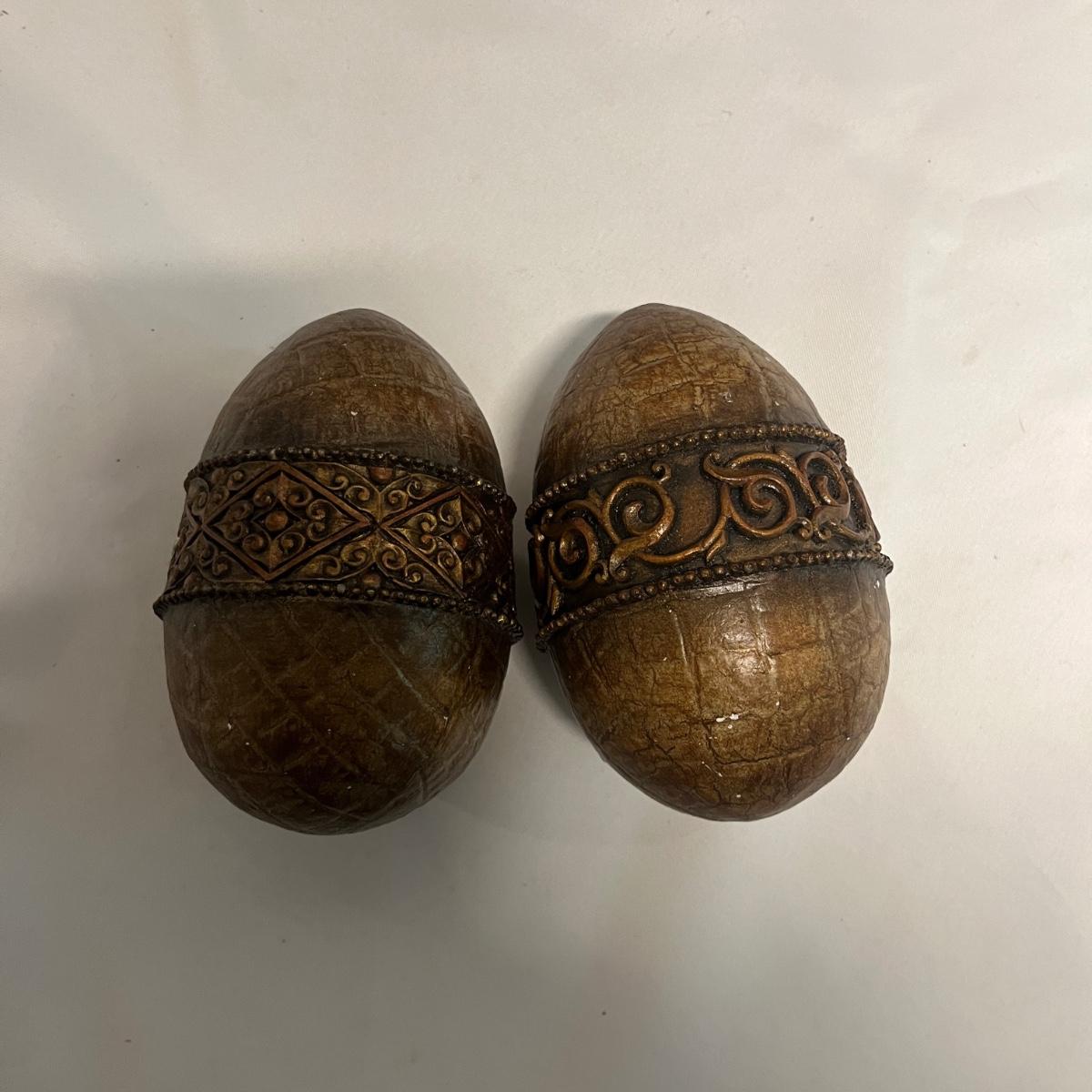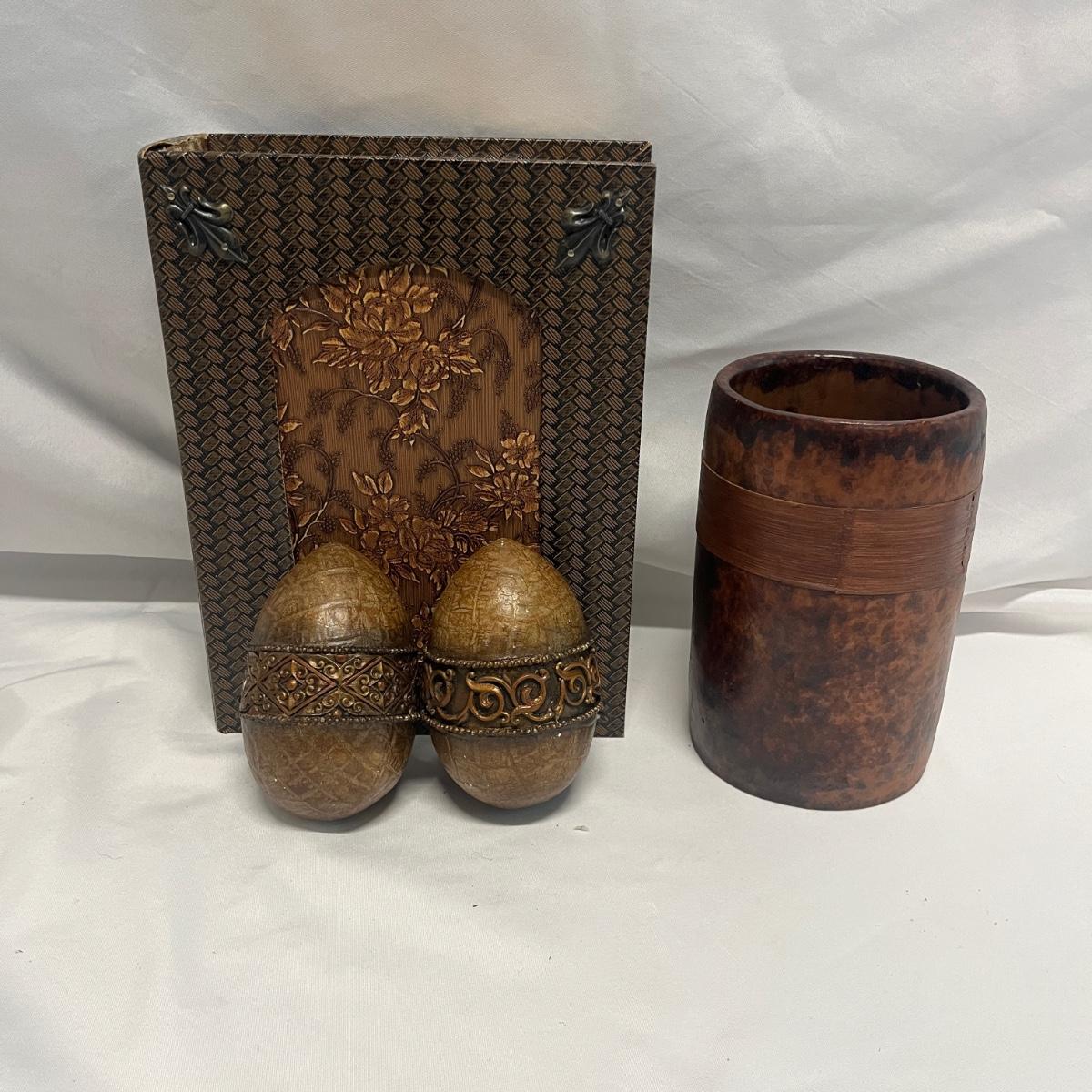 Lot includes a book-shaped box, Foreside ceramic vase and two resin egg shaped decor items. Book box measures 8” x 11” x 3.75”H and has a loose piece on cover, see pictures.