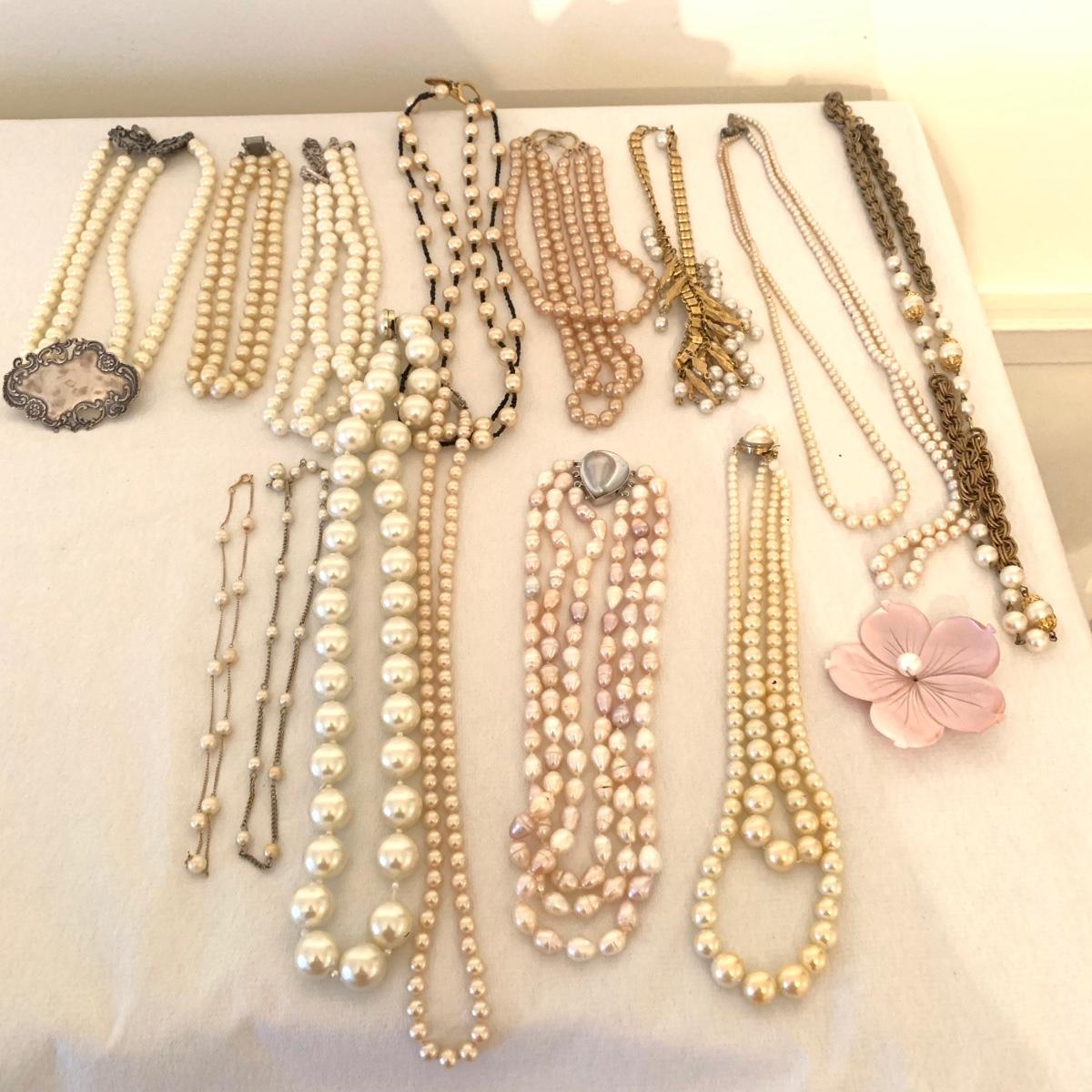 Large selection of Pearl necklaces. Lot includes 15 necklaces with freshwater Pearls saltwater pearls and faux pearls designed by Foreé Sterling, Marvella, and more. Shortest necklace measures, 16” and longest 31”. Please see photos for more details.