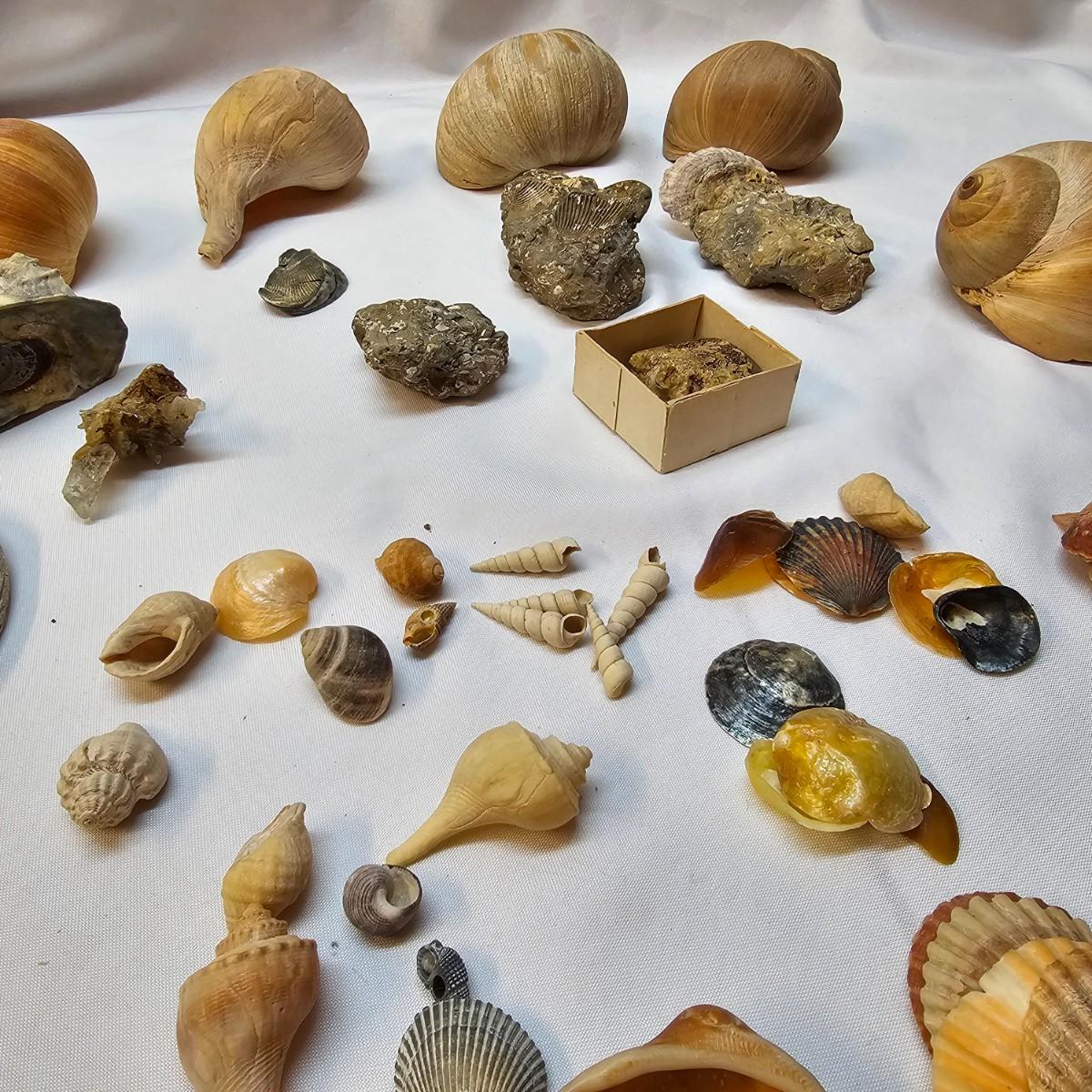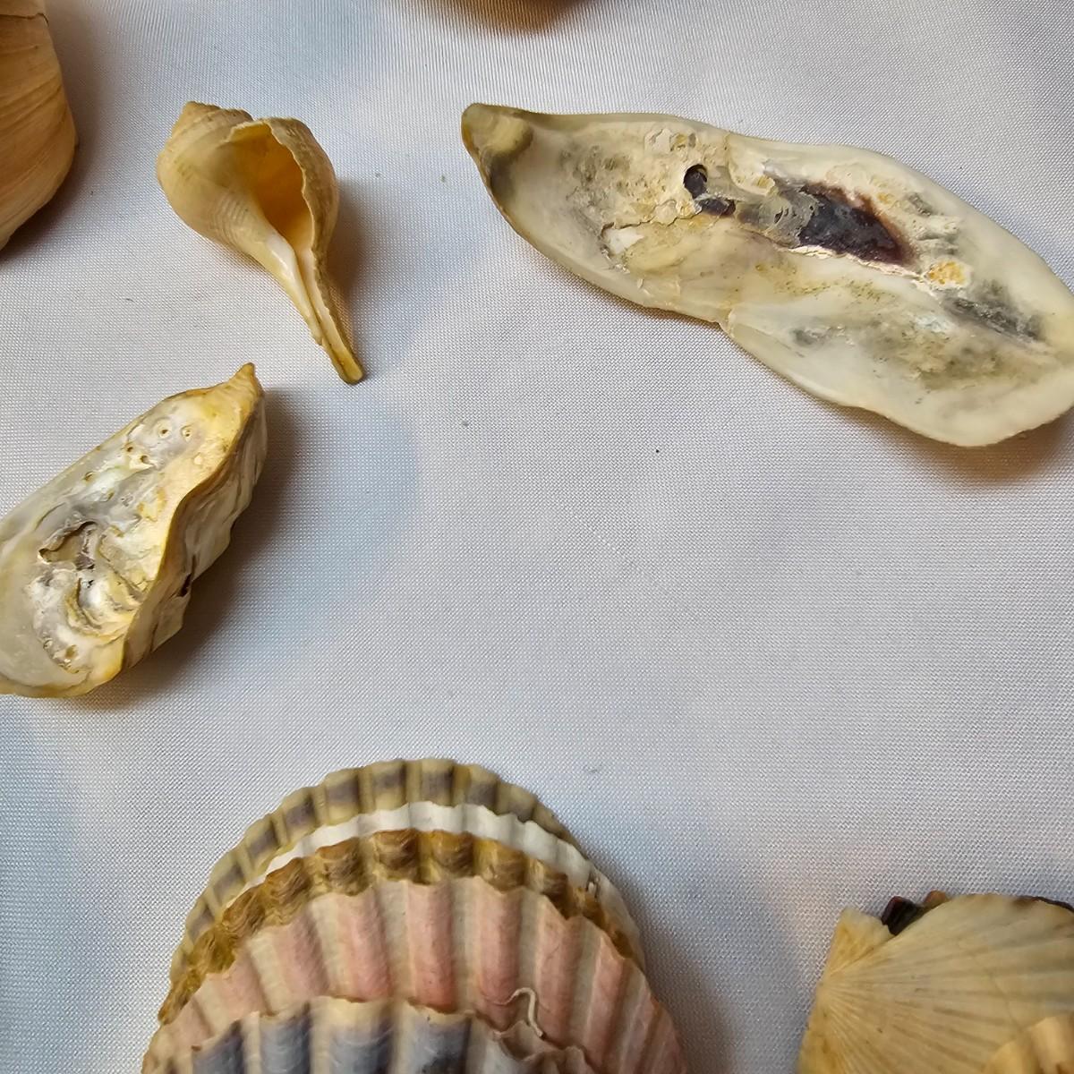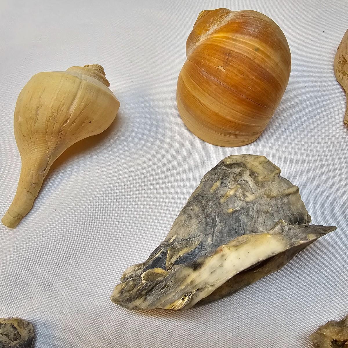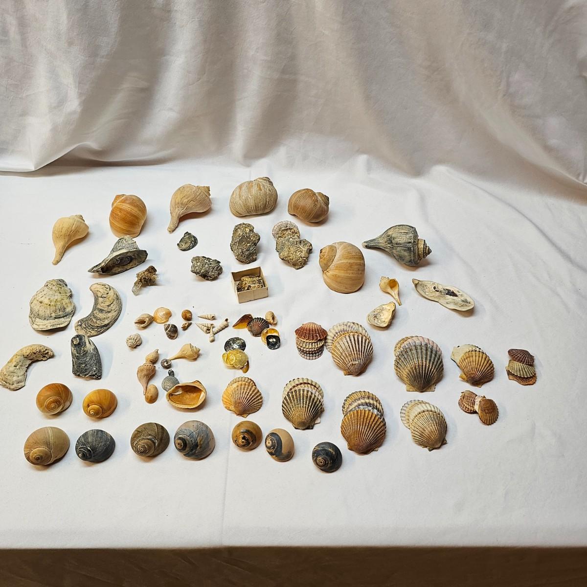 A diverse collection of shells from the sea. Scallops, snail, whelk, shark's eye moon, more. Lots of different sizes and colors. Also includes a few pieces that appear to be fossilized shells in concretion and a piece with a note that states: Baculites from Montana. See photos for details. Shipping available.