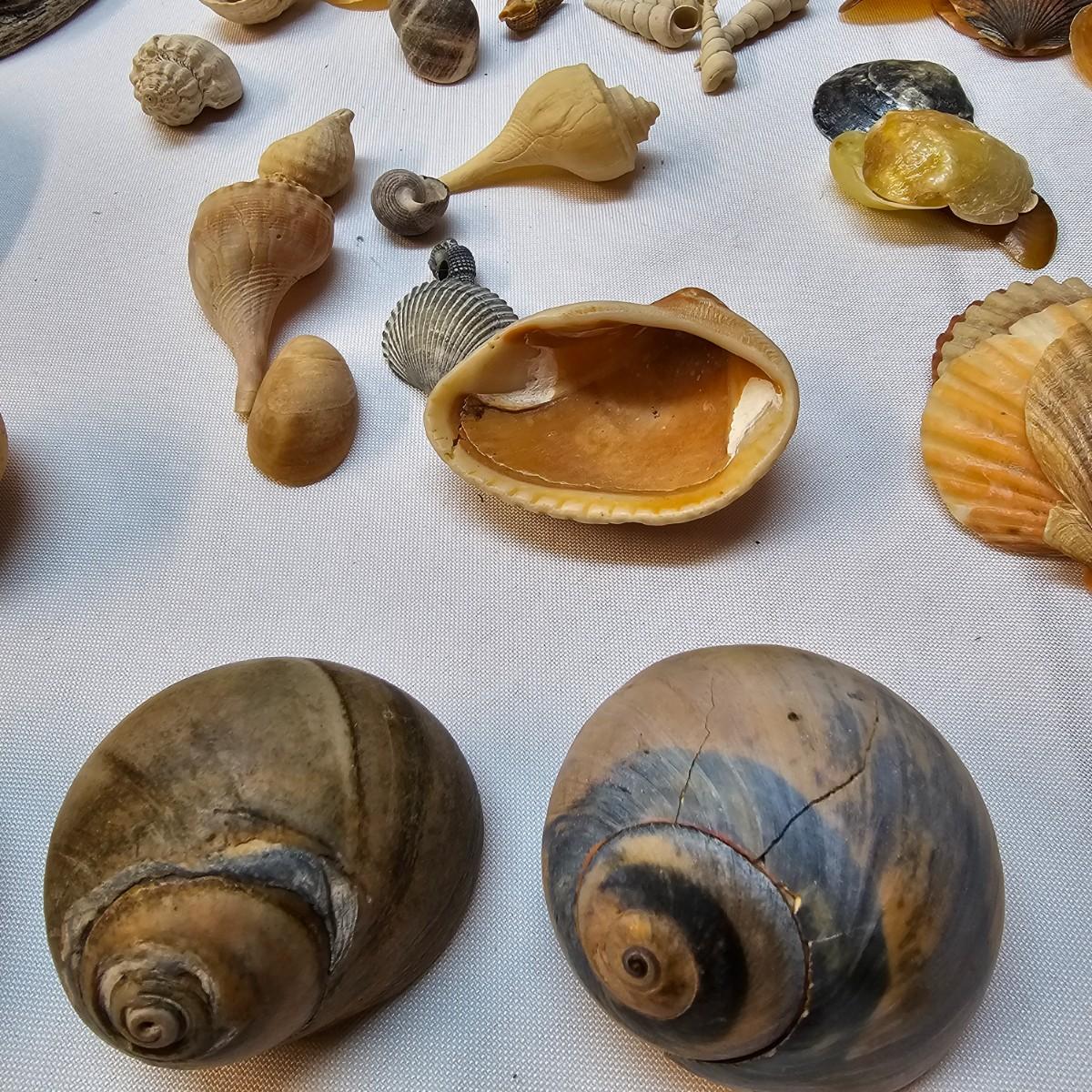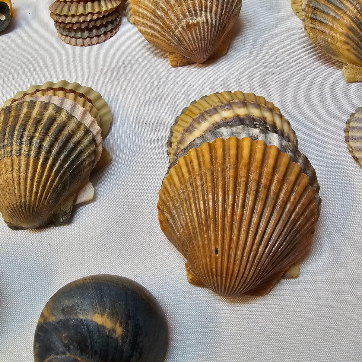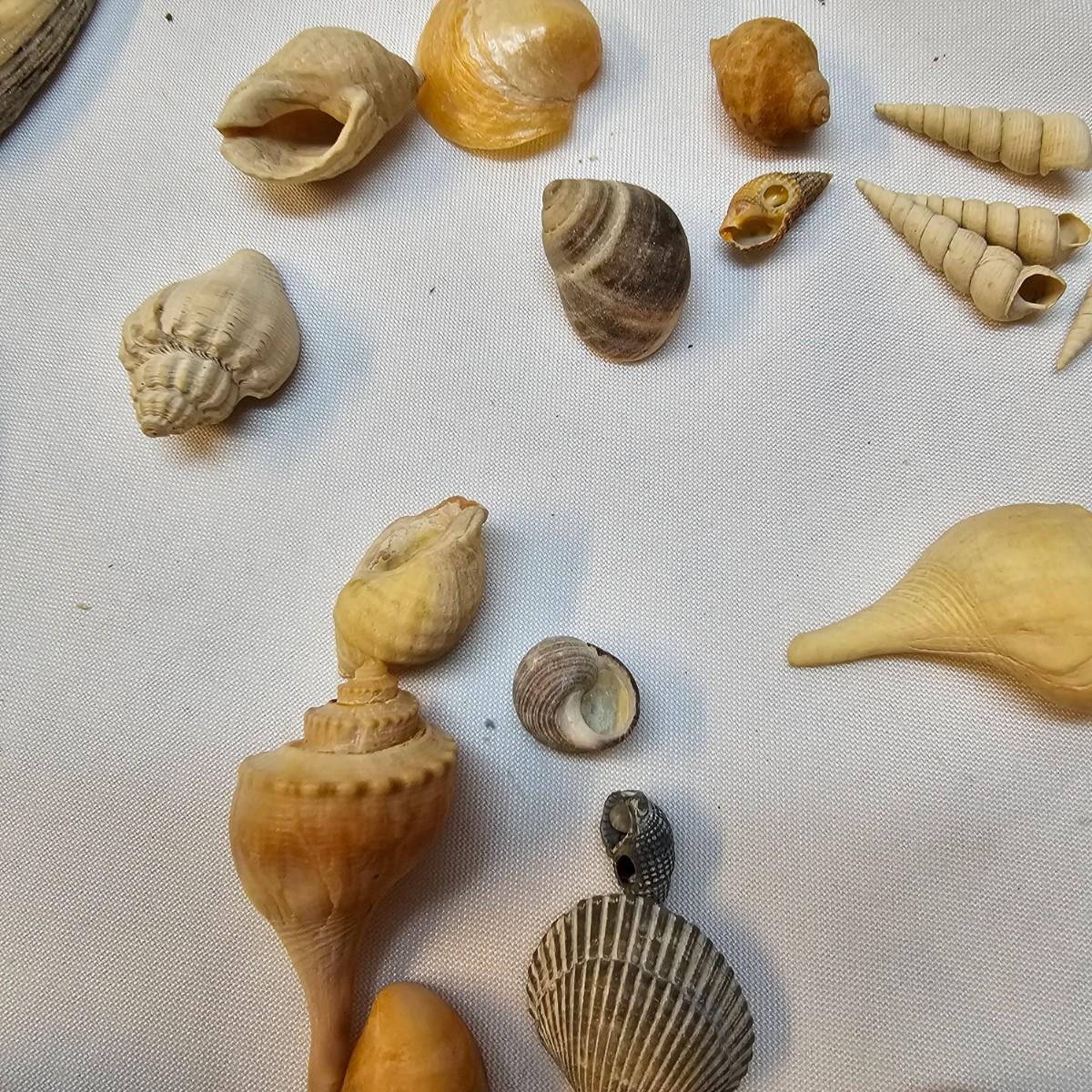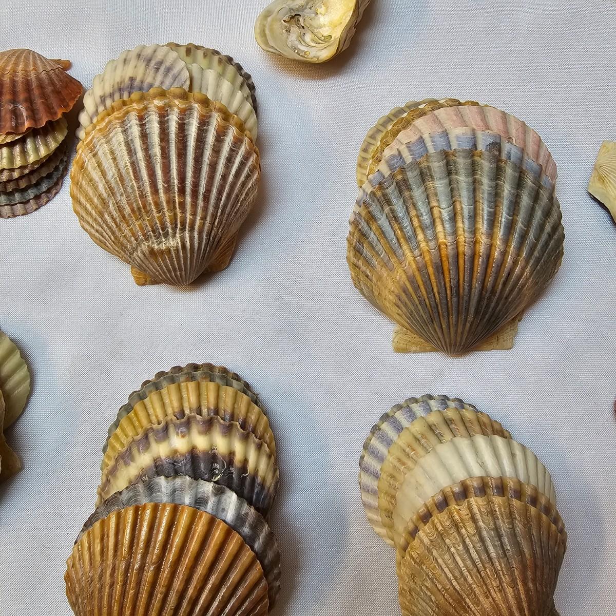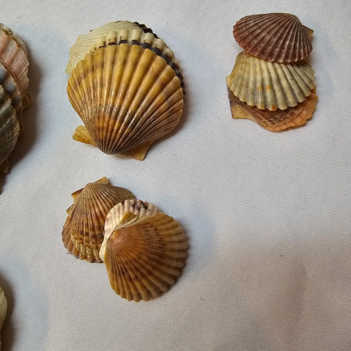 A diverse collection of shells from the sea. Scallops, snail, whelk, shark's eye moon, more. Lots of different sizes and colors. Also includes a few pieces that appear to be fossilized shells in concretion and a piece with a note that states: Baculites from Montana. See photos for details. Shipping available.