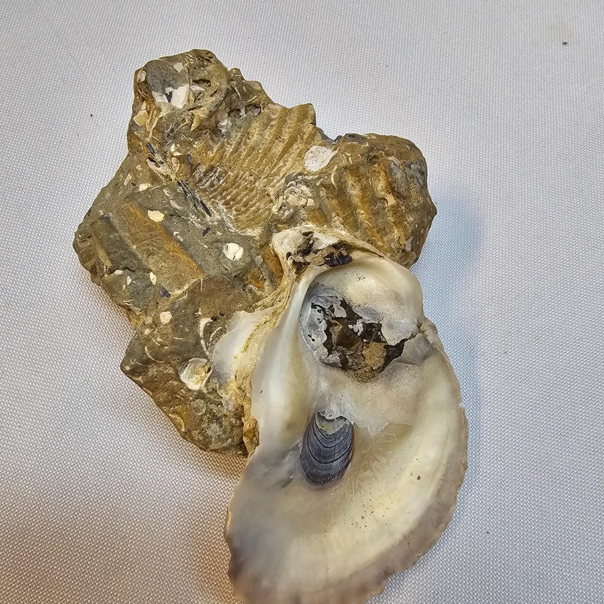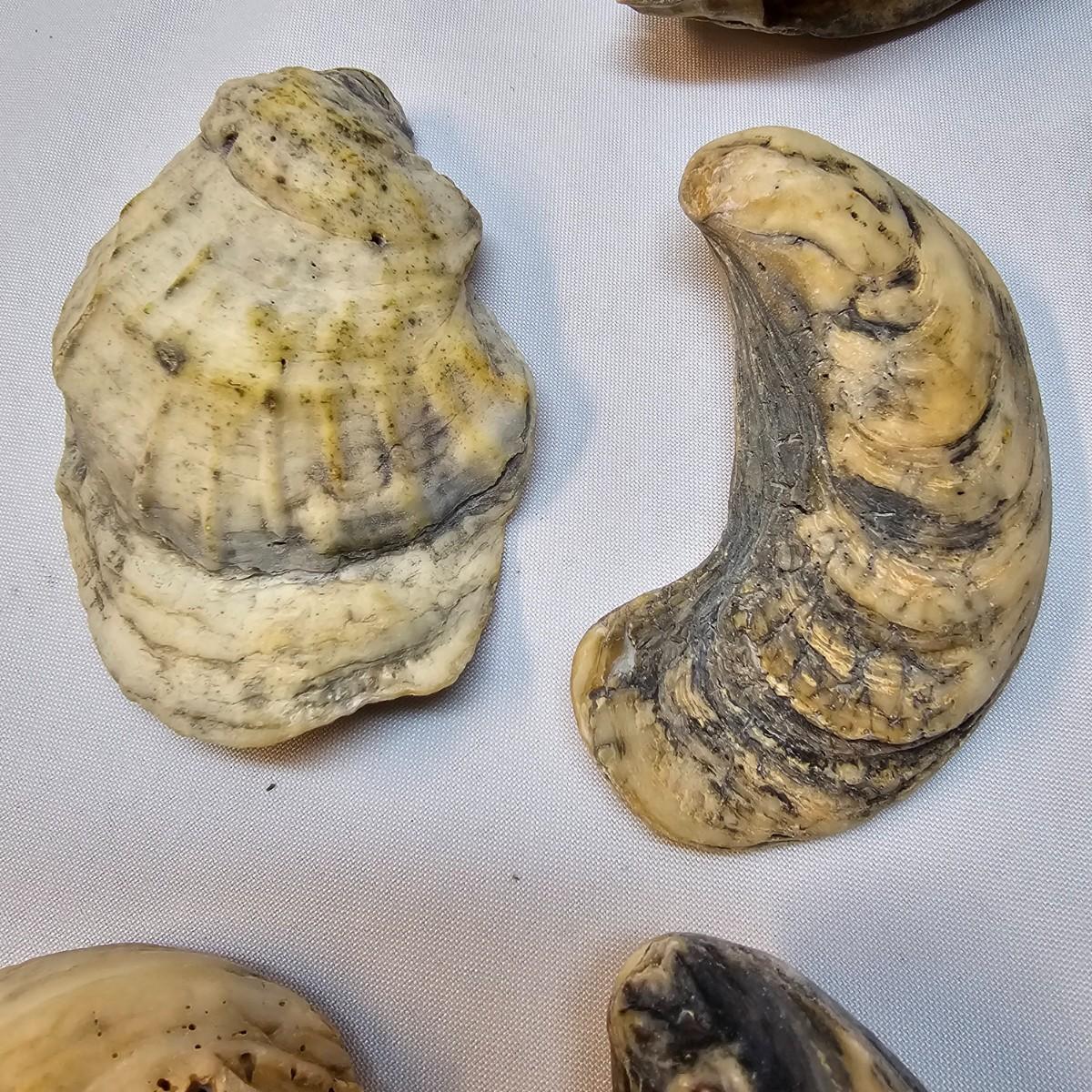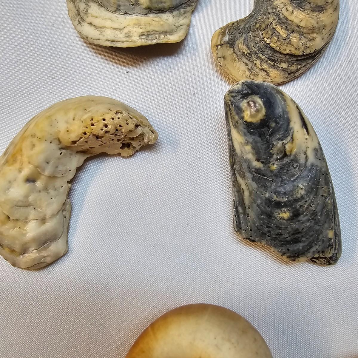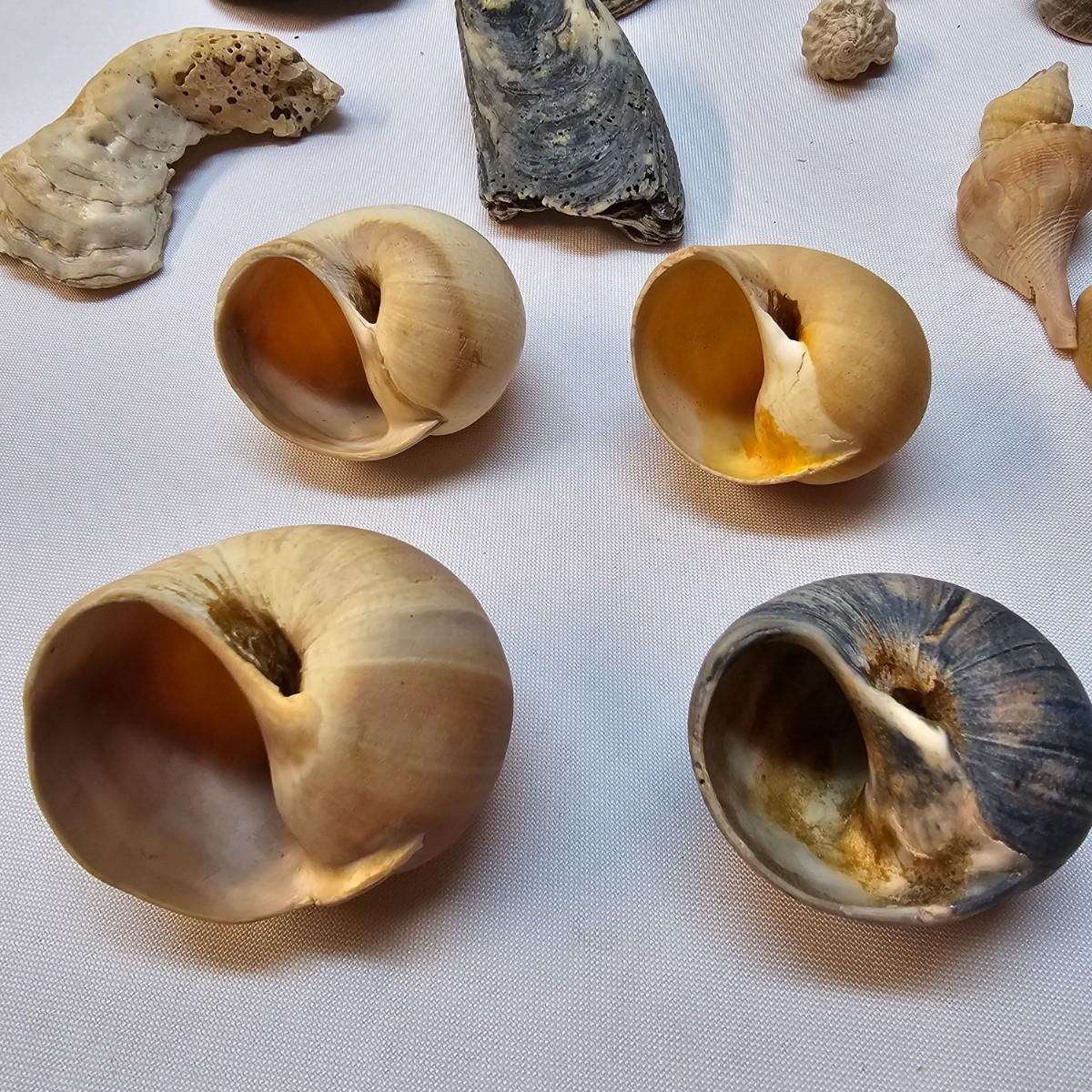 A diverse collection of shells from the sea. Scallops, snail, whelk, shark's eye moon, more. Lots of different sizes and colors. Also includes a few pieces that appear to be fossilized shells in concretion and a piece with a note that states: Baculites from Montana. See photos for details. Shipping available.