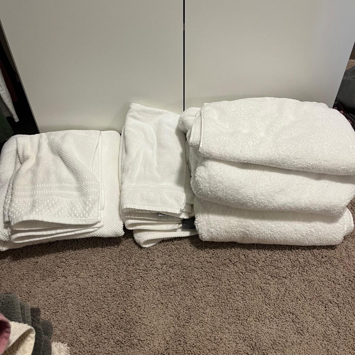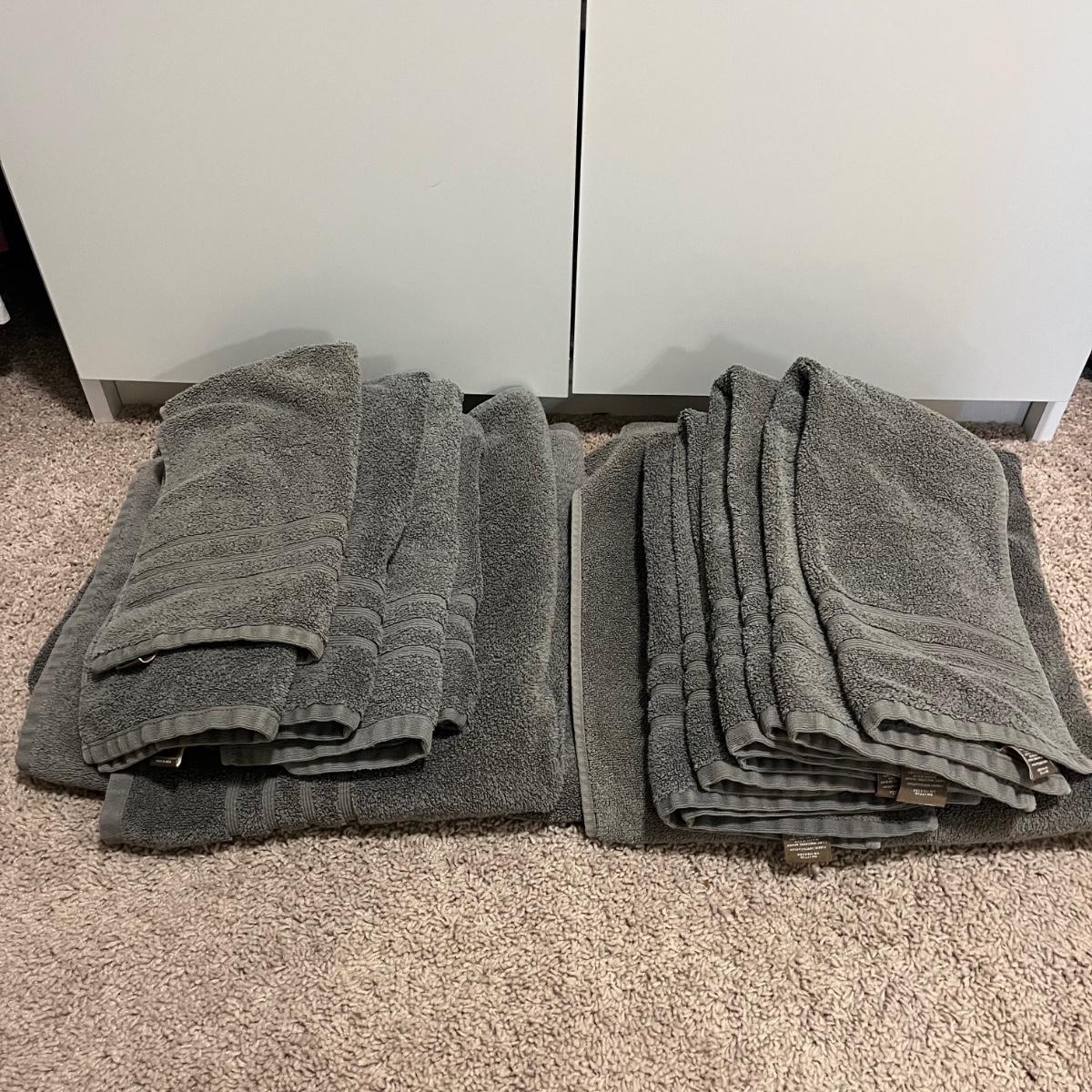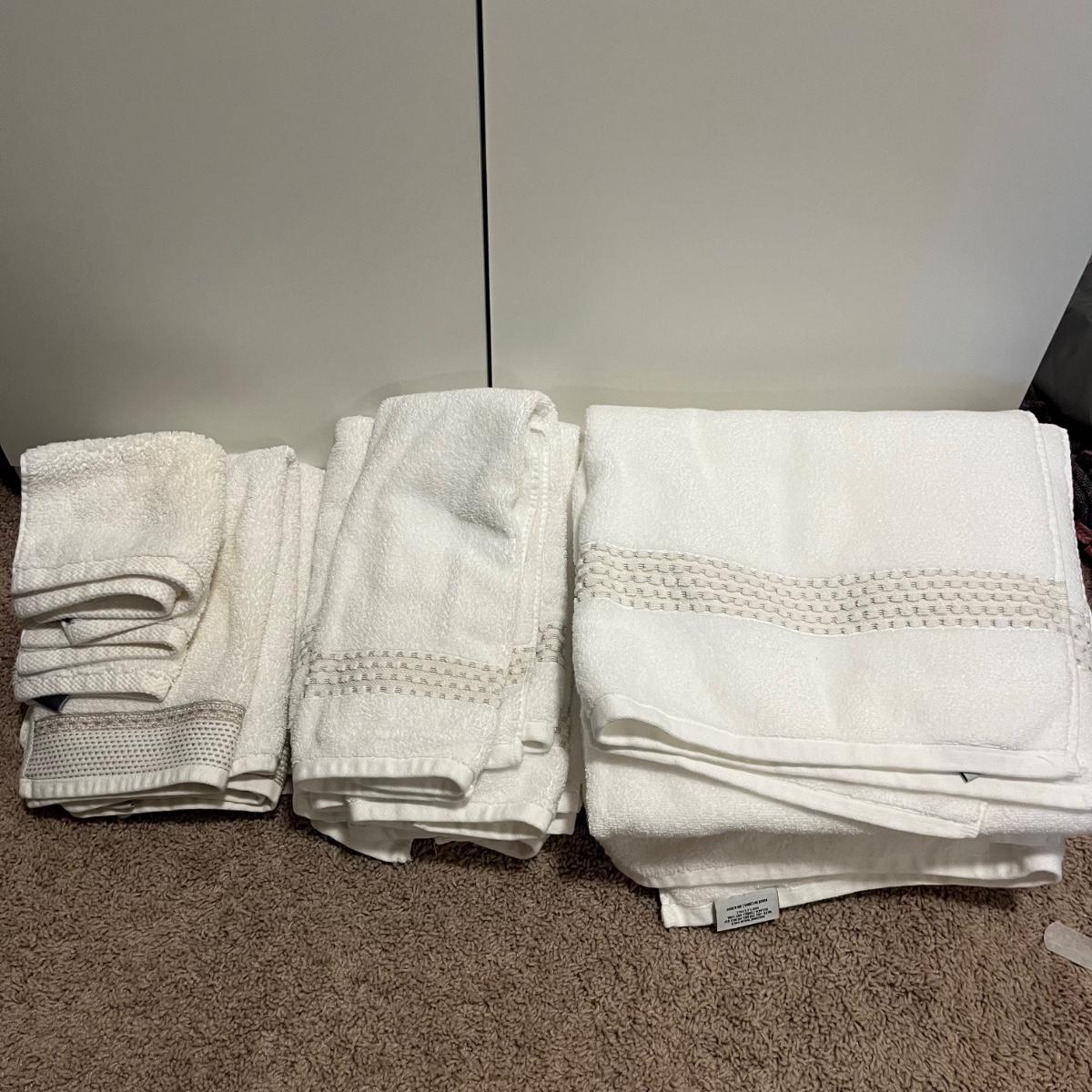 Lot includes a selection of bath towels, hand towels, bath mats and washcloths by Madison Park, Bella Lux, Fieldcrest and More. Largest bath towel measures 28” x 56”.