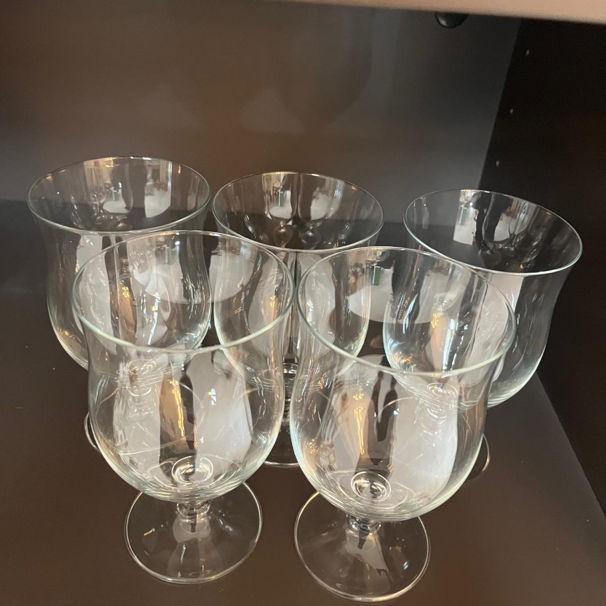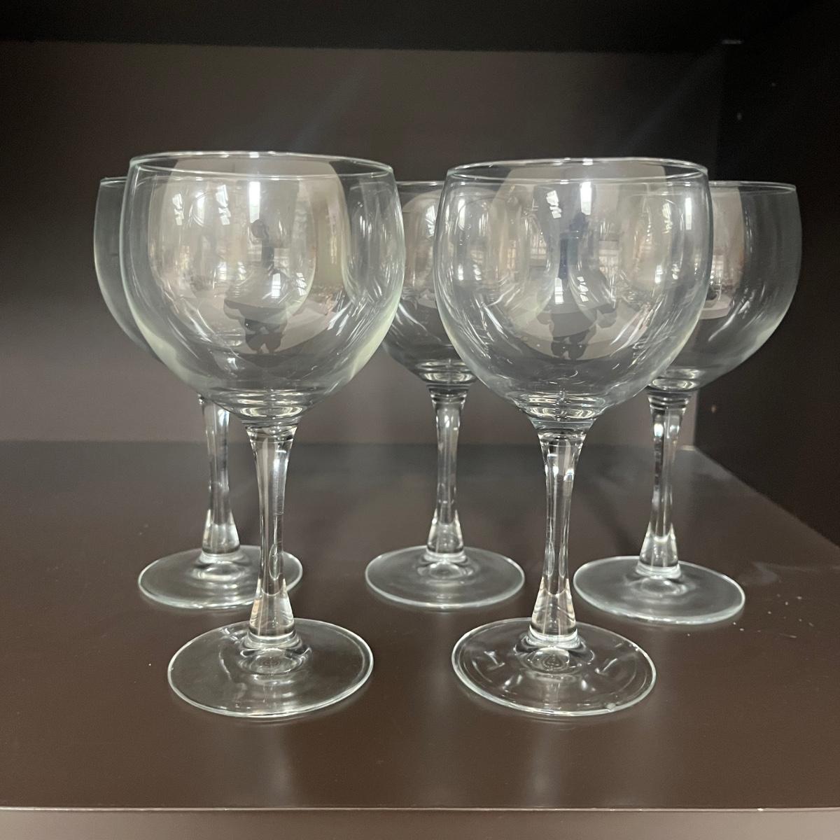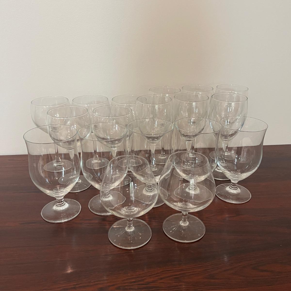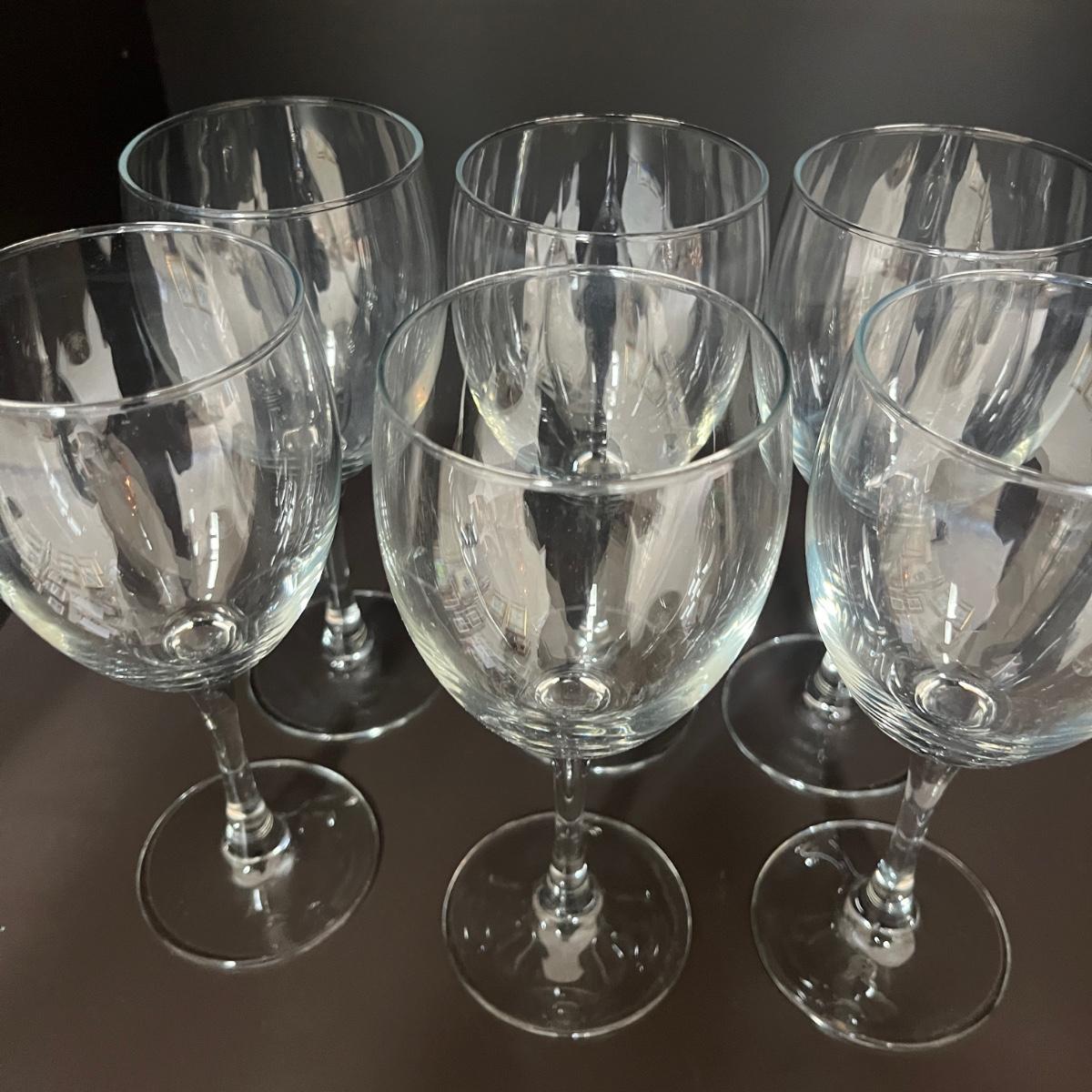 Lot contains a selection of wine glasses that includes set of six, two sets of five glasses and a pair of glasses. Tallest glass measures 3”D 7.25”H.