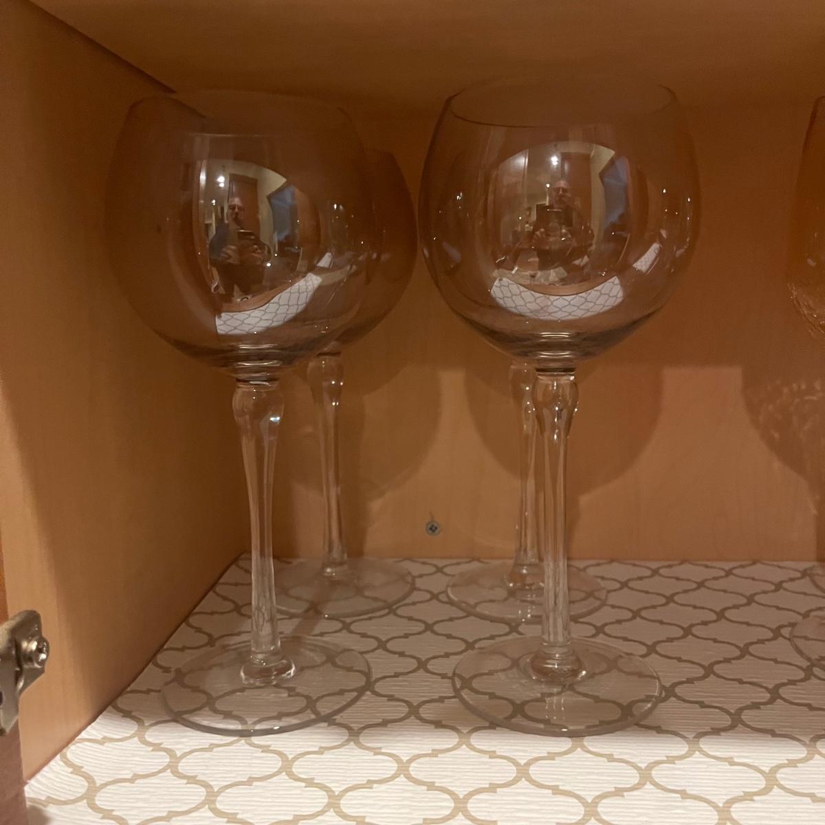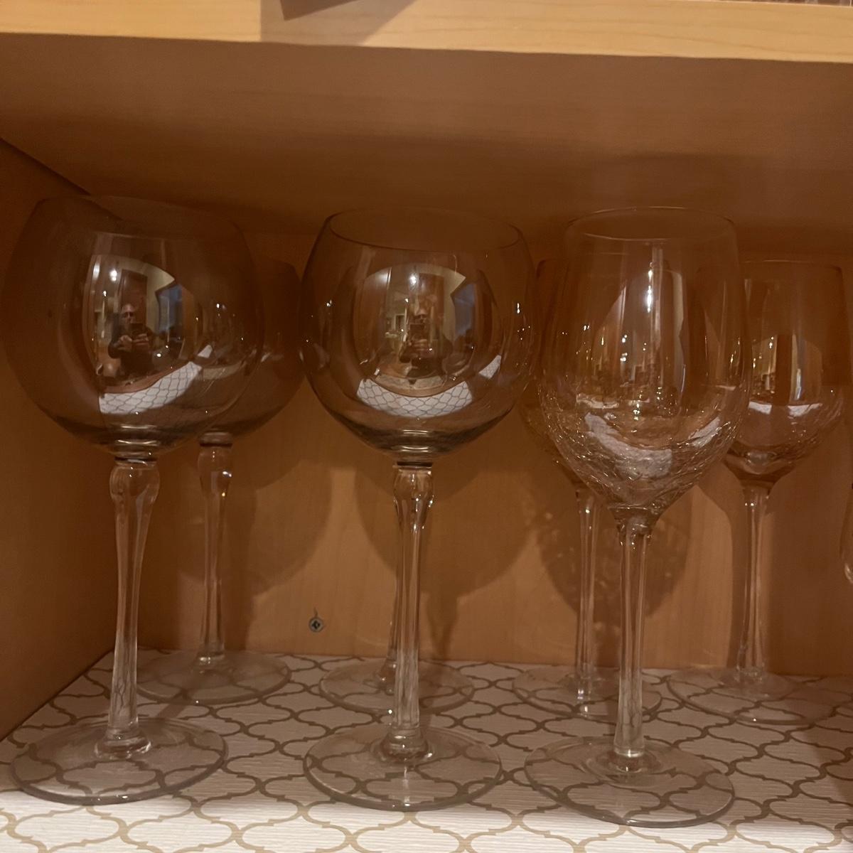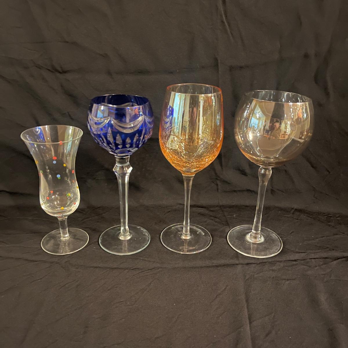 Lot contains a selection of four different styles of wine glasses that includes two sets of four and two sets of three. Tallest glass measures 9”H.