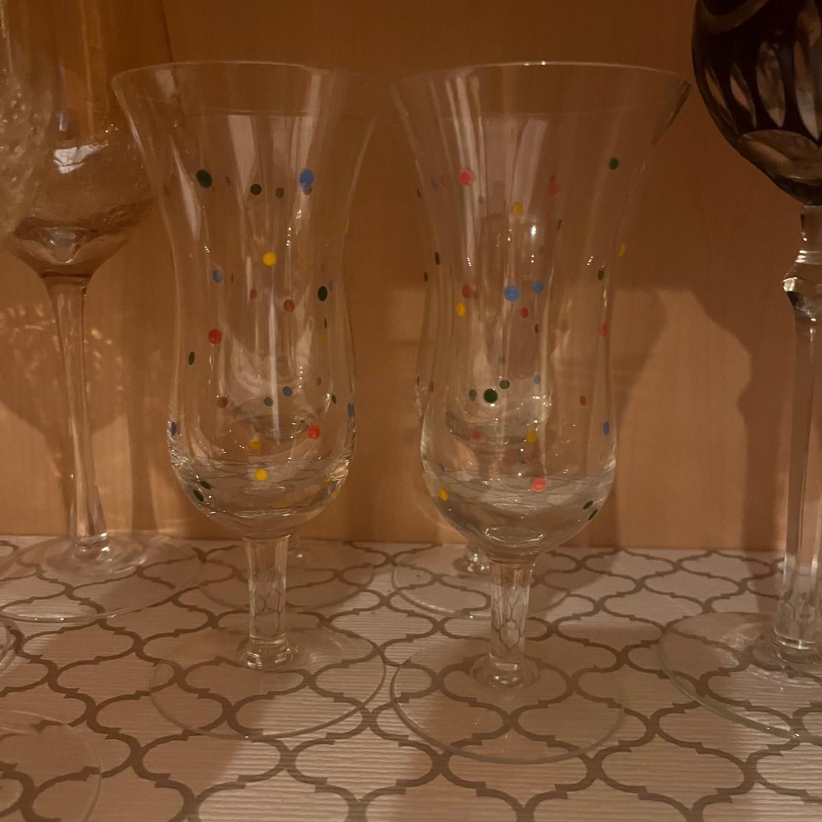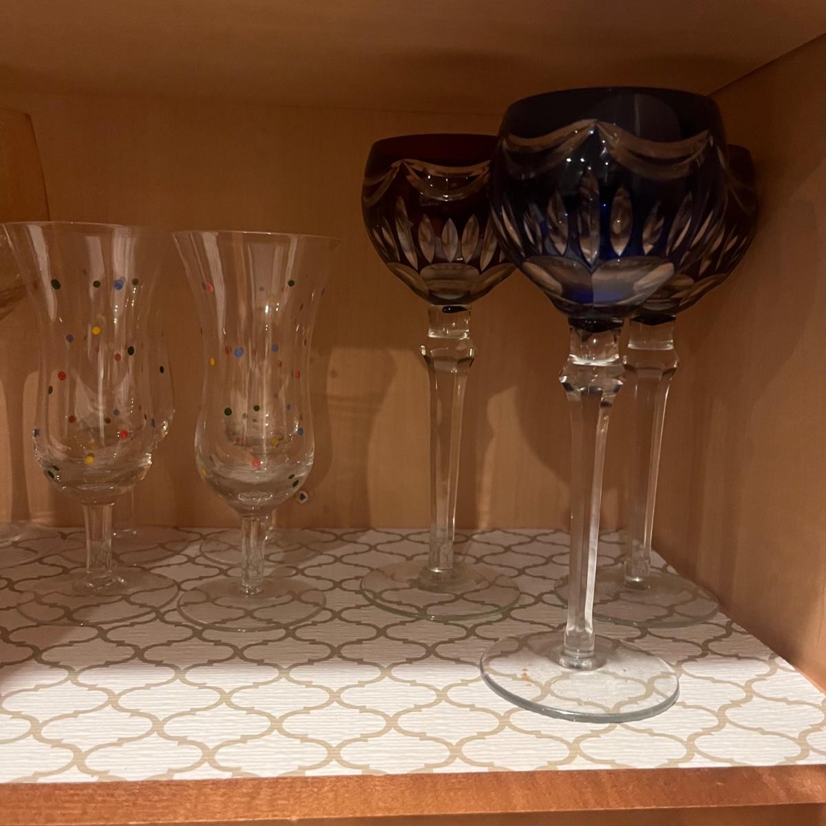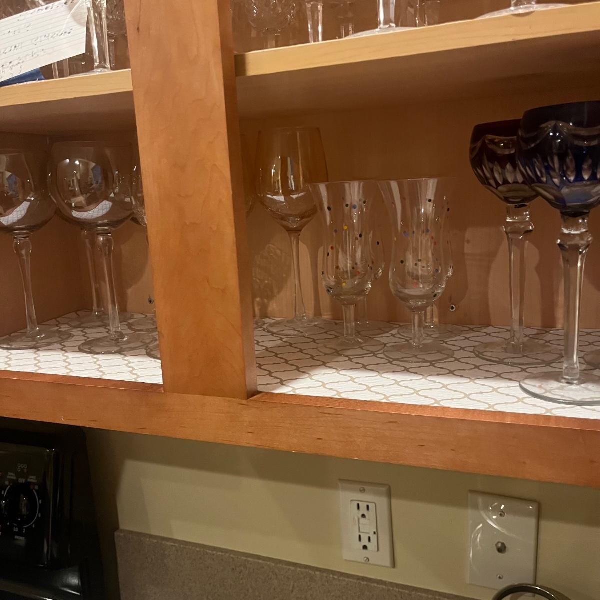 Lot contains a selection of four different styles of wine glasses that includes two sets of four and two sets of three. Tallest glass measures 9”H.
