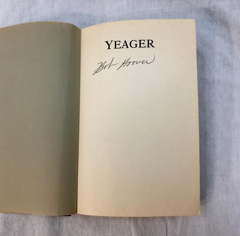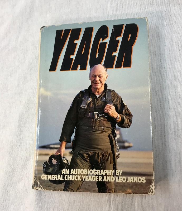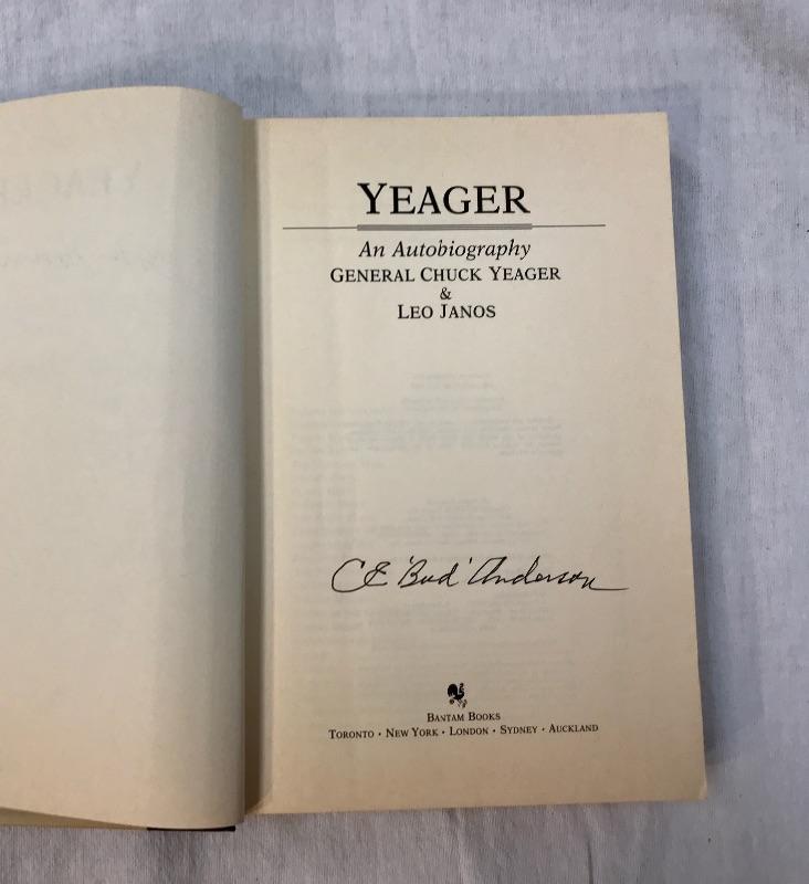 Yeager an autobiography about the late General Chuck Yeager. Signed by Bob Hoover and CE Bud Anderson. Hard back copy, in good condition. Dust jacket has some wear along edges and corners. Published July 1985