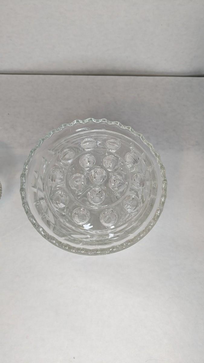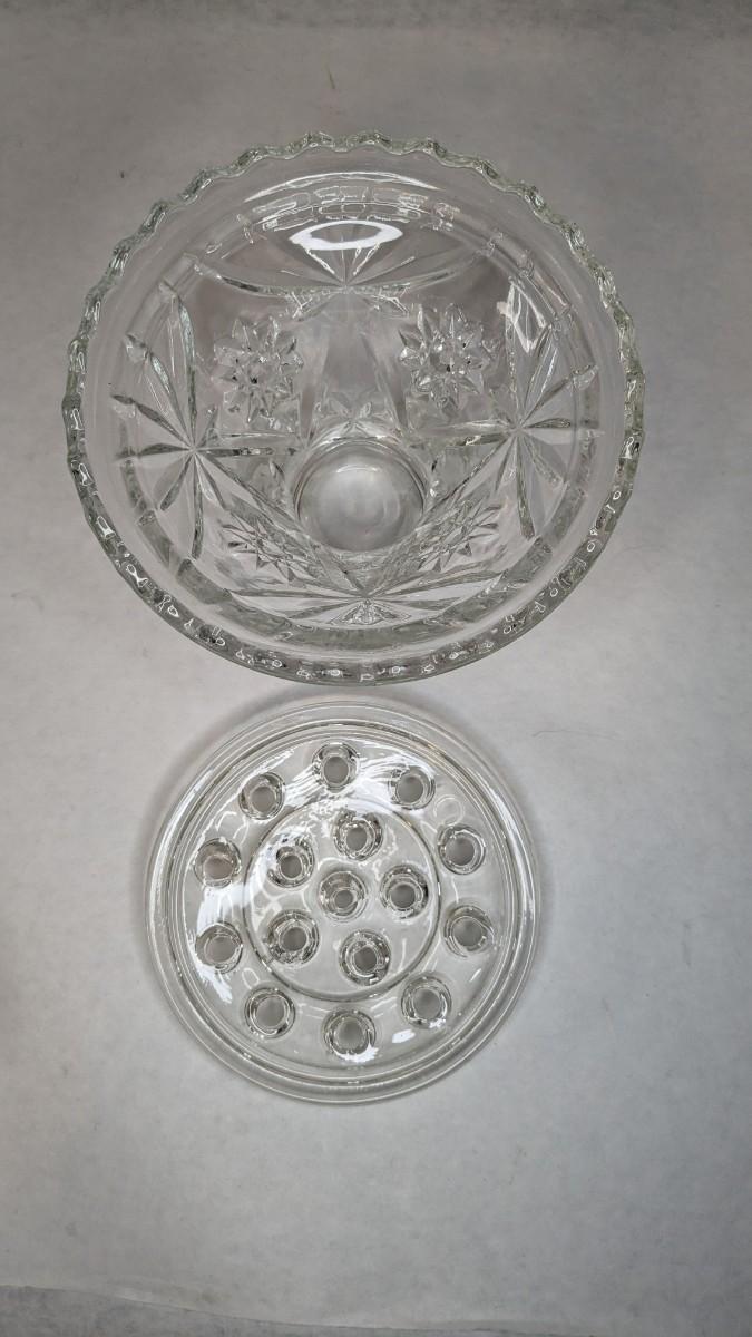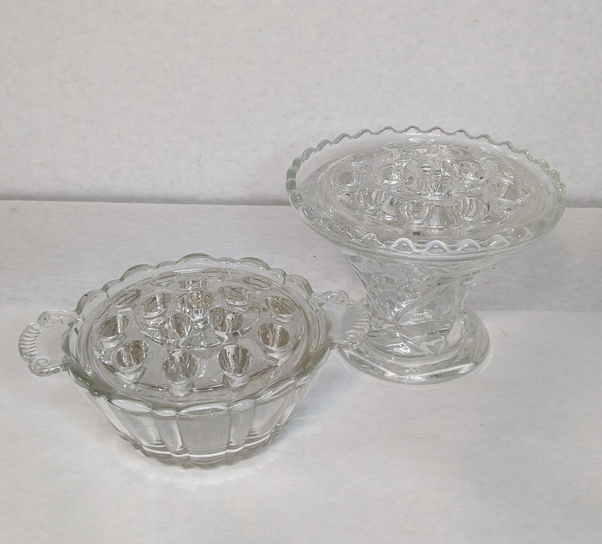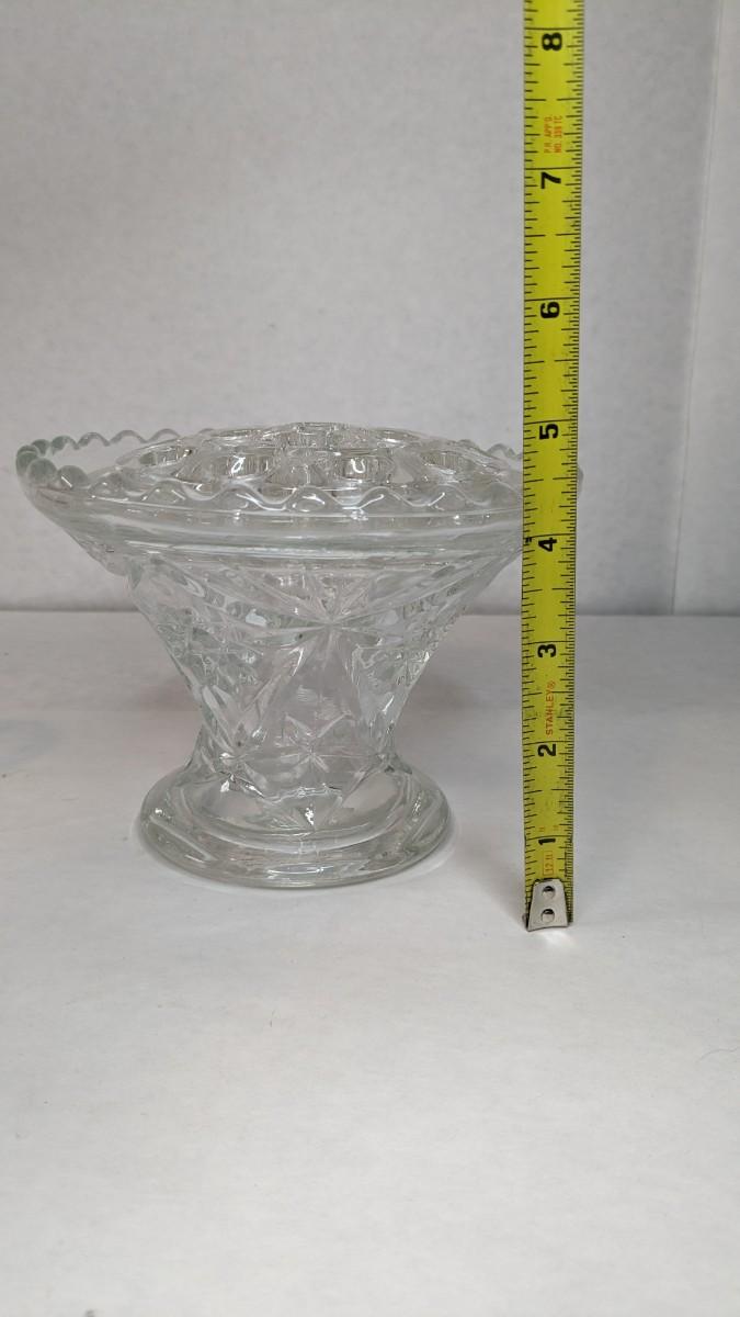 2 incredible cut glass self watering flower holders. Includes 6"x4.5" 16 opening vase style piece with scalloped edge and 7 1/8"x 3" 16 opening basket style display. Both are in excellent condition for age and hard to find in this style!