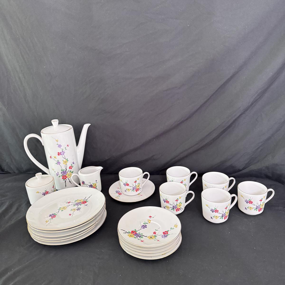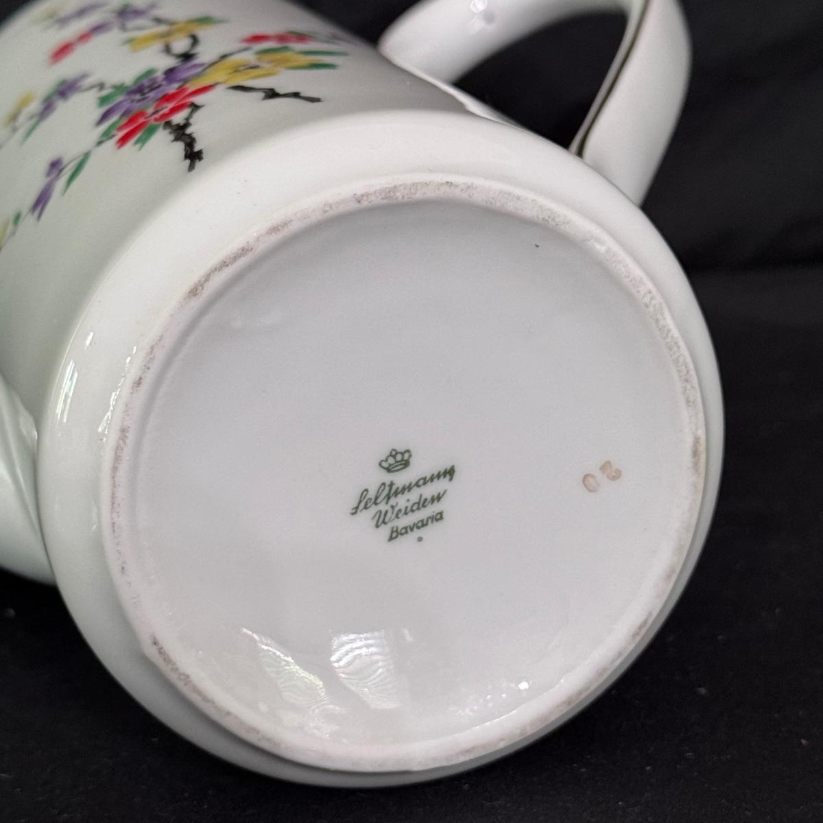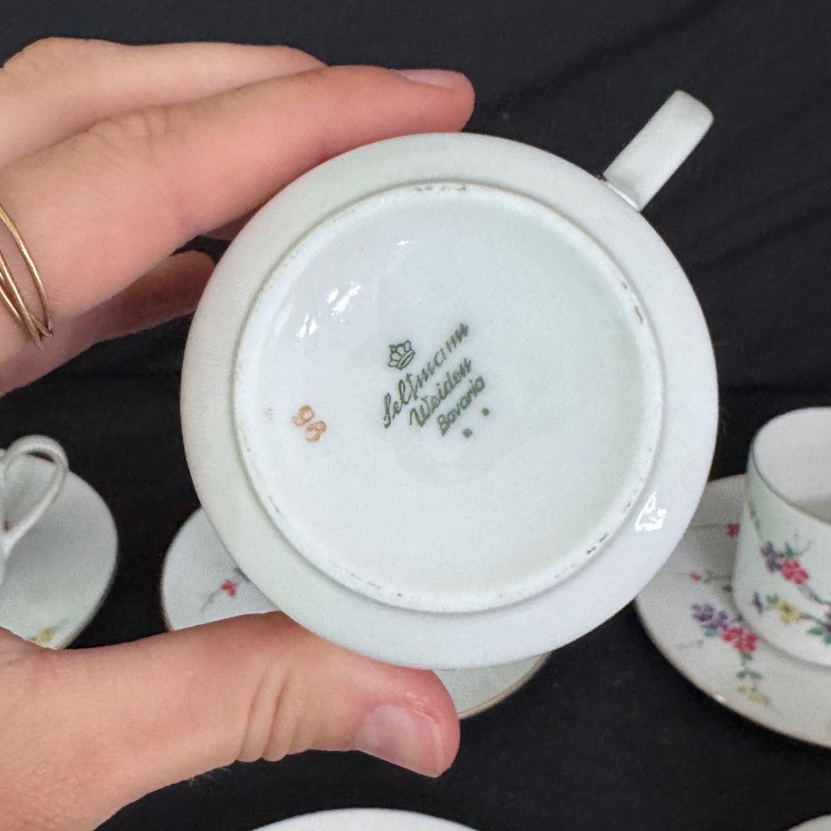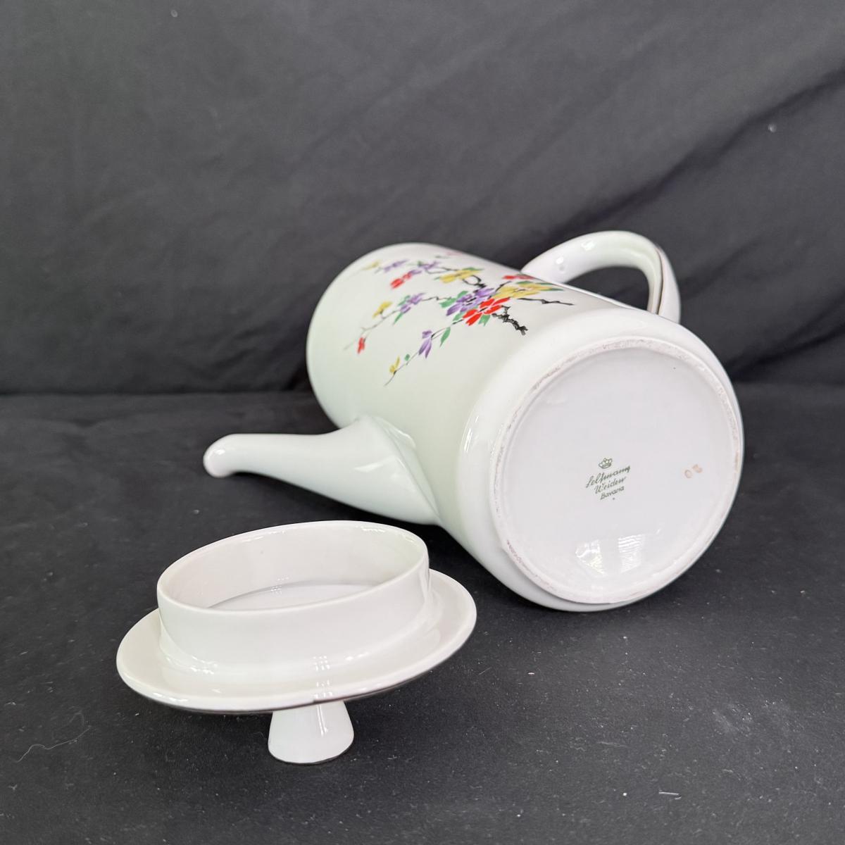 This lot of porcelain Seltmann Weiden Bavarian China includes one tall teapot with lid, a creamer with handle, a sugar jar with lid, six saucers, six tea cups, and six dessert plates. The teapot is the largest item that measures 8” x 4” x 9”H. Shipping available.