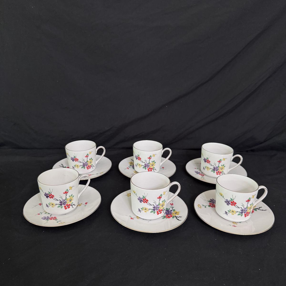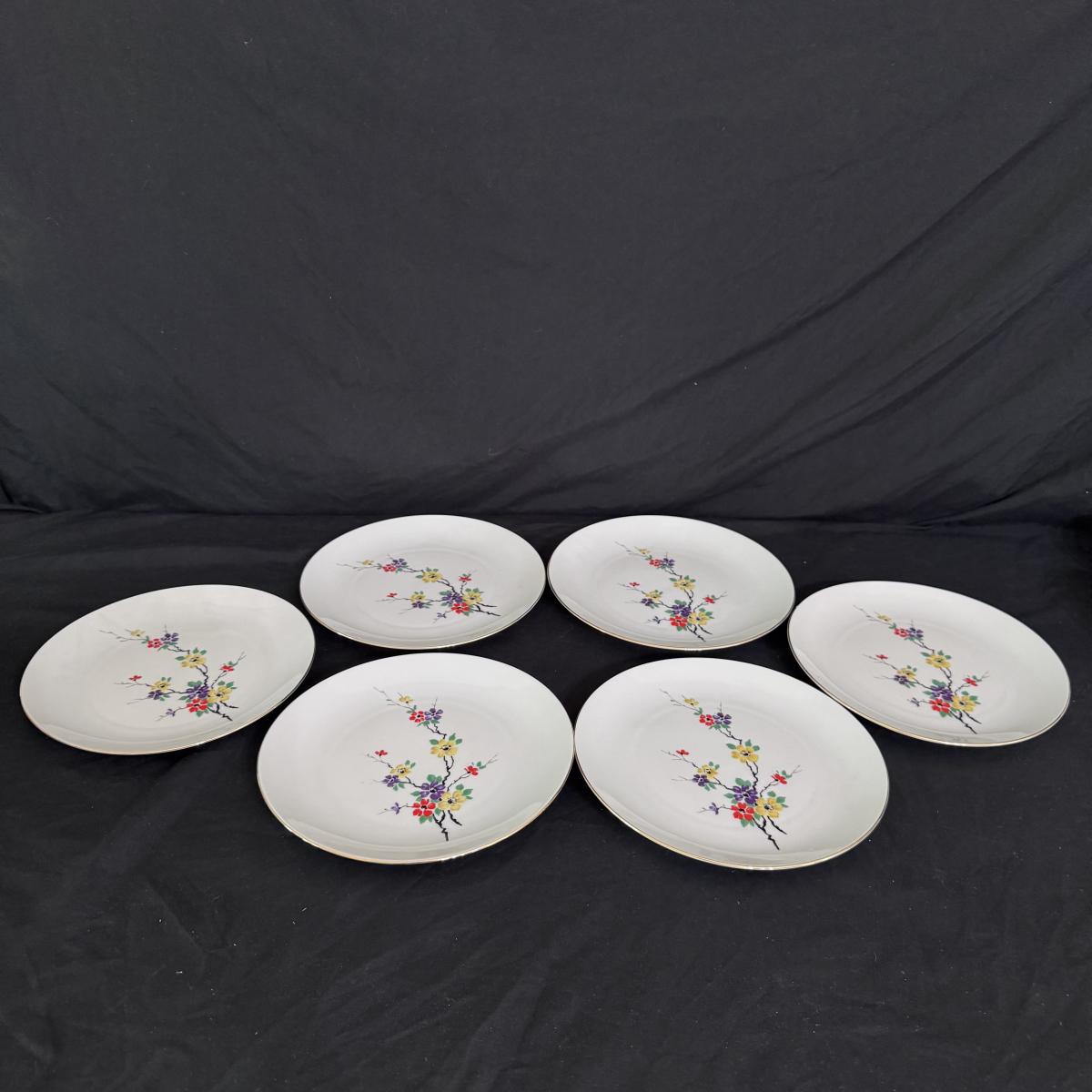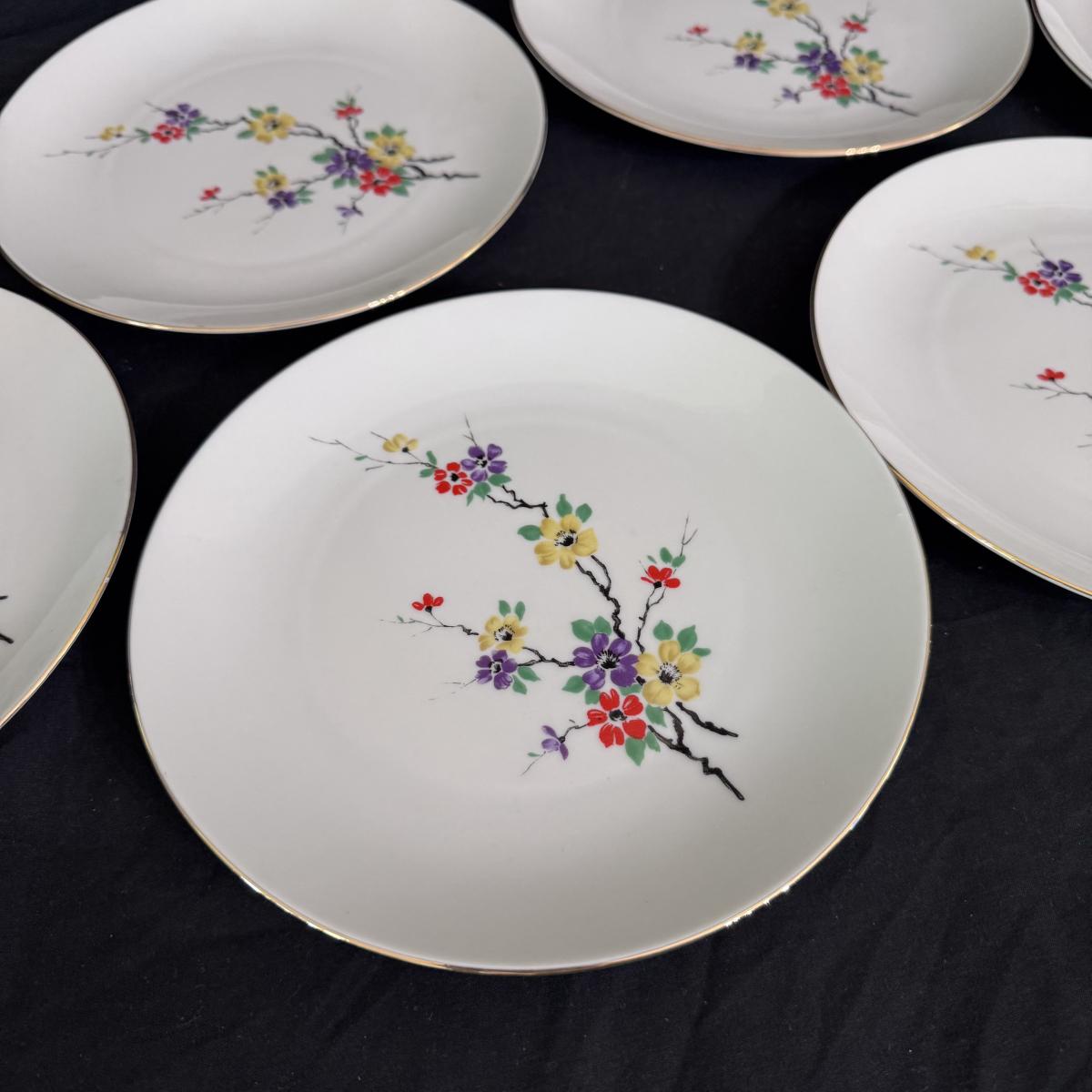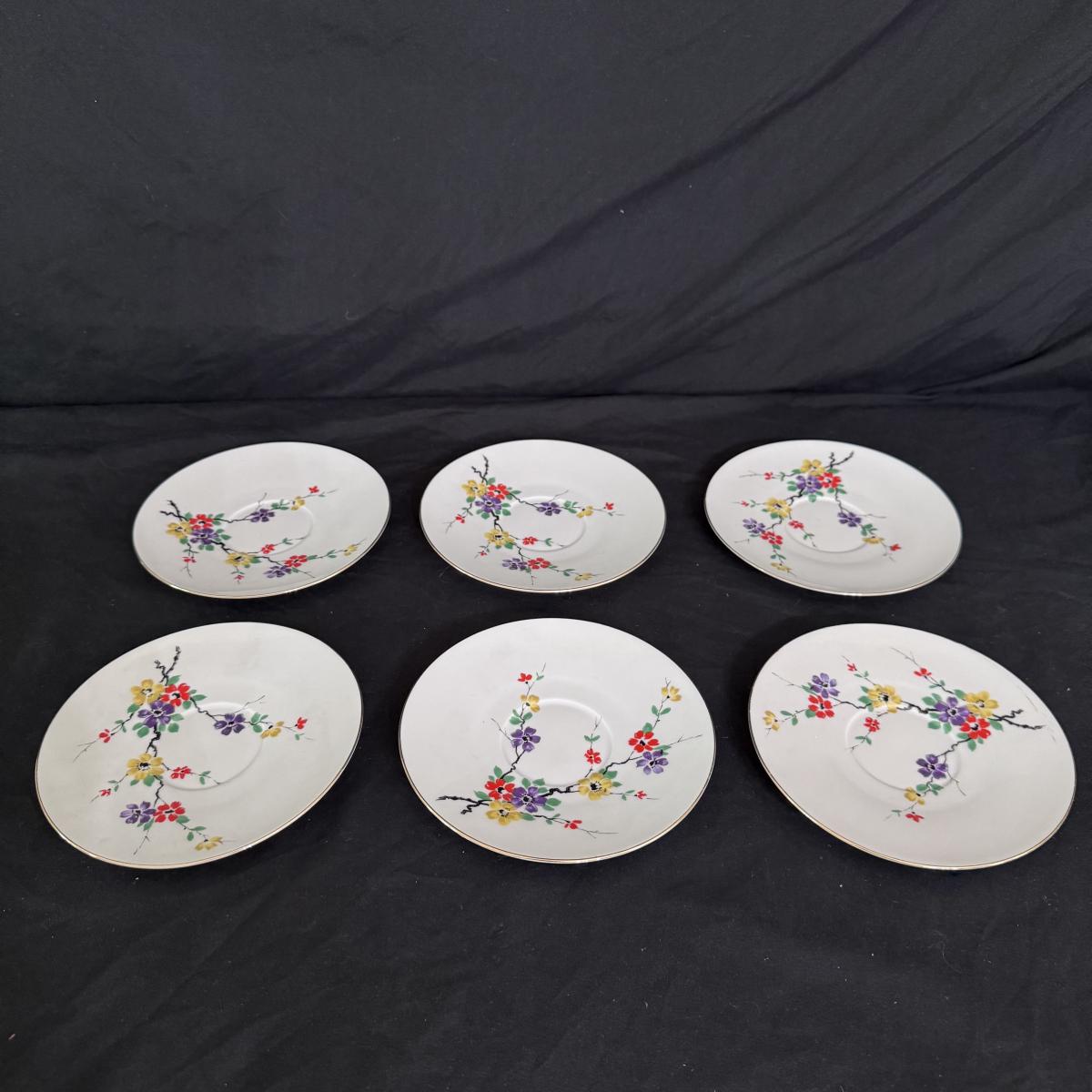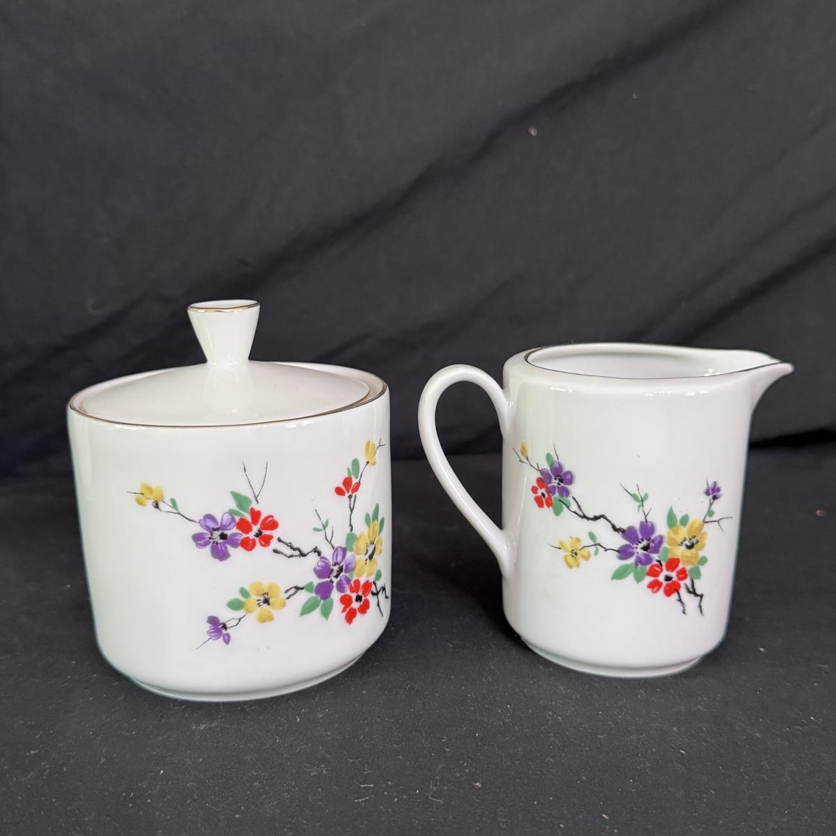 This lot of porcelain Seltmann Weiden Bavarian China includes one tall teapot with lid, a creamer with handle, a sugar jar with lid, six saucers, six tea cups, and six dessert plates. The teapot is the largest item that measures 8” x 4” x 9”H. Shipping available.