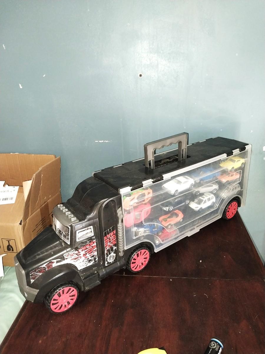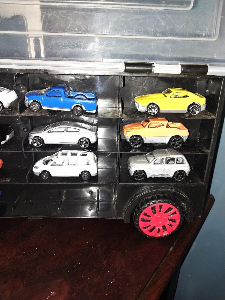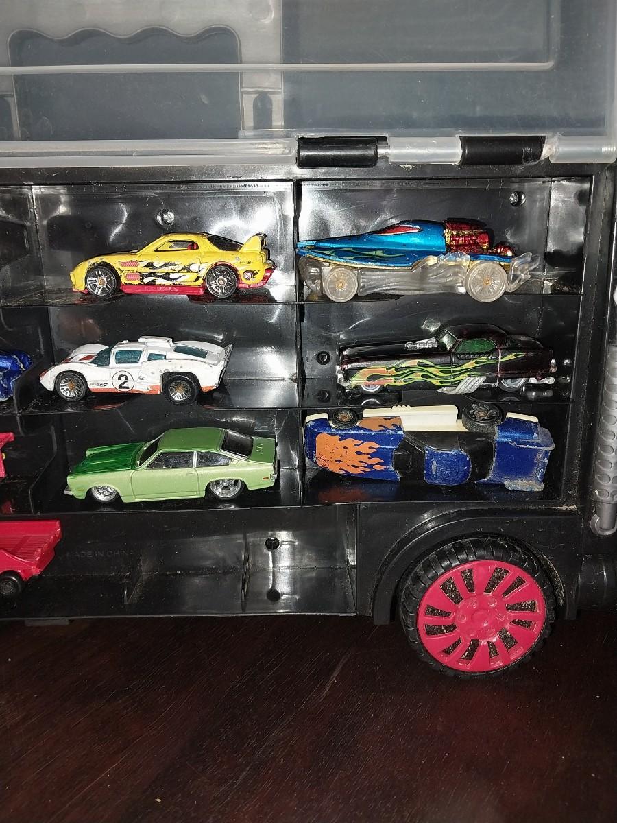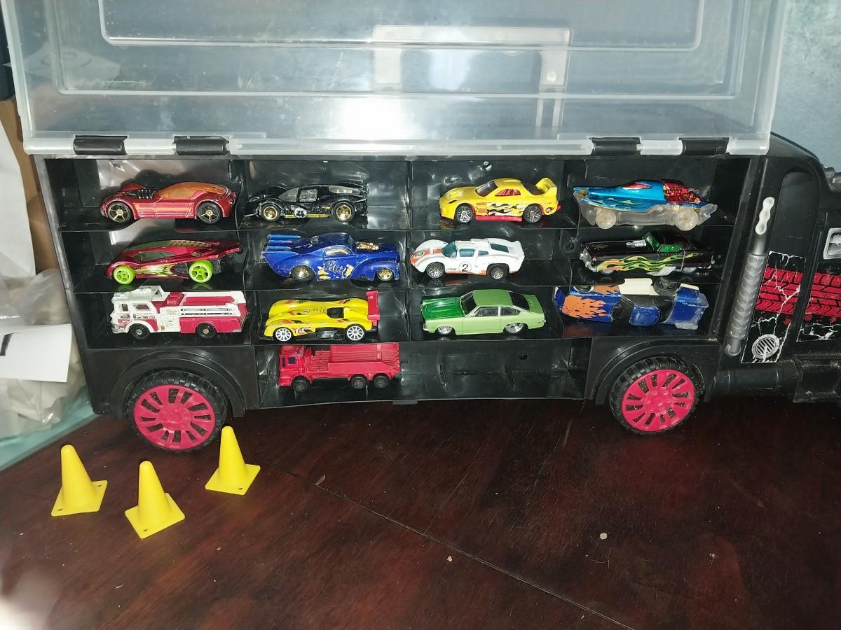 SEMI TRUCK CAR HOLDER FILLED WITH HOTWHEELS/MATCHBOX CARS ON BOTH SIDES