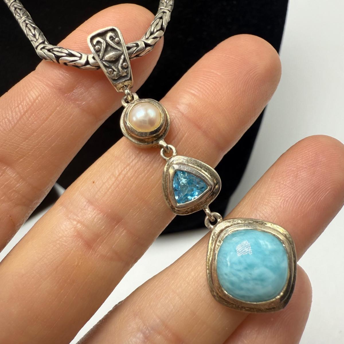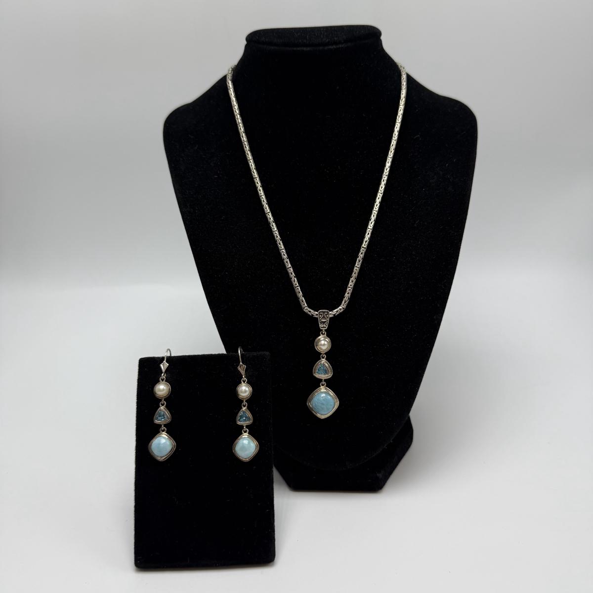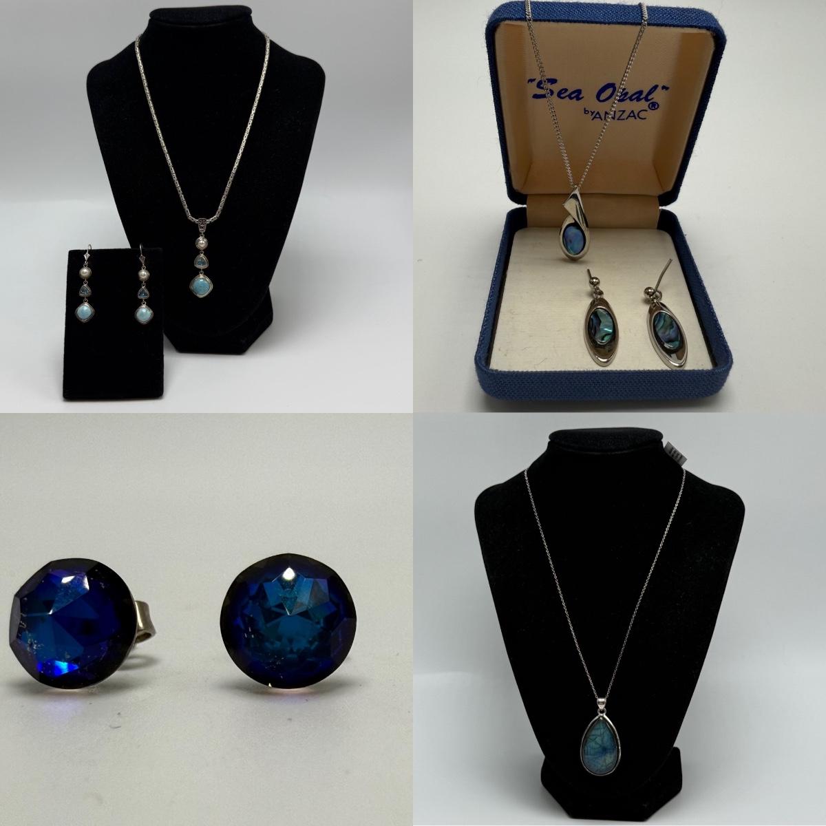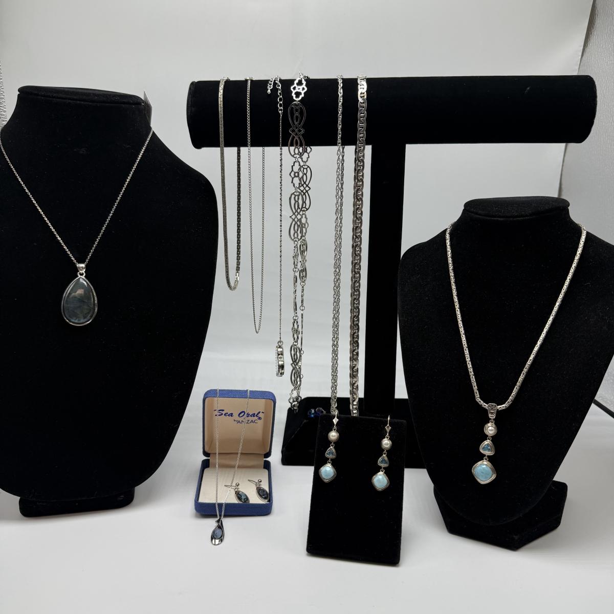 In this beautiful collection there are two jewelry sets featuring a necklace and pair of earrings with semi-precious stones. One has stones that appear to be larimar, blue topaz, and pearl (we cannot verify the stones). The other set comes in a box labeled “Sea Opal by Anzac”. No backs are included with these earrings. Also included is a necklace with a pendant labeled as labradorite. Six additional necklaces plus a pair of post earrings are included as well. Multiple items are marked 925. Please see photos for all markings and details. The longest necklace is the mariner link chain necklace which is 24“ long.