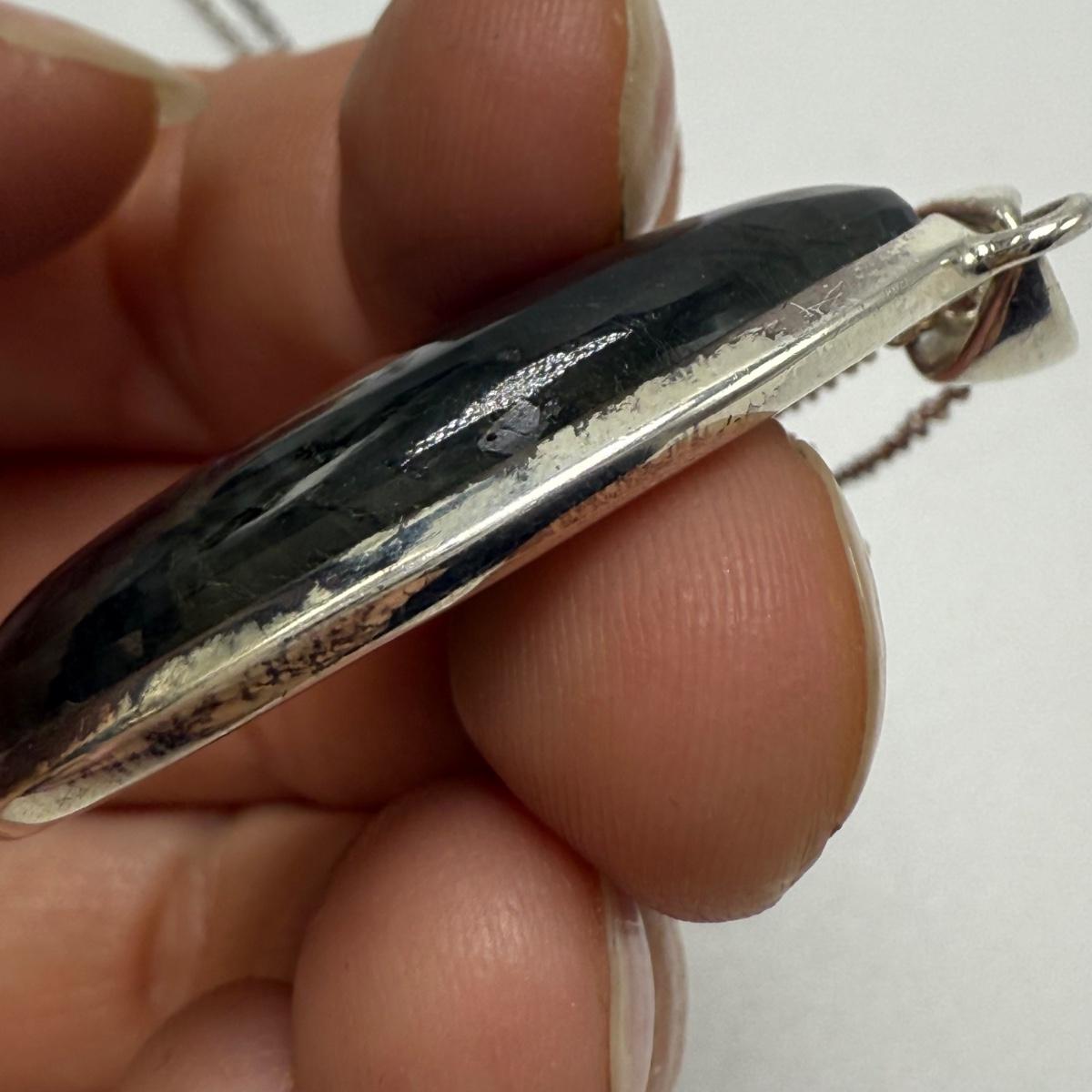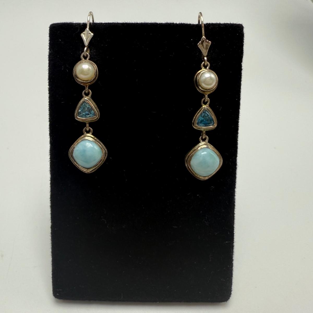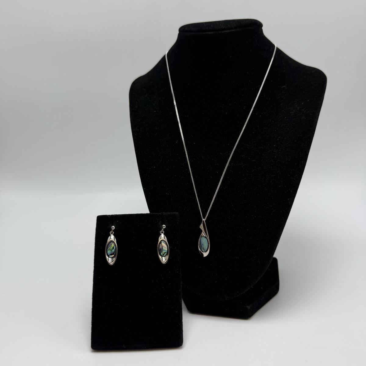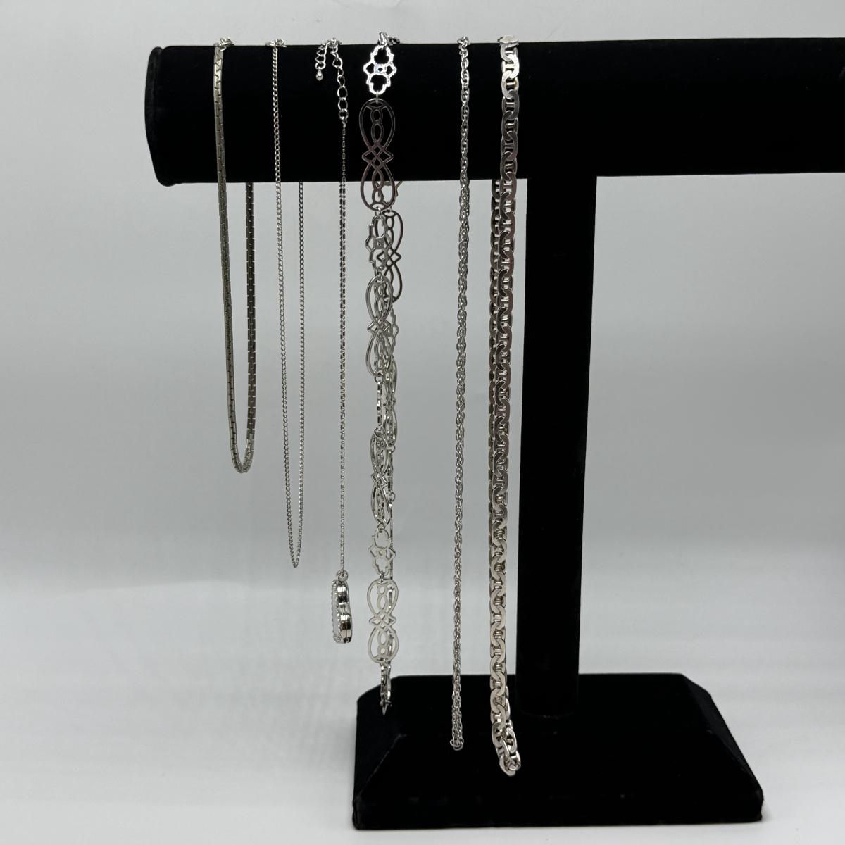 In this beautiful collection there are two jewelry sets featuring a necklace and pair of earrings with semi-precious stones. One has stones that appear to be larimar, blue topaz, and pearl (we cannot verify the stones). The other set comes in a box labeled “Sea Opal by Anzac”. No backs are included with these earrings. Also included is a necklace with a pendant labeled as labradorite. Six additional necklaces plus a pair of post earrings are included as well. Multiple items are marked 925. Please see photos for all markings and details. The longest necklace is the mariner link chain necklace which is 24“ long.