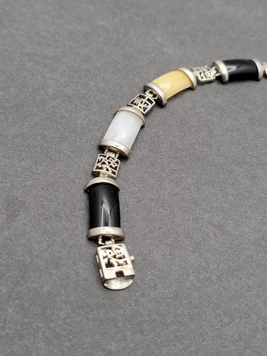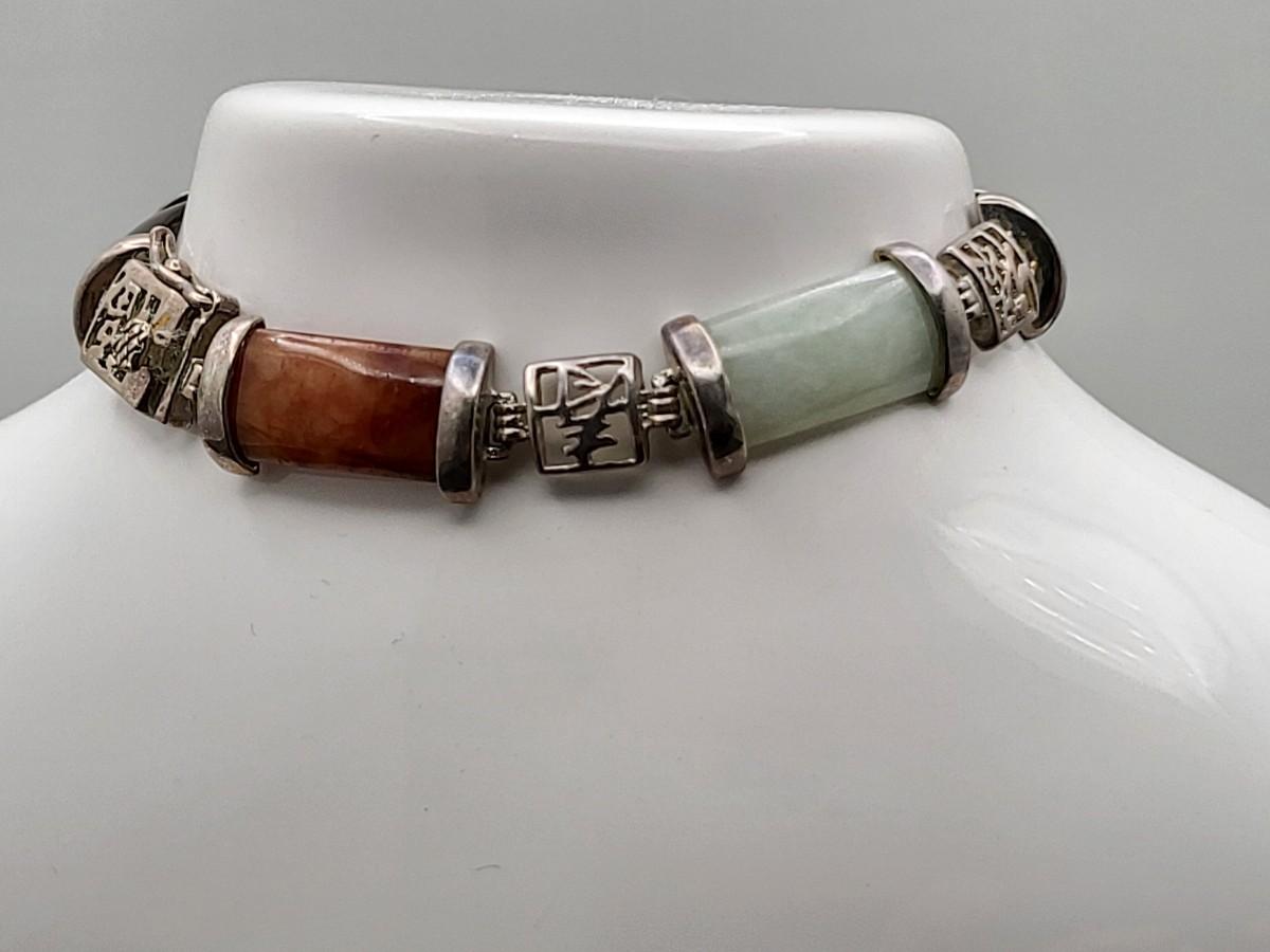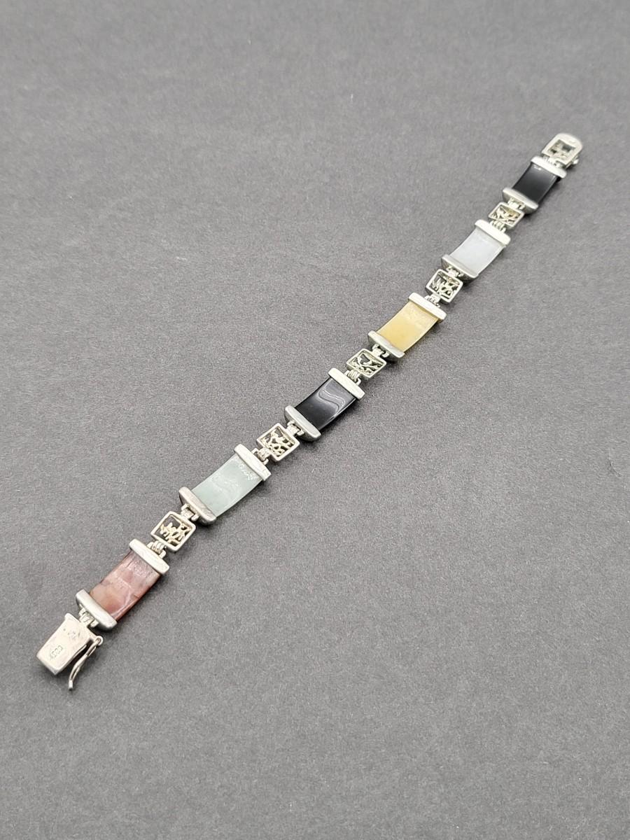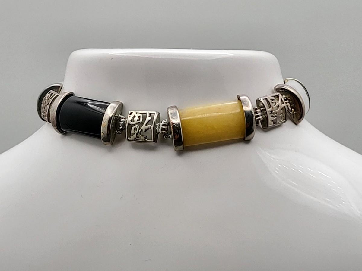 Asian inspired colored quartz & black onyx stone, stamped 925 bracelet, measures 7". Push clasp. Total weight is 17.6 grams.