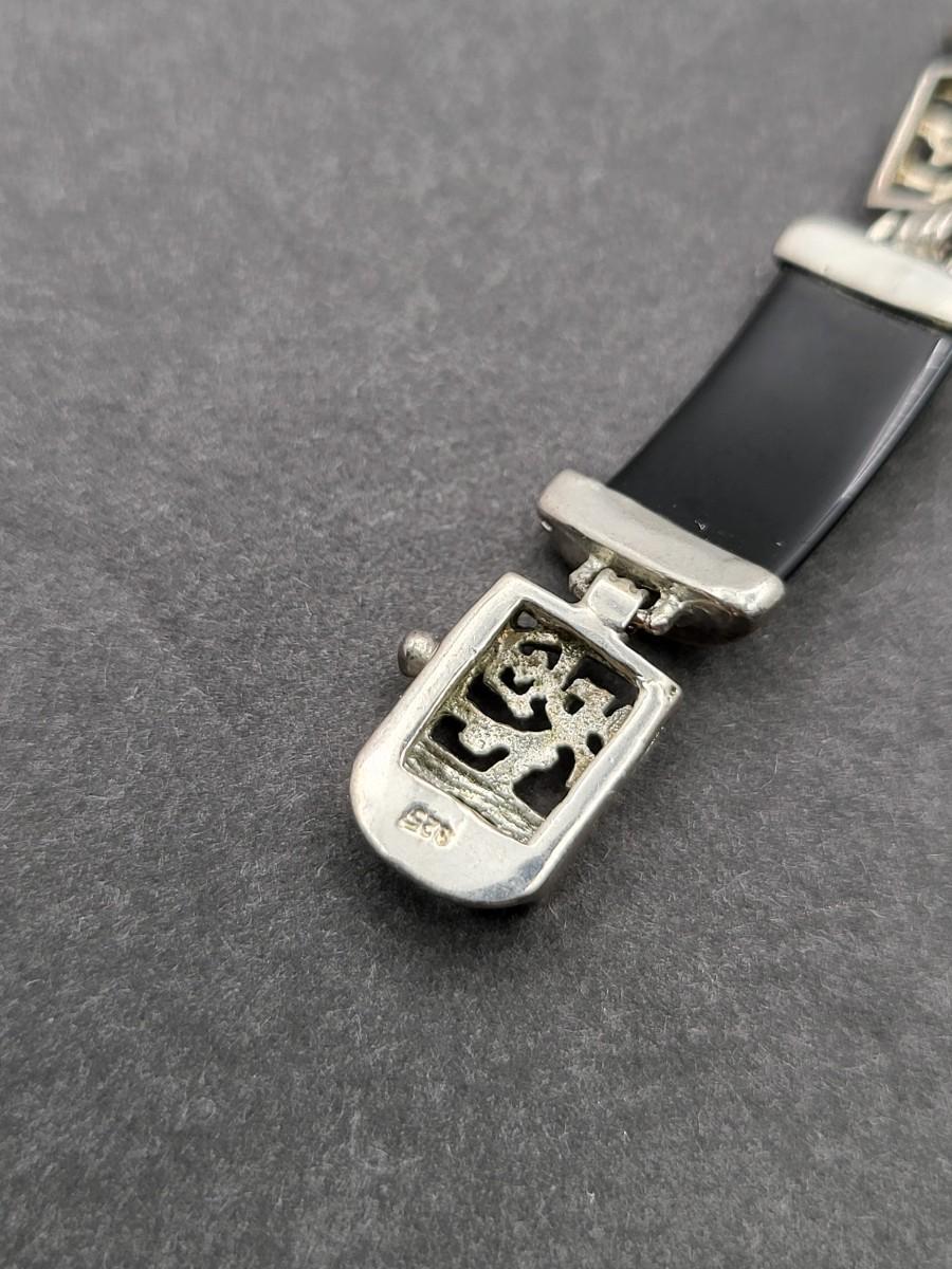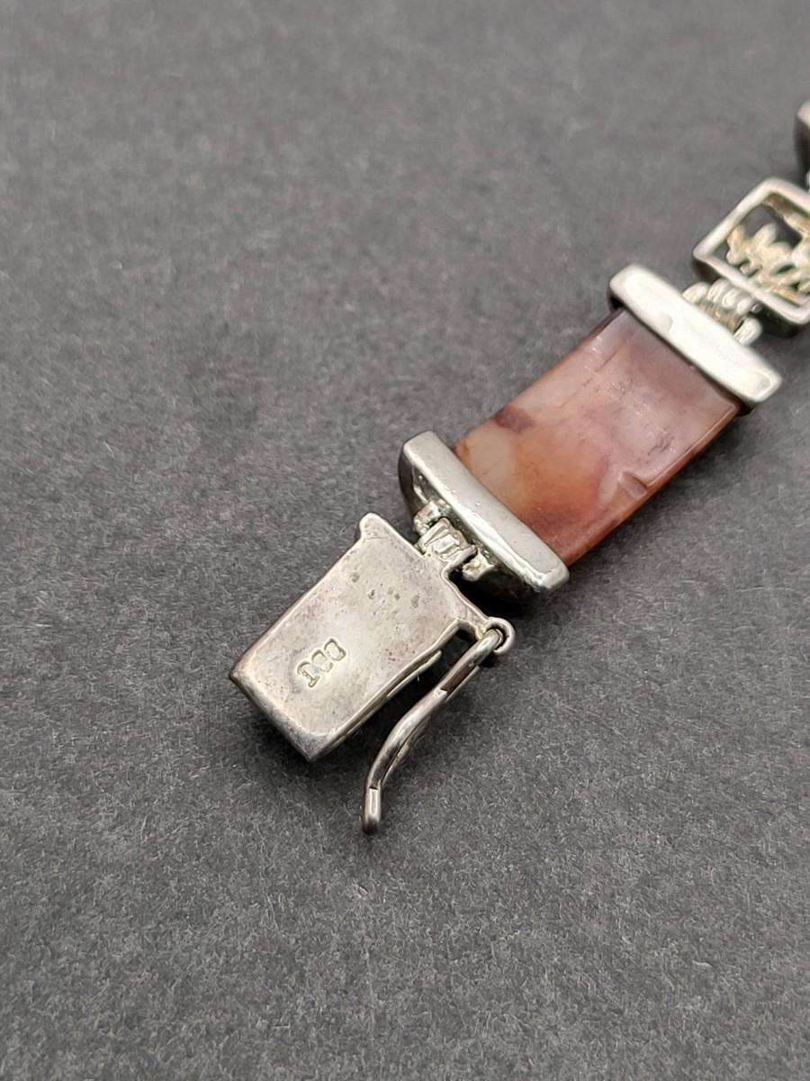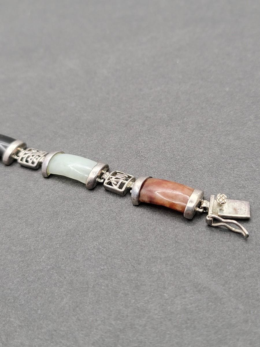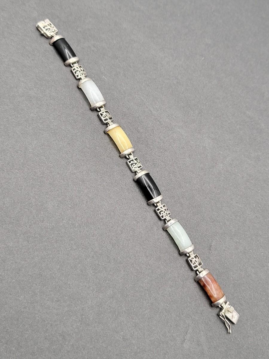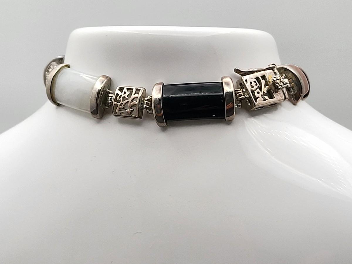 Asian inspired colored quartz & black onyx stone, stamped 925 bracelet, measures 7". Push clasp. Total weight is 17.6 grams.