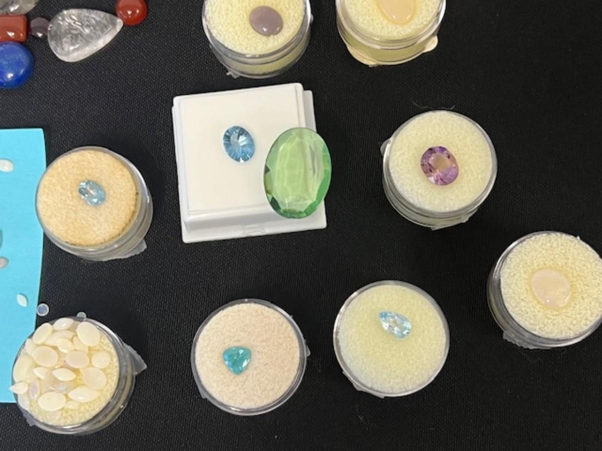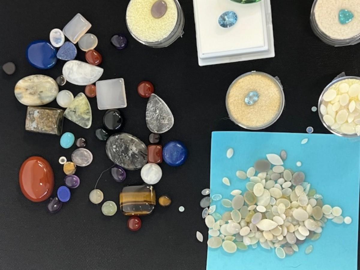 Includes blue topaz, London blue topaz, tiger's eye, jasper, lapis, amethyst, moonstone, and many more. Total of 100+ stones. [SD]