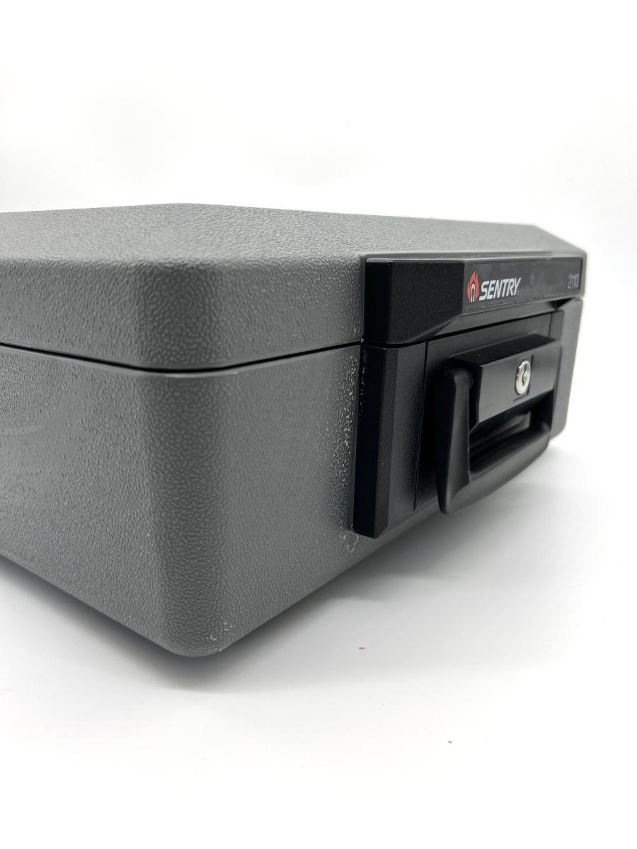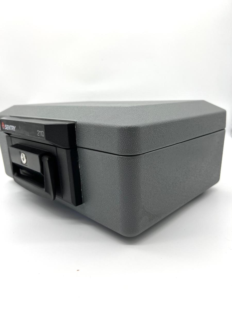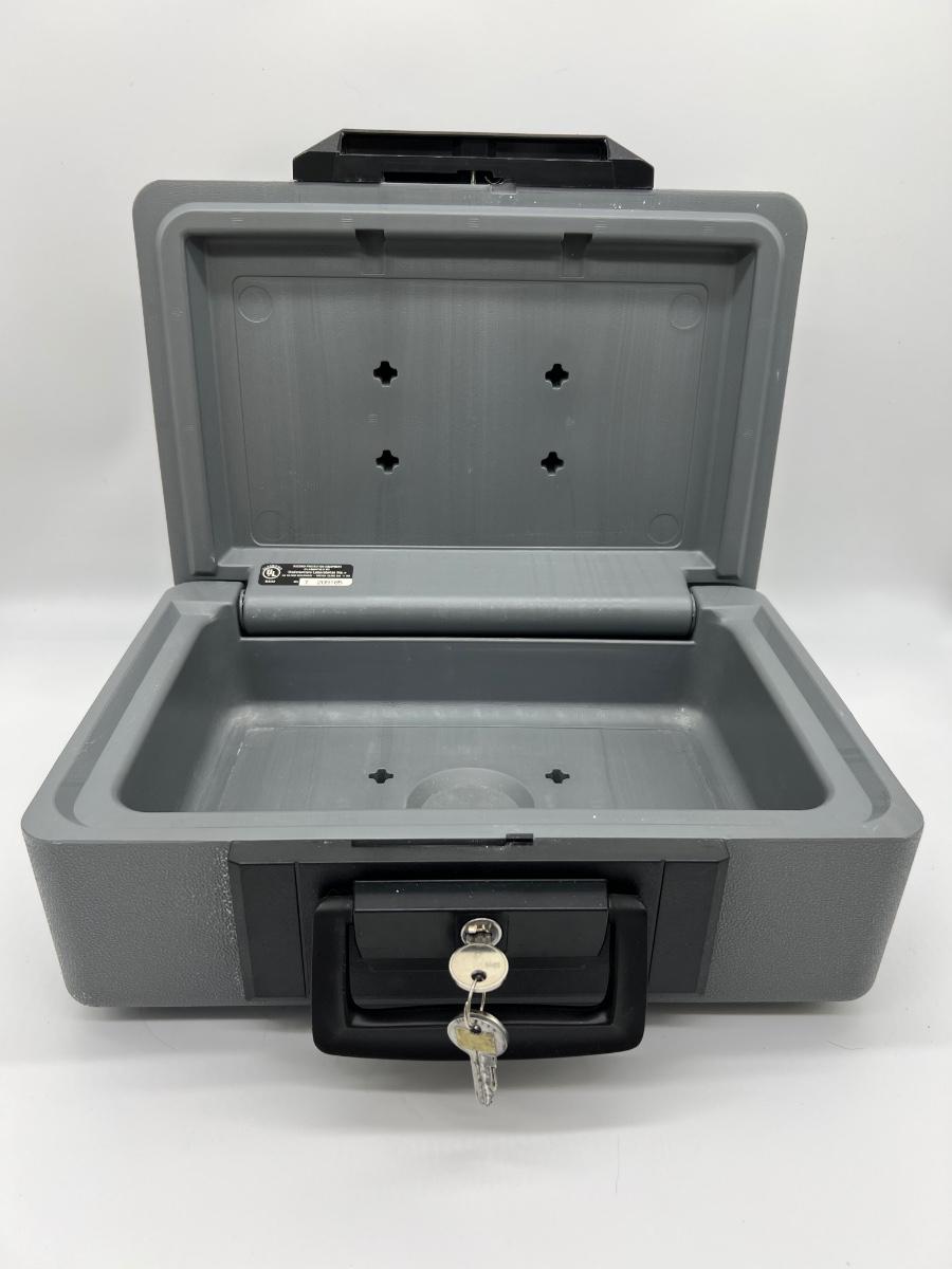 Safety Box comes with two keys measures when closed 6 inches tall 14 inches long and 11 inches deep